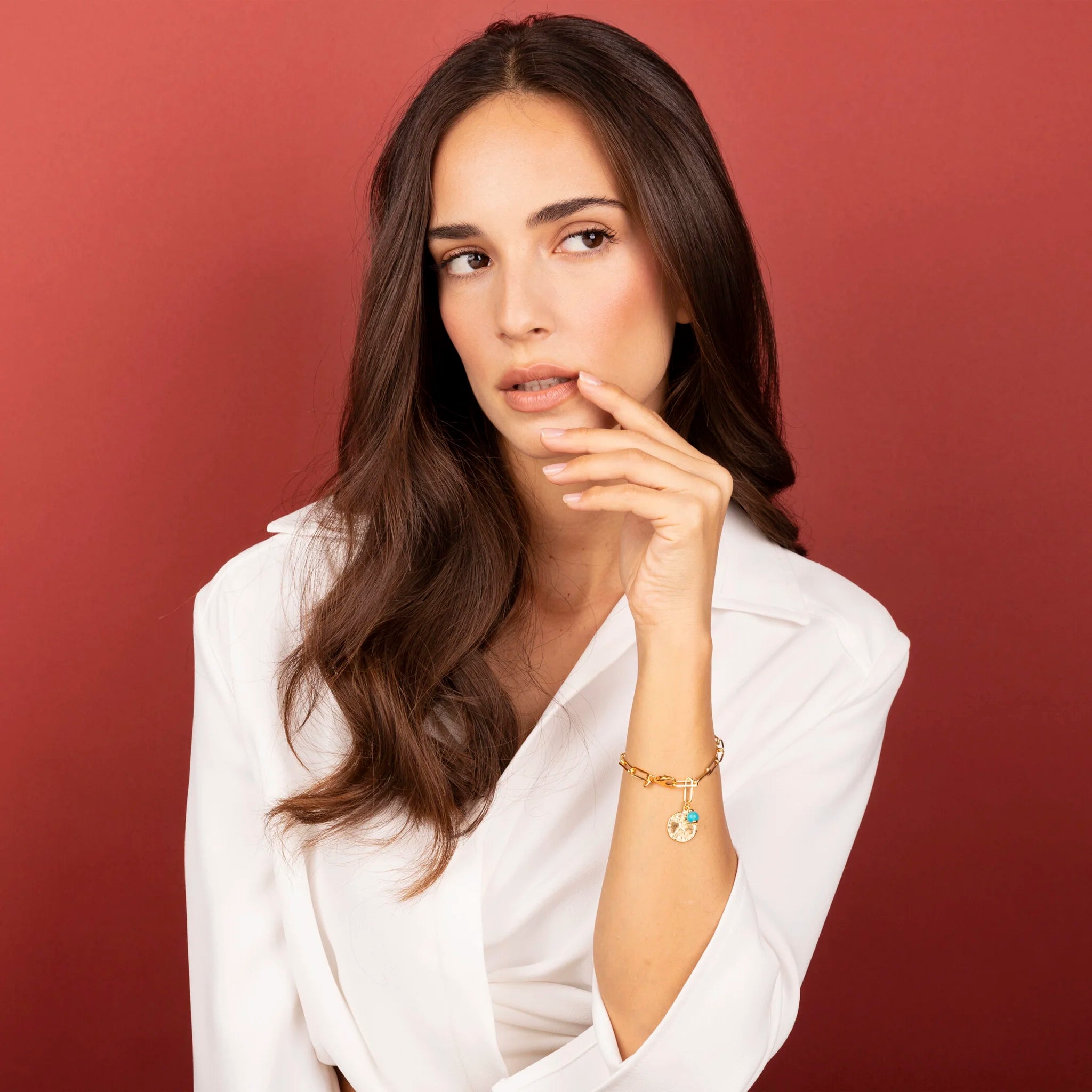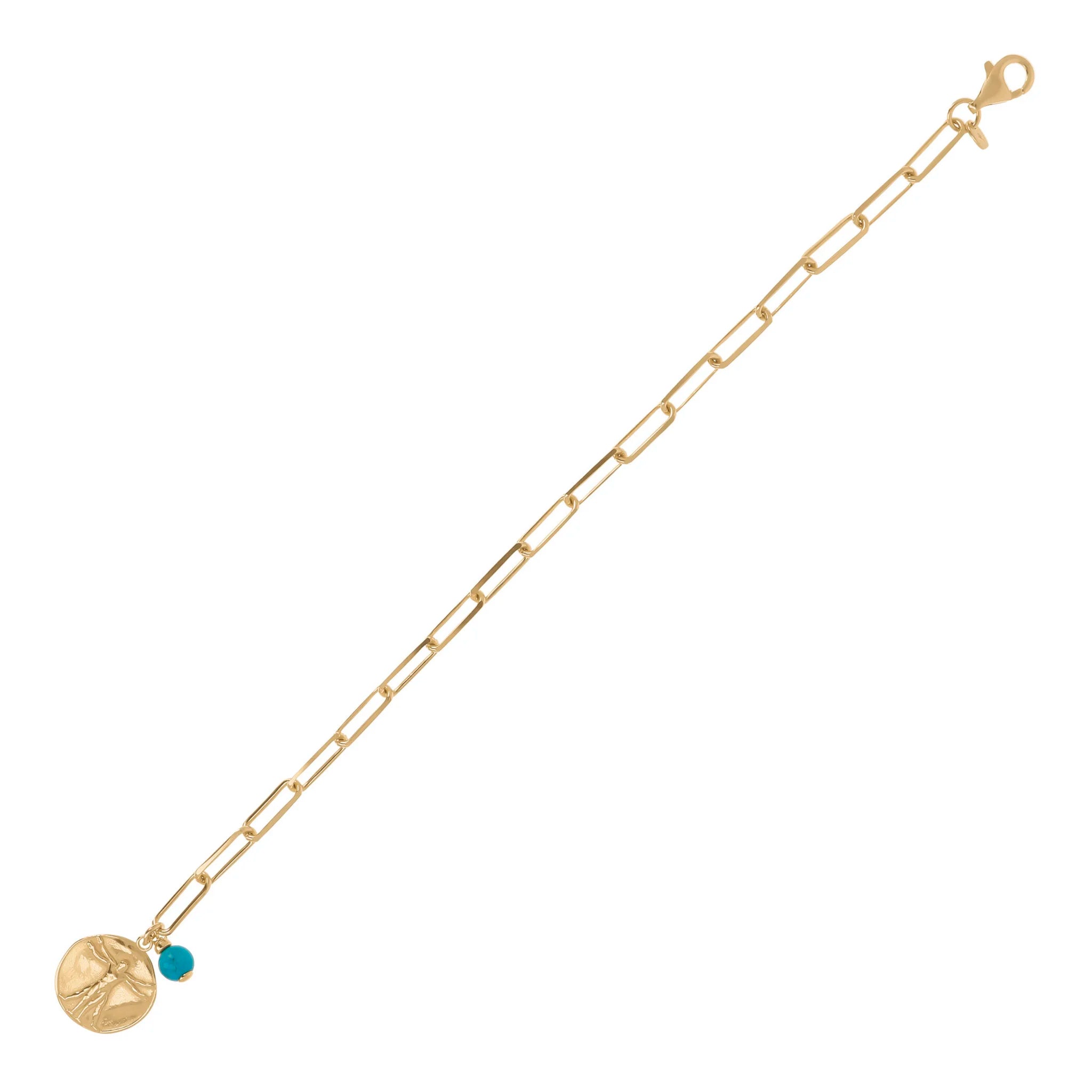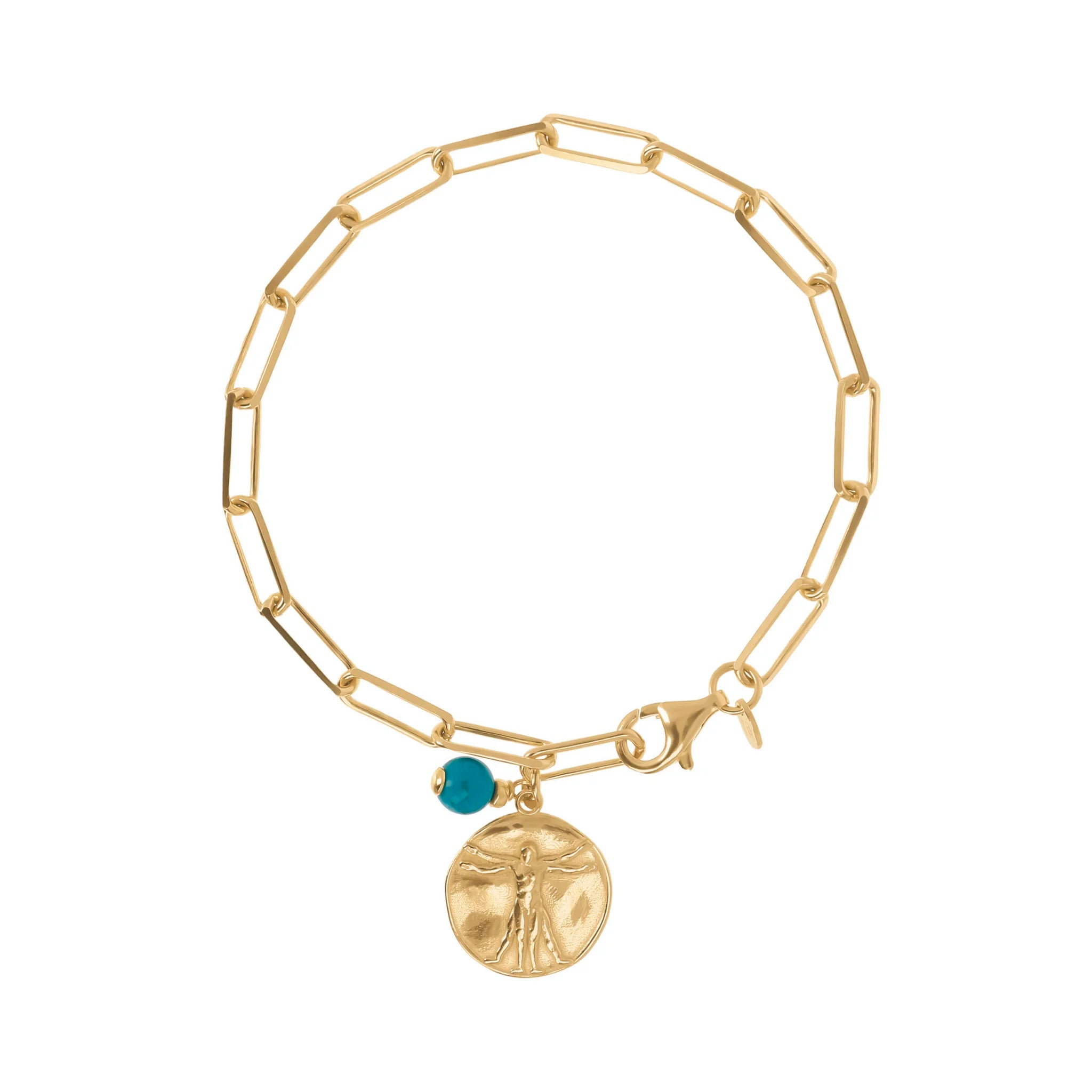 Ein rechteckiges Münzketten-Gliederarmband mit Vitruvian Man und Türkis. Das elegante Finish der Etrusca Gioielli-Linie und die umhüllende 18-Karat-Gelbgoldbeschichtung machen dieses Schmuckstück von morgens bis abends perfekt. Kombinieren Sie dieses Armband mit der passenden Halskette oder mit anderen Kreationen von Etrusca Gioielli und vervollständigen Sie Ihren Look.