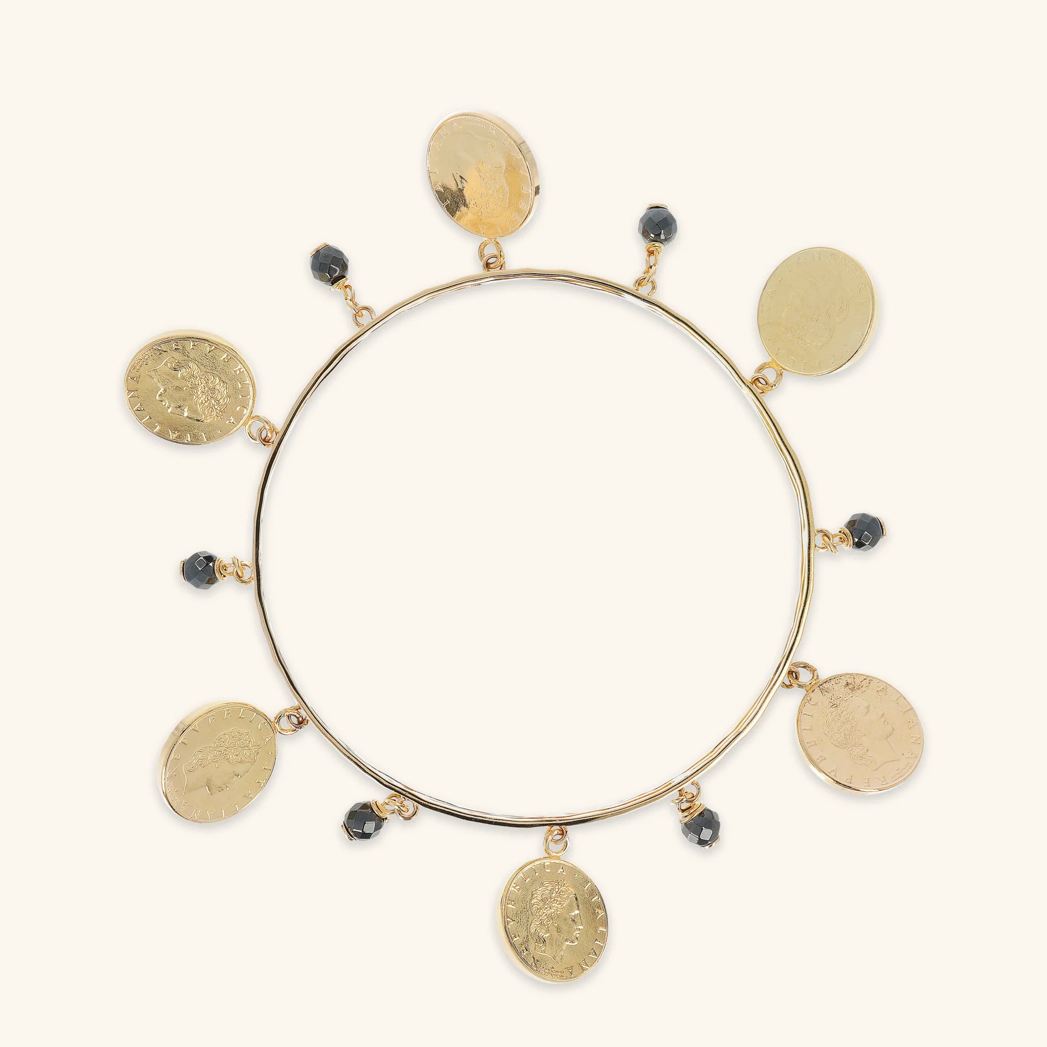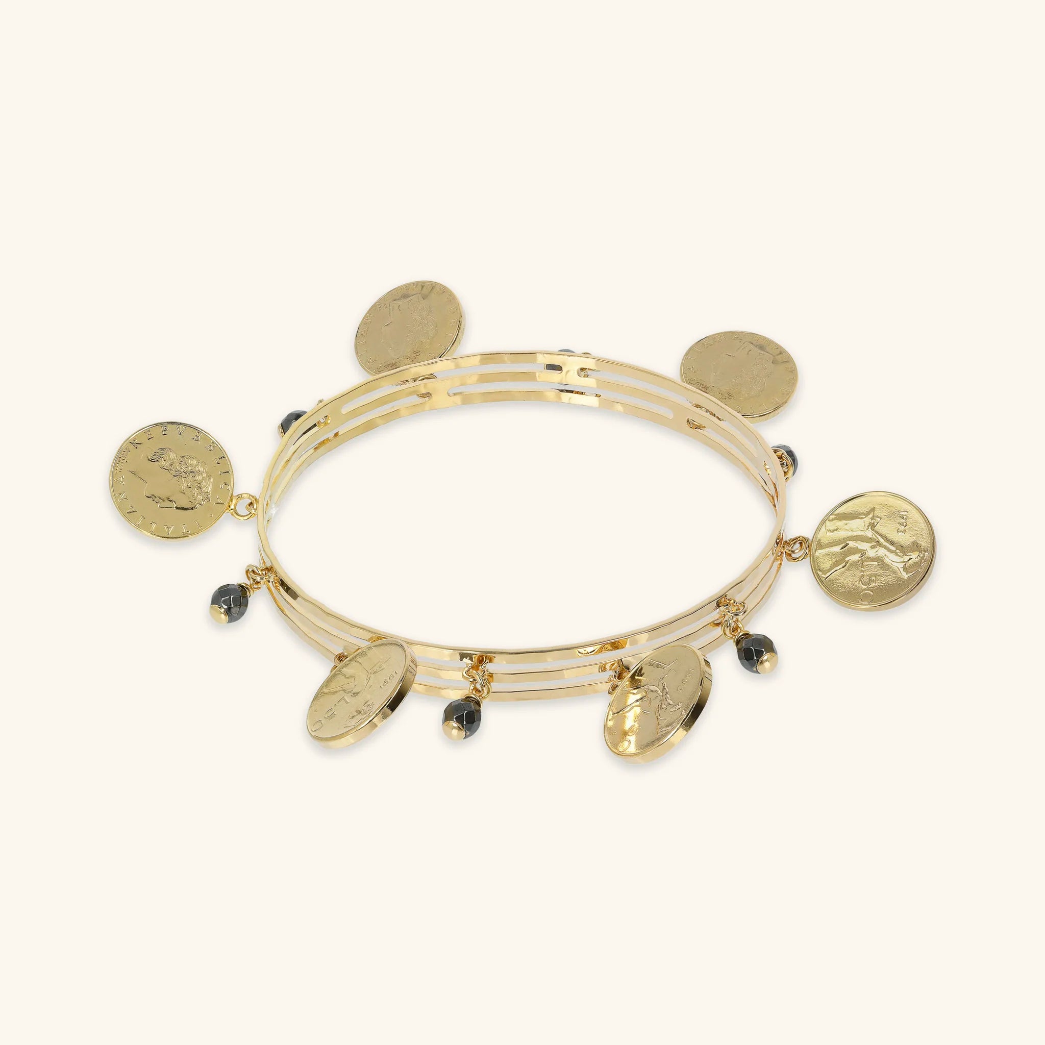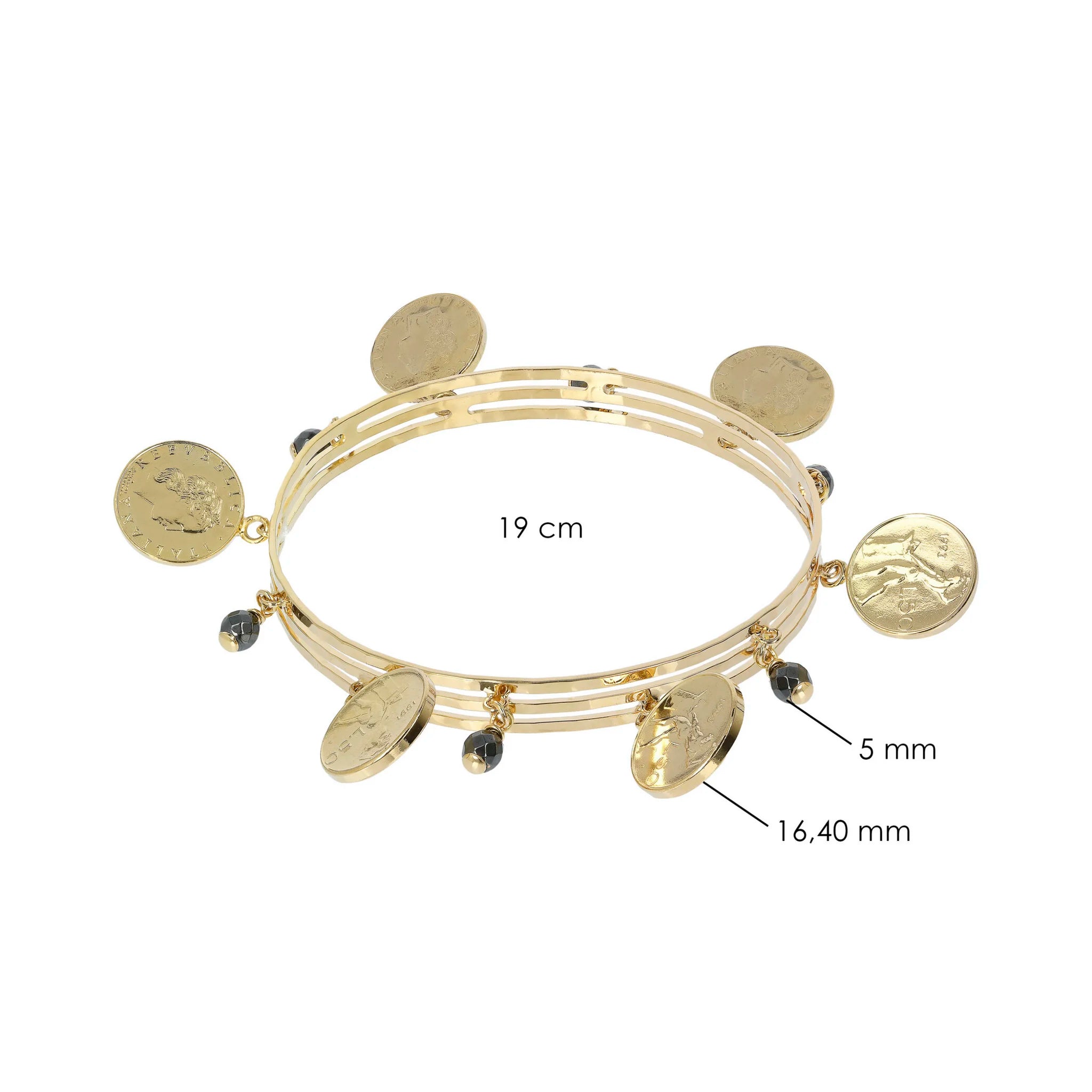 Armreif von Etrusca Gioielli, aus einer Gold-Legierung, 18 Karat Gelbgold plattiert, mit dreifachem Strang, verziert mit kleinen natürlichen Hämatitsteinen (5 mm), abwechselnd mit Münzen (15 mm).