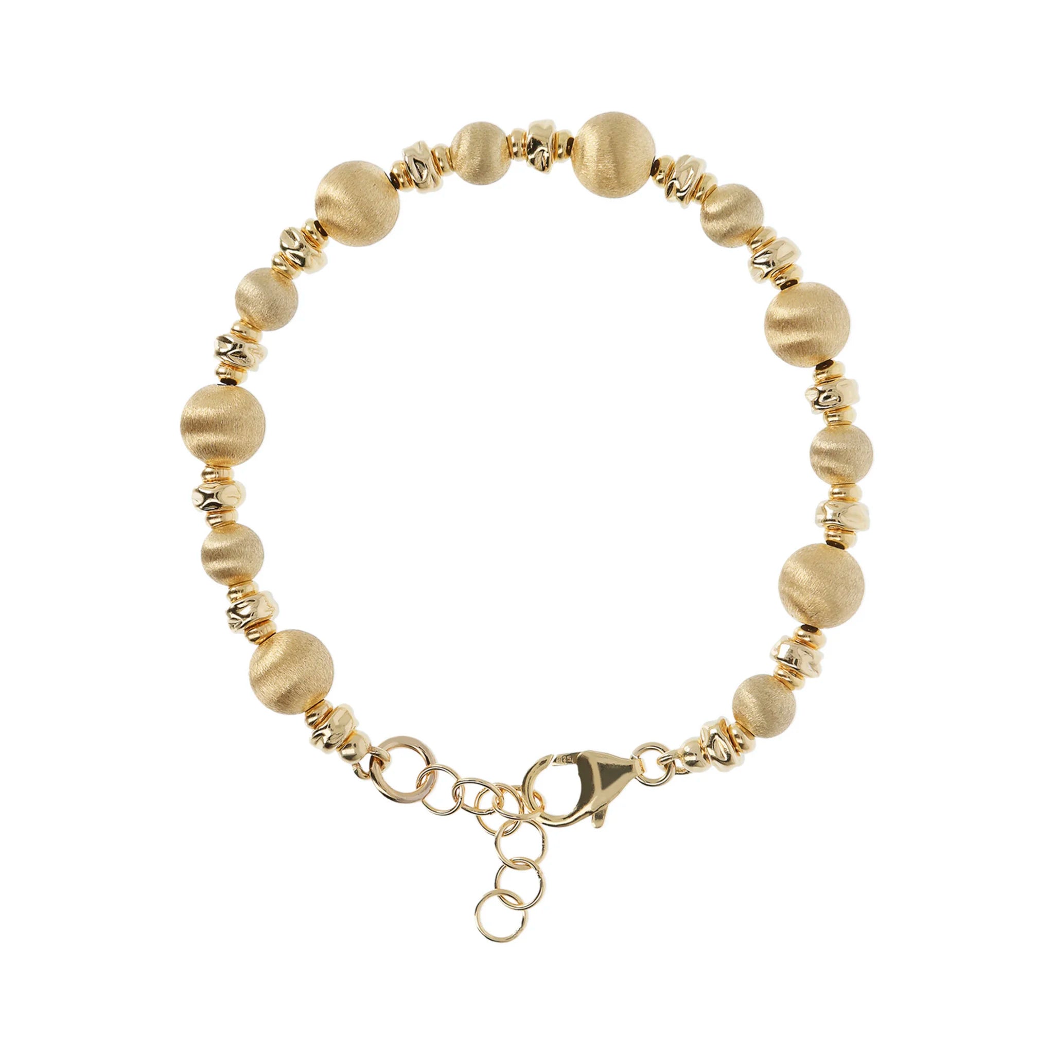 Etrusca Gioielli bracelet mounted on a Golden base, 18kt yellow gold plated, embellished with an alternation of spheres (large and small) with a satin surface and golden nuggets and washers with a shiny surface; lobster clasp with extender.