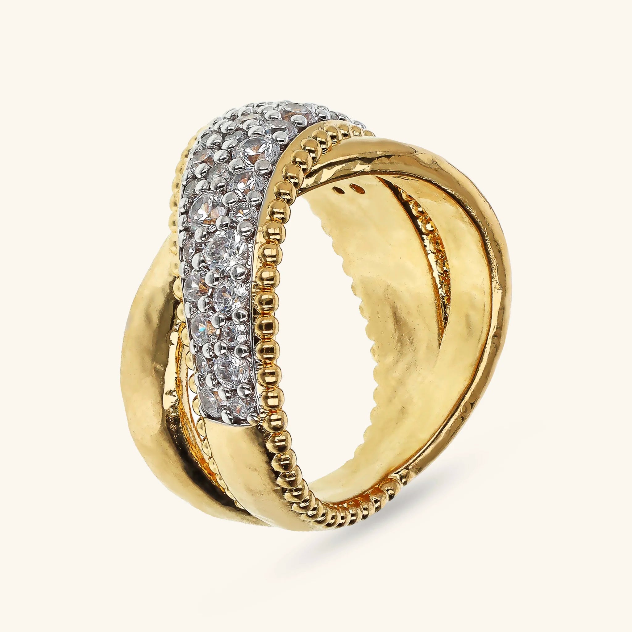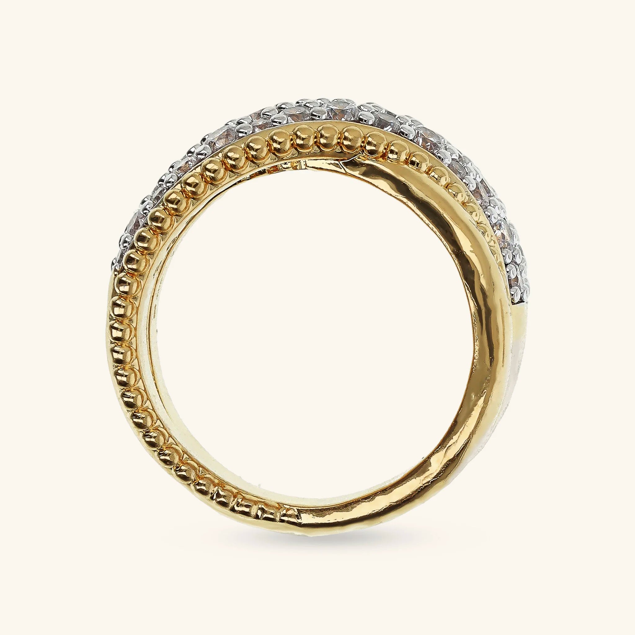 Etrusca Gioielli band ring made of Golden alloy, 18kt yellow gold plated, with cubic zirconia pavé crossing, luminous quality.