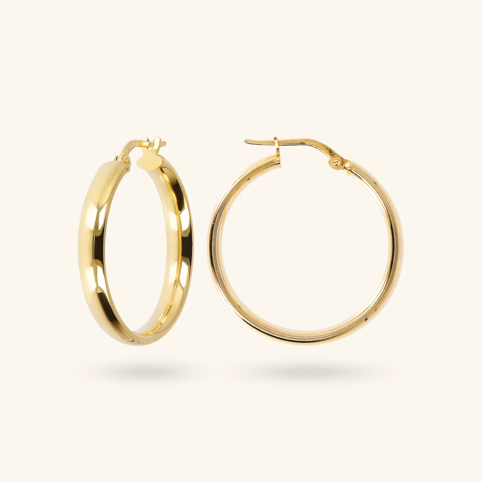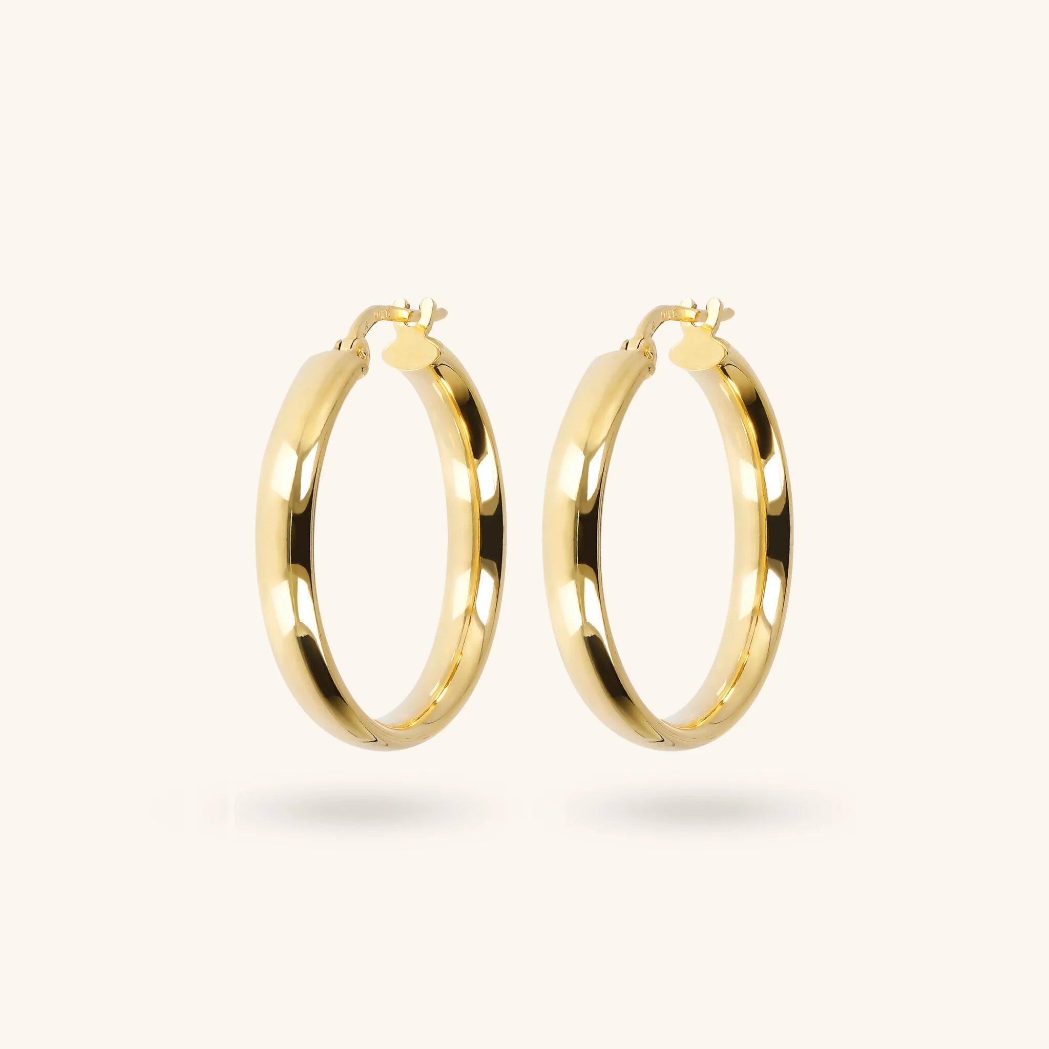 Etrusca Gioielli hoop pendant earrings mounted on a Golden base, 18kt yellow gold plated, with a classic design with a smooth surface; bayonet lock; length of 2.5cm.
