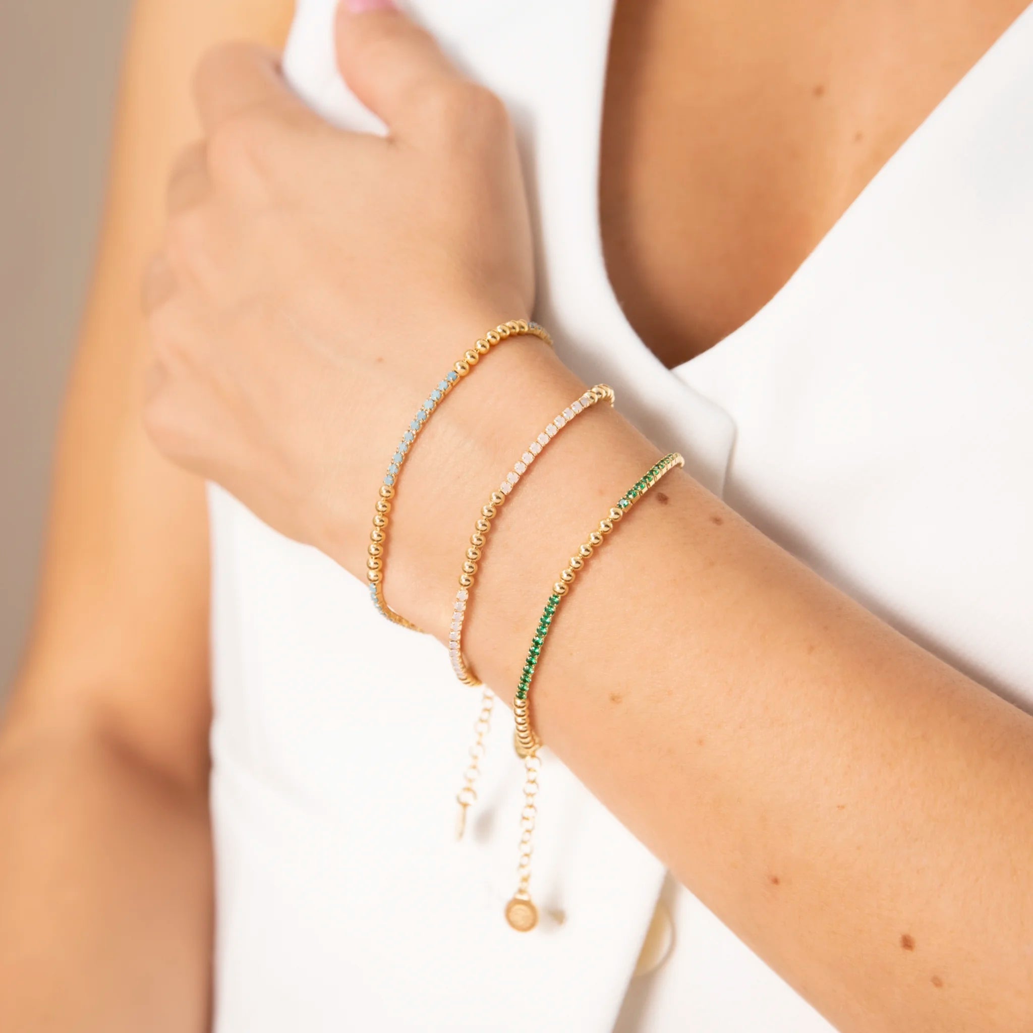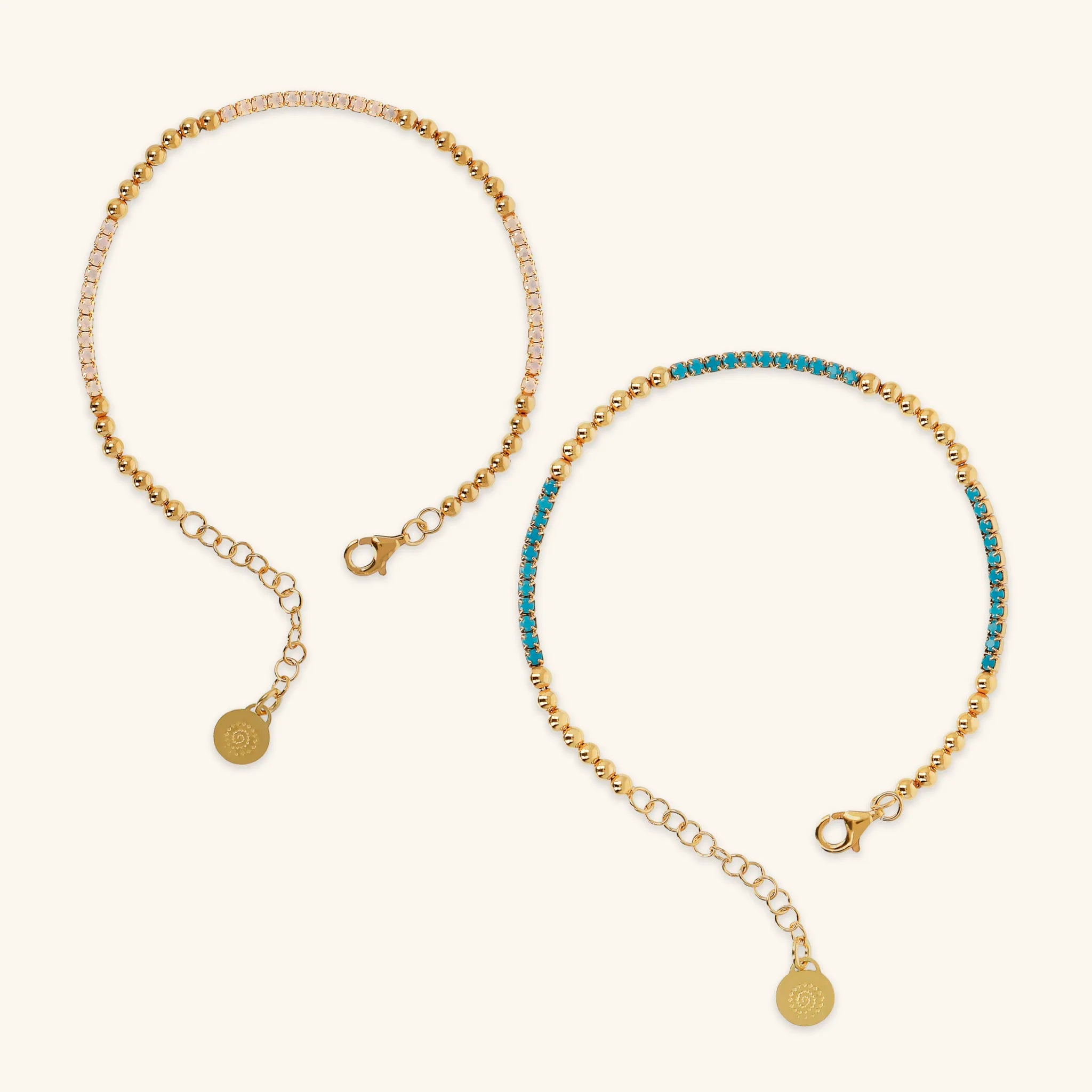 Etrusca Gioielli set made of 925 Silver, plated with 18Kt yellow Gold, consisting of two mixed tennis bracelets embellished with shiny beads and turquoise and white cubic zirconia stones. Length 17+3cm.