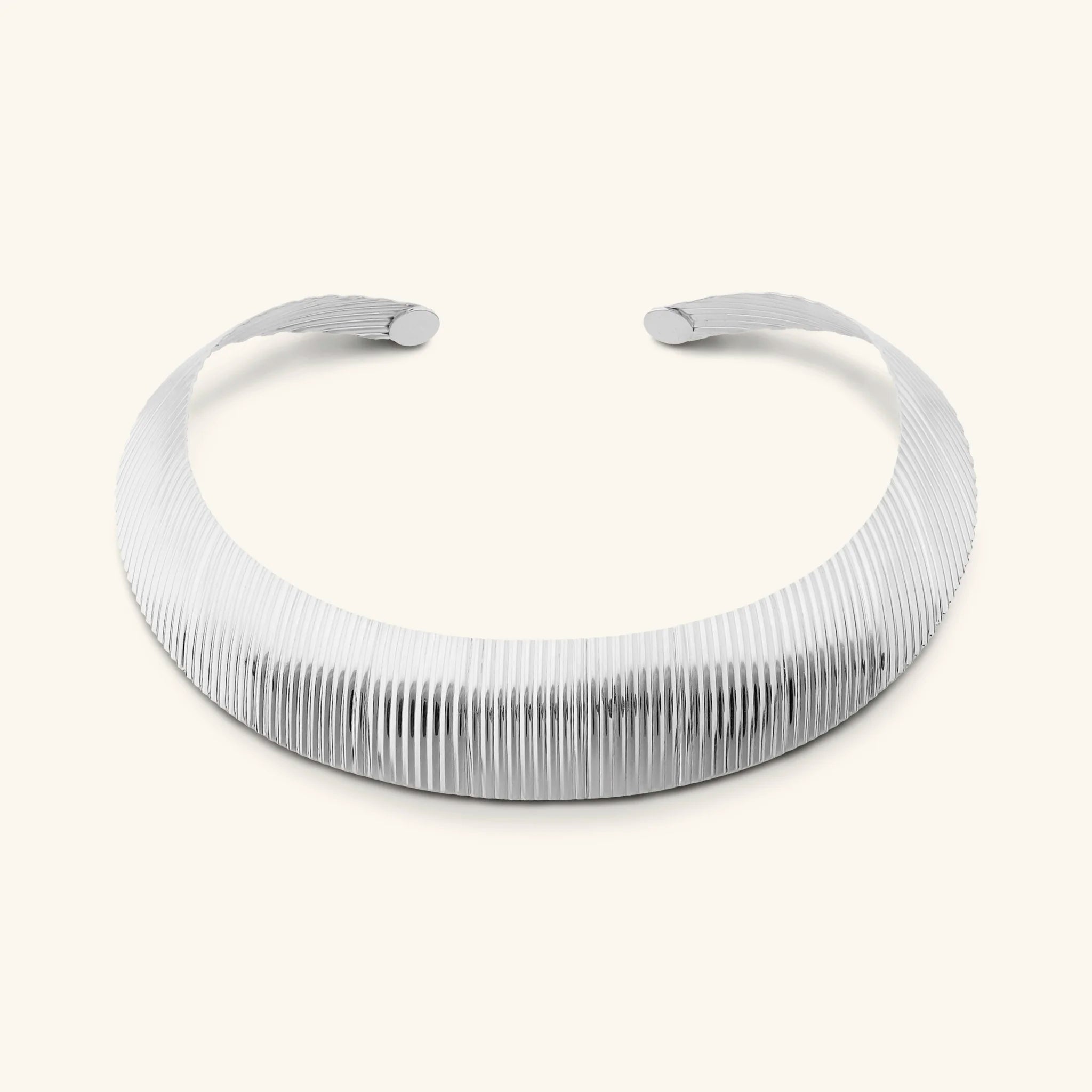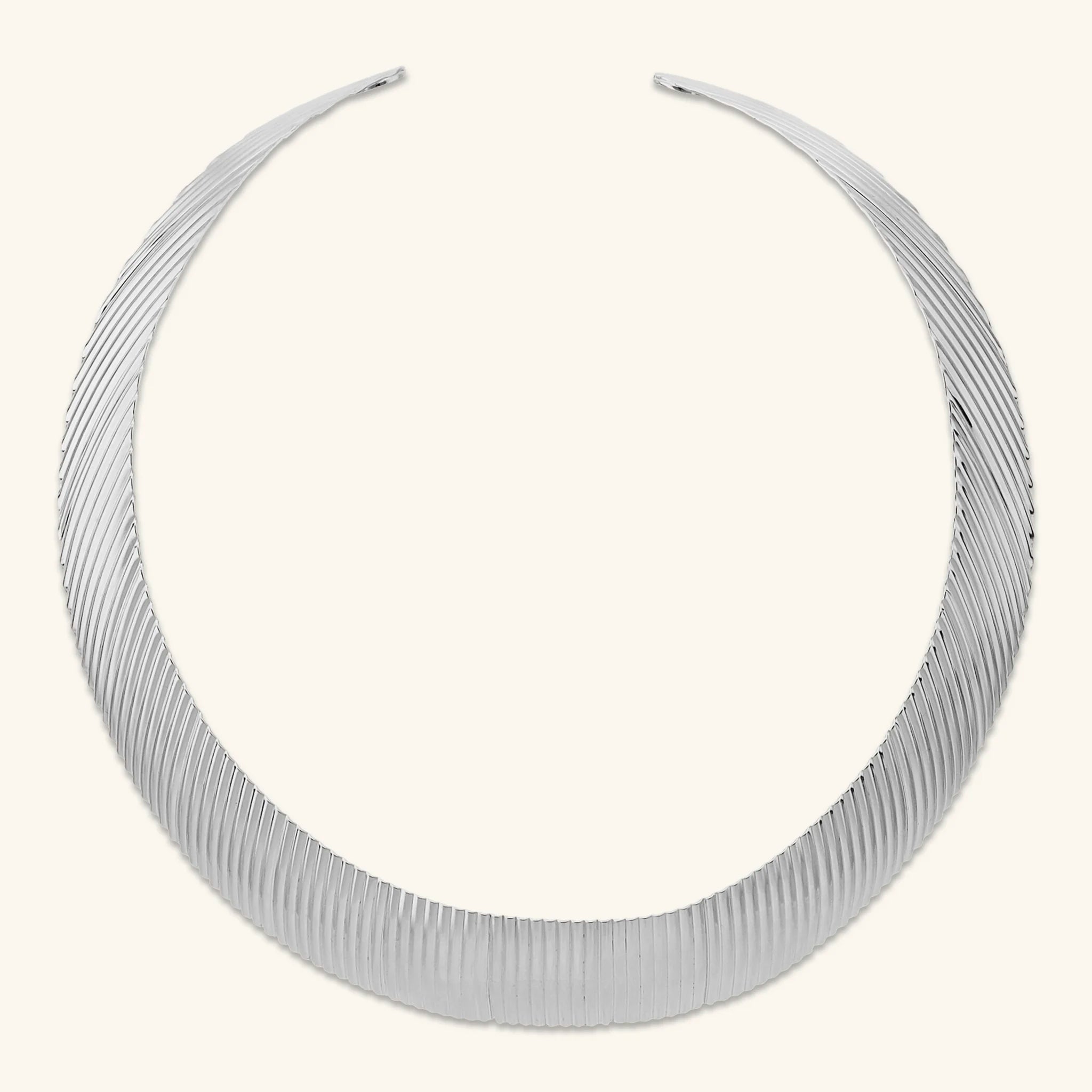 Rigid 'choker' Etruscan Necklace made of Golden alloy, plated with 18kt yellow gold, with a striped surface. Anatomical fit. Maximum surface width 20 mm.