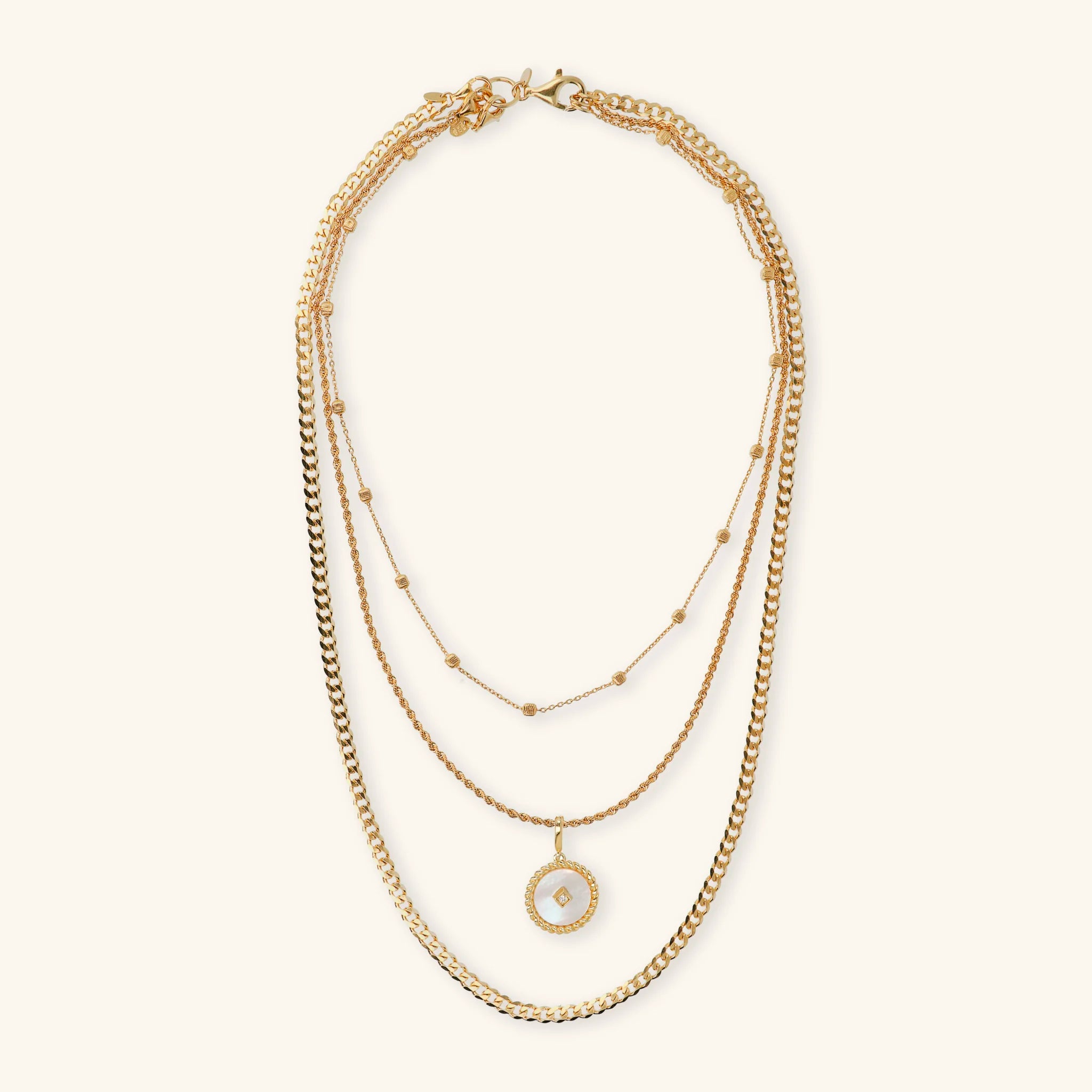 Etrusca Gioielli multi-strand necklace in 925 silver, 18kt yellow gold plated, composed of a rosary chain (40.6 cm) with diamond-cut cube elements; a rope chain (45.7 cm) with a round pendant in white mother-of-pearl, edges in relief and a light point in cubic zirconia; a classic curb chain (55.8 cm); lobster clasp.