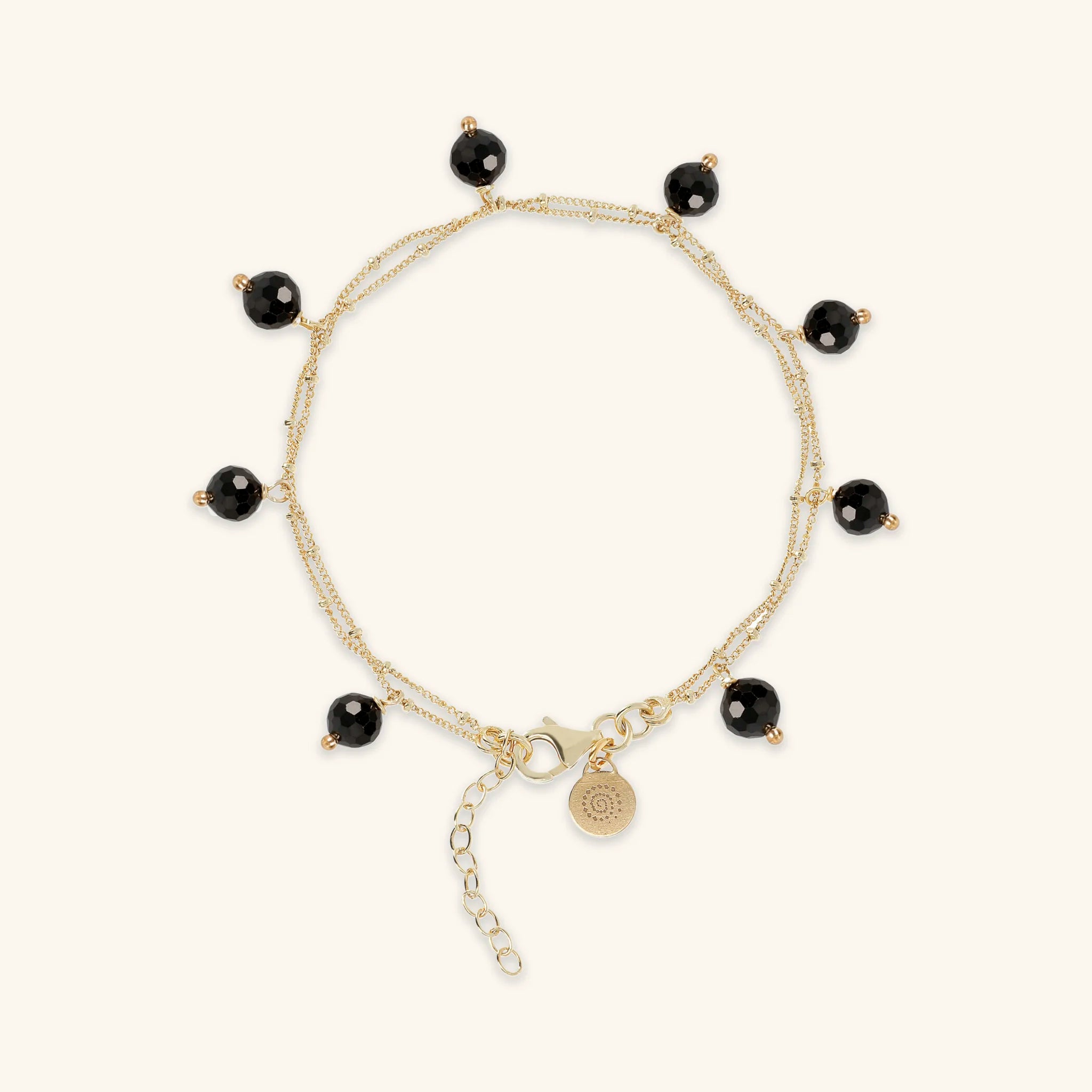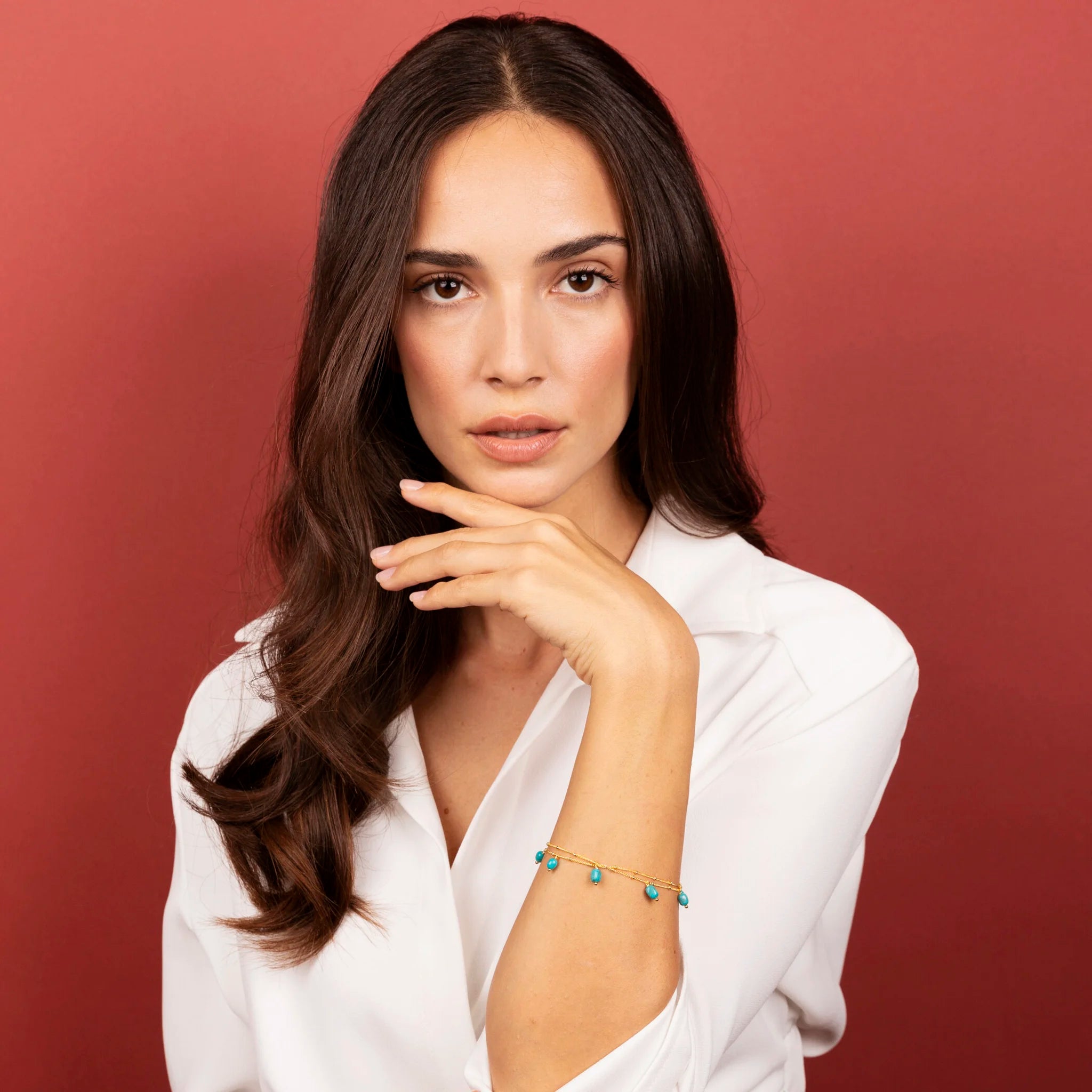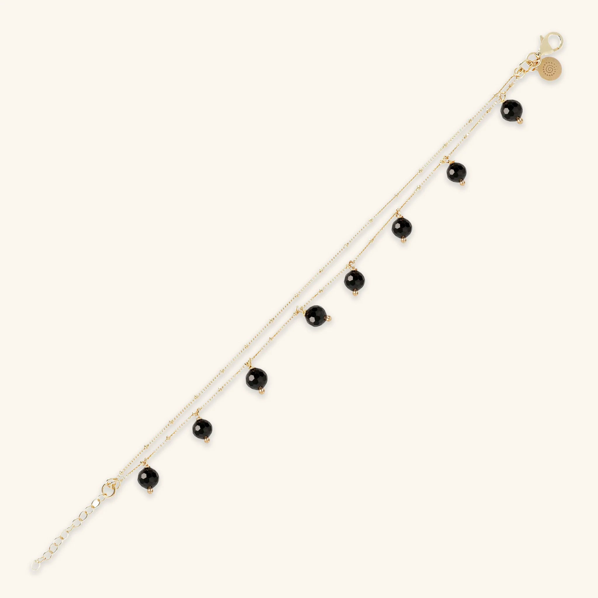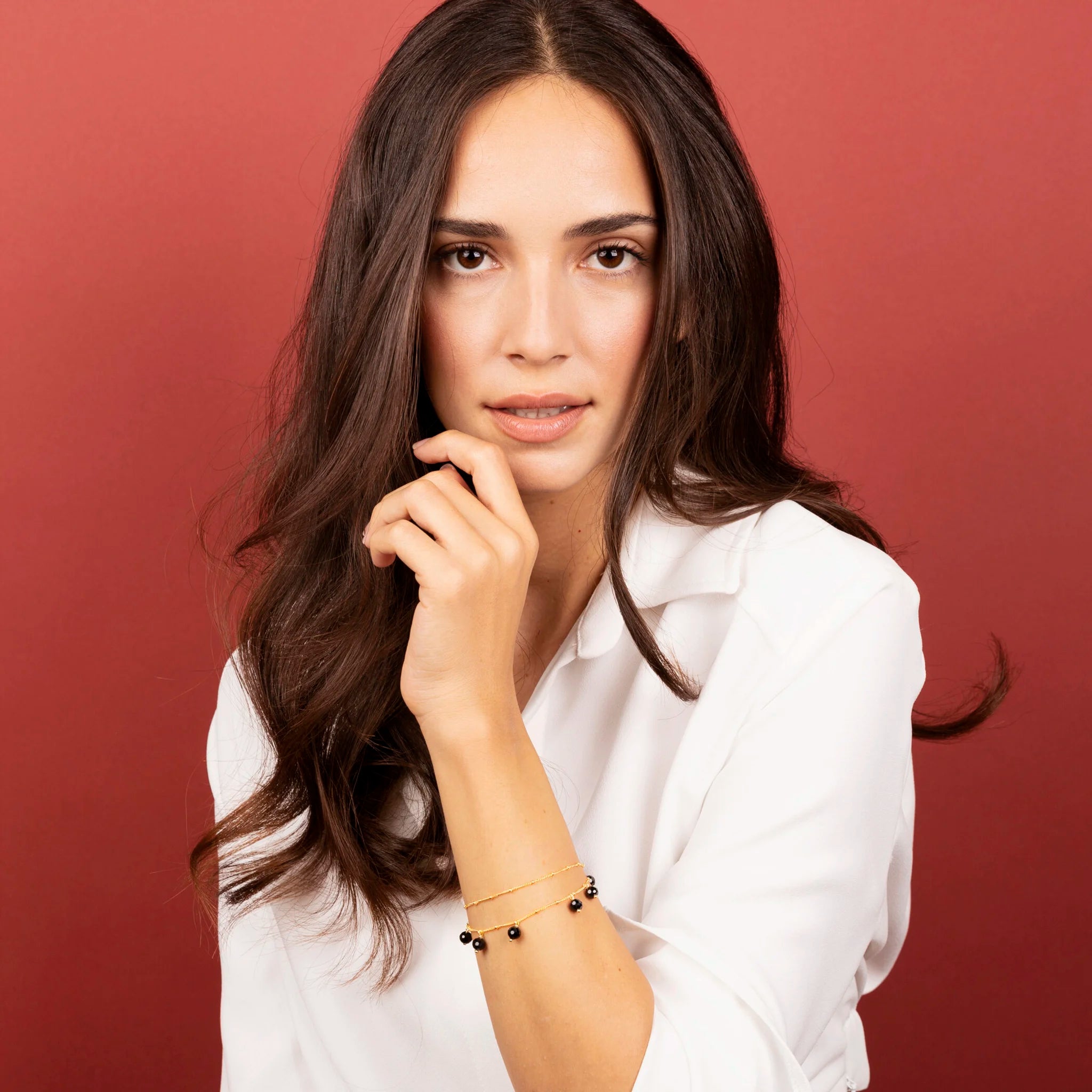 Etrusca Gioielli multi-strand rosary bracelet in 925 silver, 18kt yellow gold plated, embellished with two strands of chain with small pendants in natural stone; lobster clasp with extender.