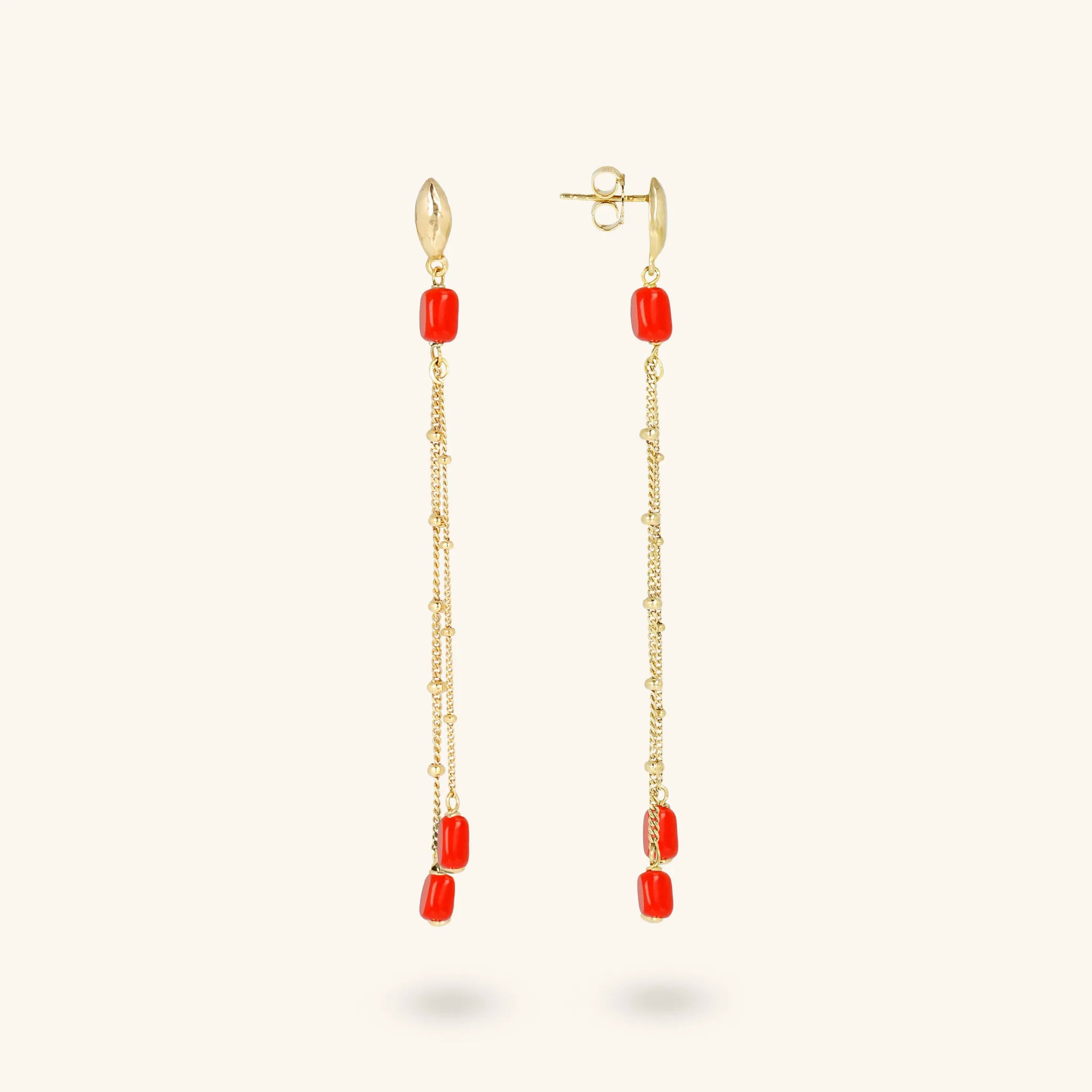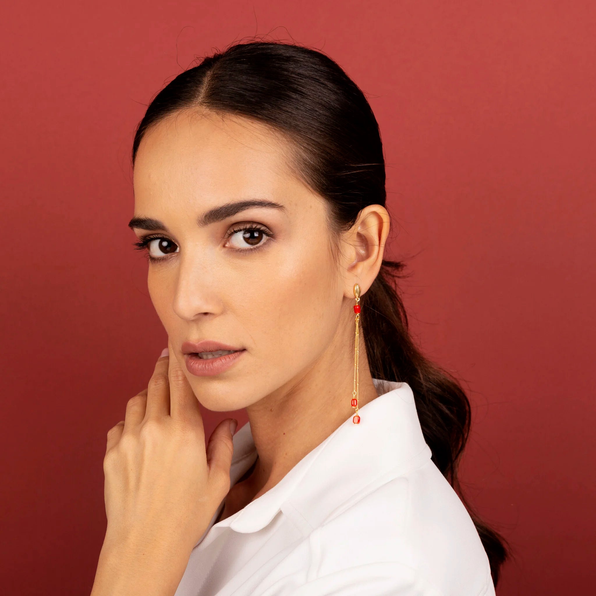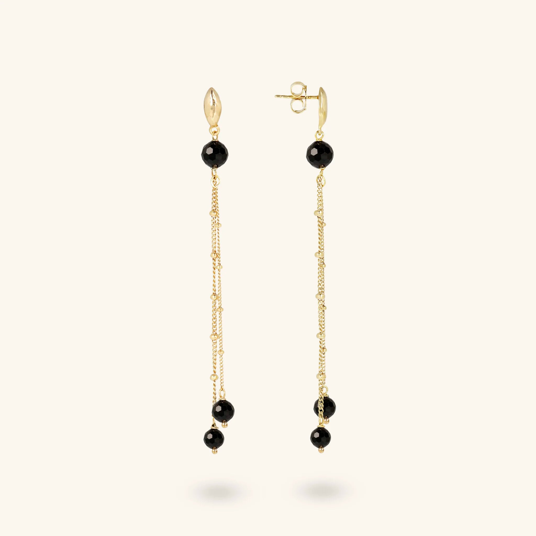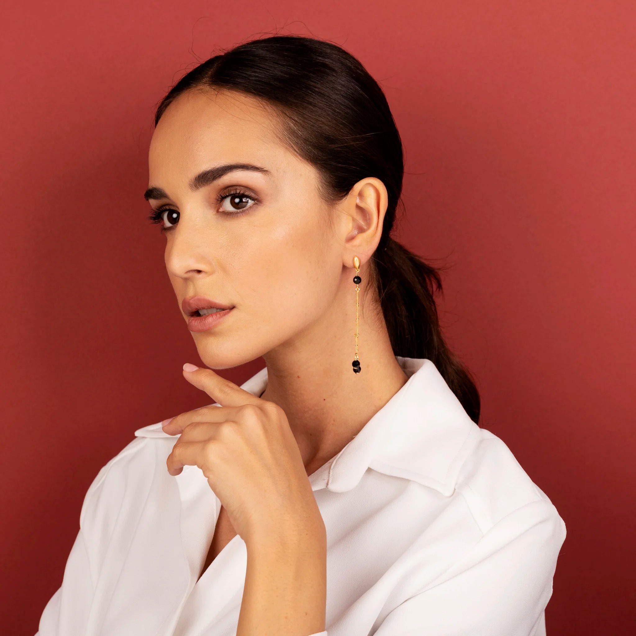 Etrusca Gioielli earrings in 925 silver, 18kt yellow gold plated, embellished with two strands of rosary chain with small natural stones; stud and butterfly closure; length of 9.1cm.