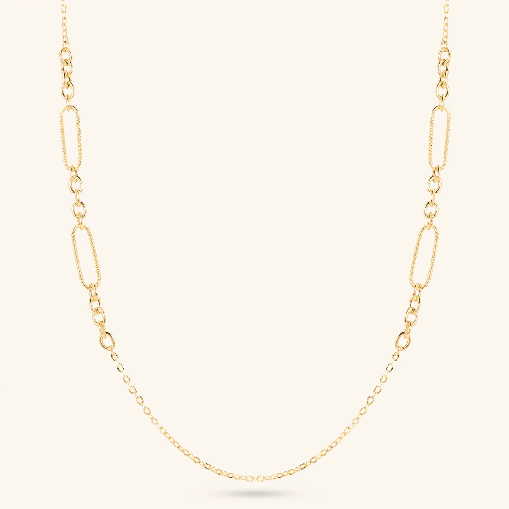 Etrusca Gioielli long necklace mounted on a Golden base, 18kt yellow gold plated, embellished with a rolo chain alternating with rolo links and elongated ovals with hammered surface; lobster clasp.
