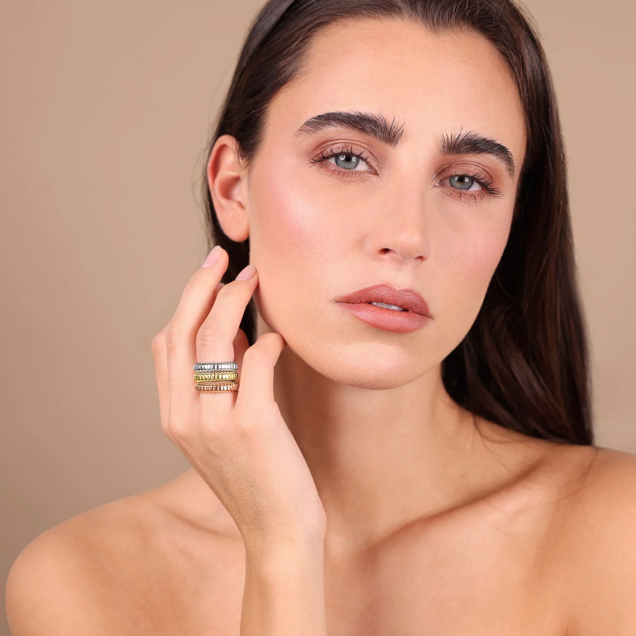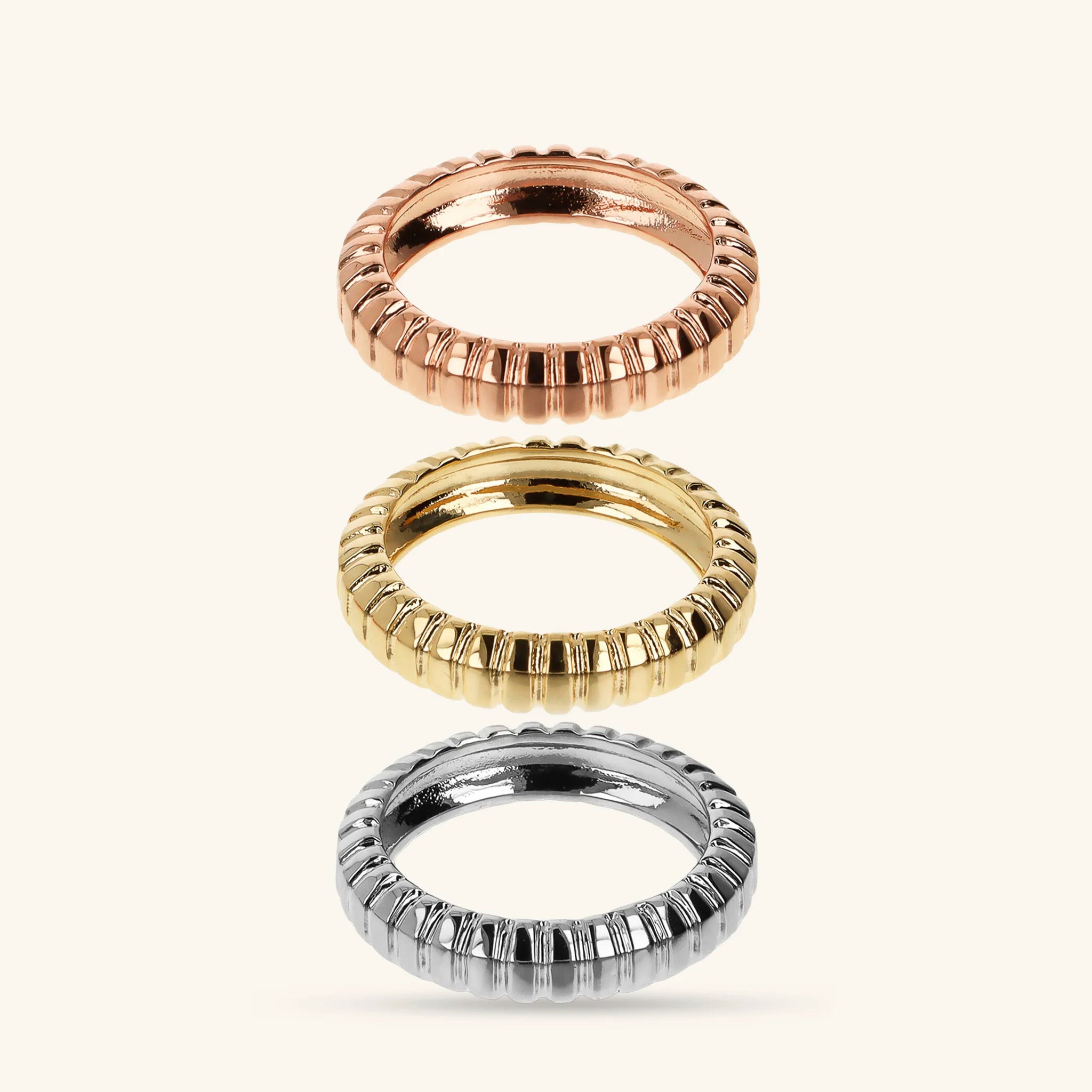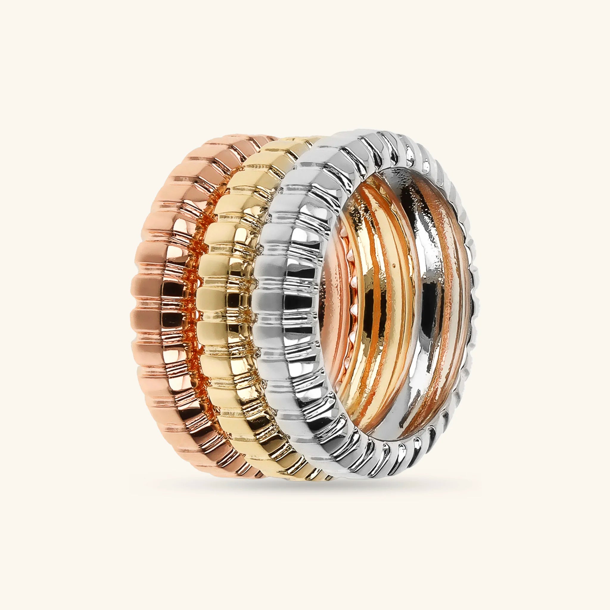 Set of rings Etrusca Jewelry made of Golden alloy consisting of three rings with a striped texture surface plated in 18kt yellow gold, 18kt rose gold, and platinum.