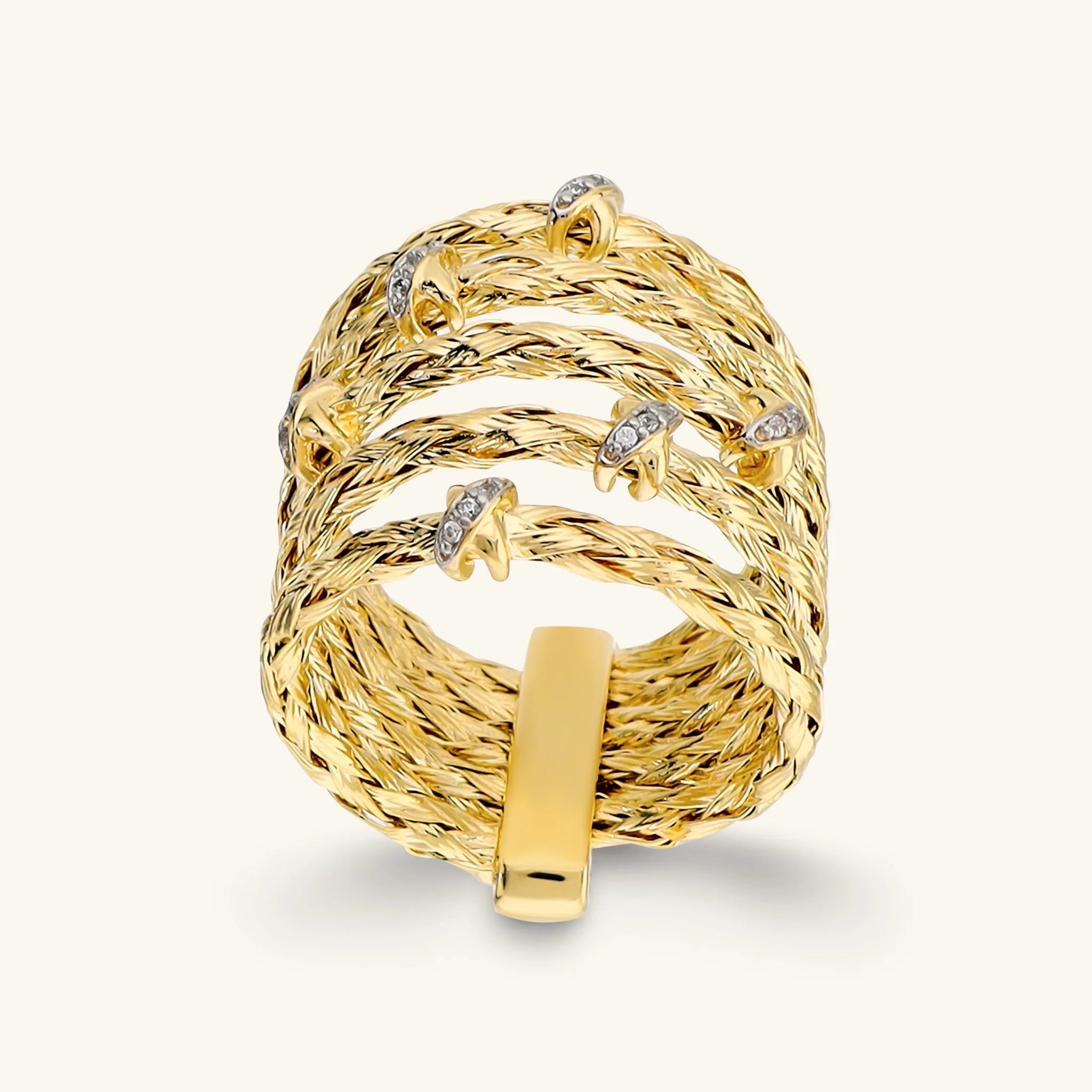 Etruscan band ring by Gioielli made of Golden alloy, plated with 18kt yellow gold, featuring a multi-strand design with a diamond-cut rope texture chain and crisscross elements in pavé cubic zirconia. The ring has a polished central bar.