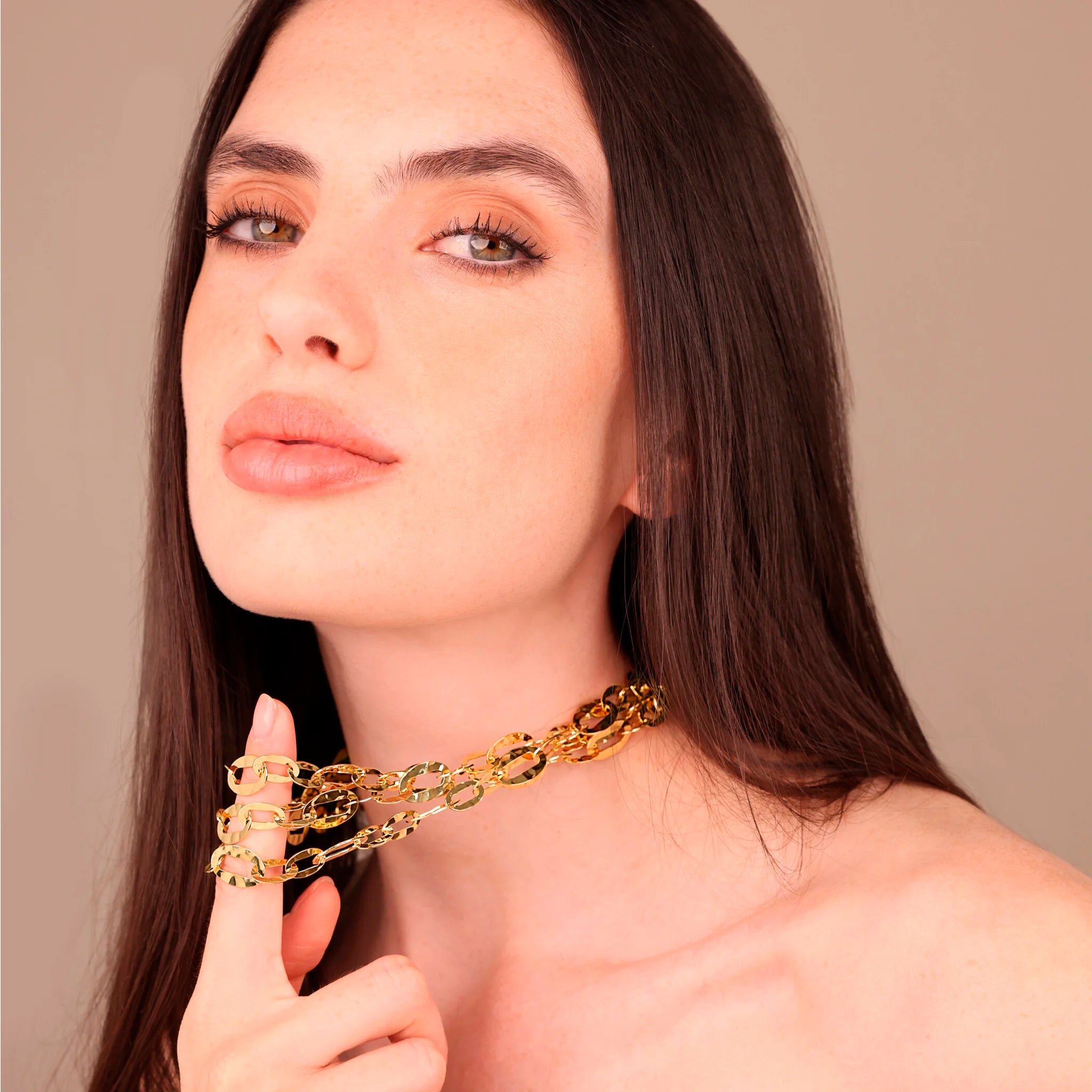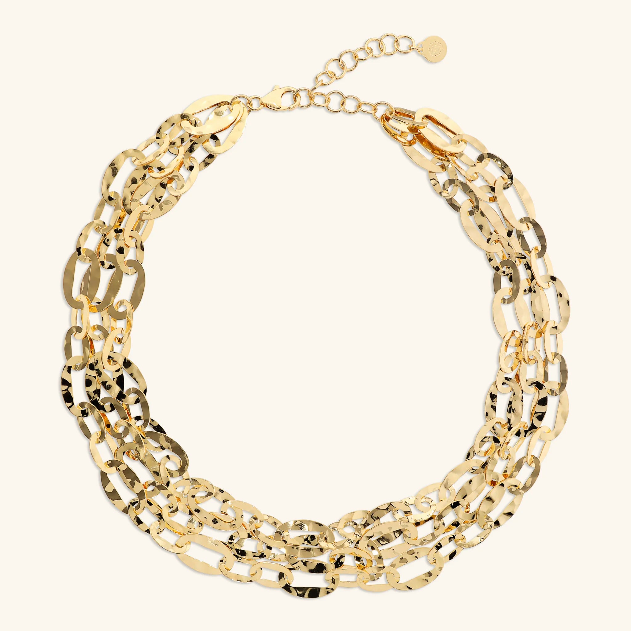 Etrusca Gioielli multi-strand choker necklace made of Golden alloy, plated with 18kt yellow gold or rhodium, with finely hammered oval links. Lobster clasp.