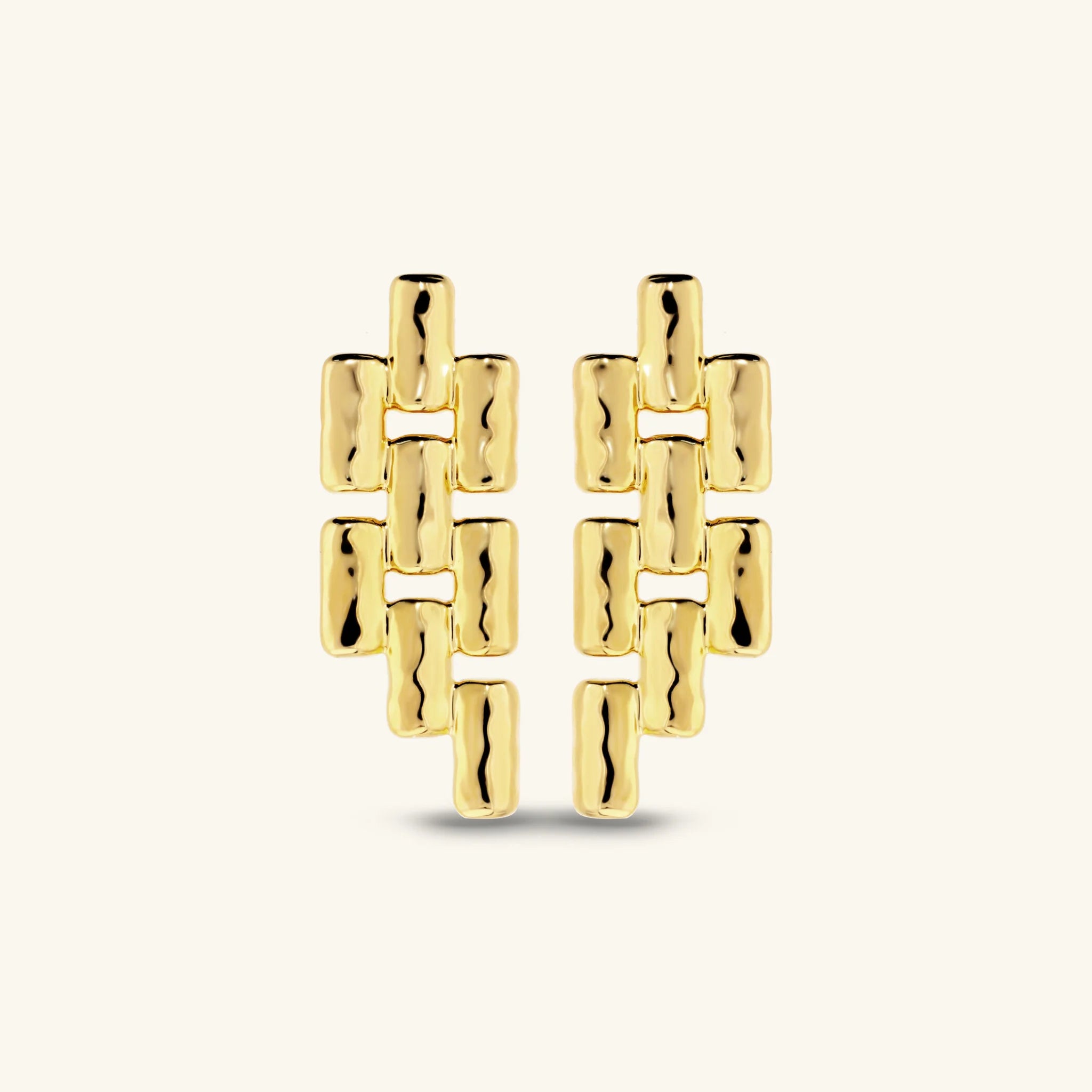 Etruscan stud earrings by Gioielli made from Golden alloy, plated with 18kt yellow gold, featuring a panther chain and hammered finish. Post and butterfly clasp.