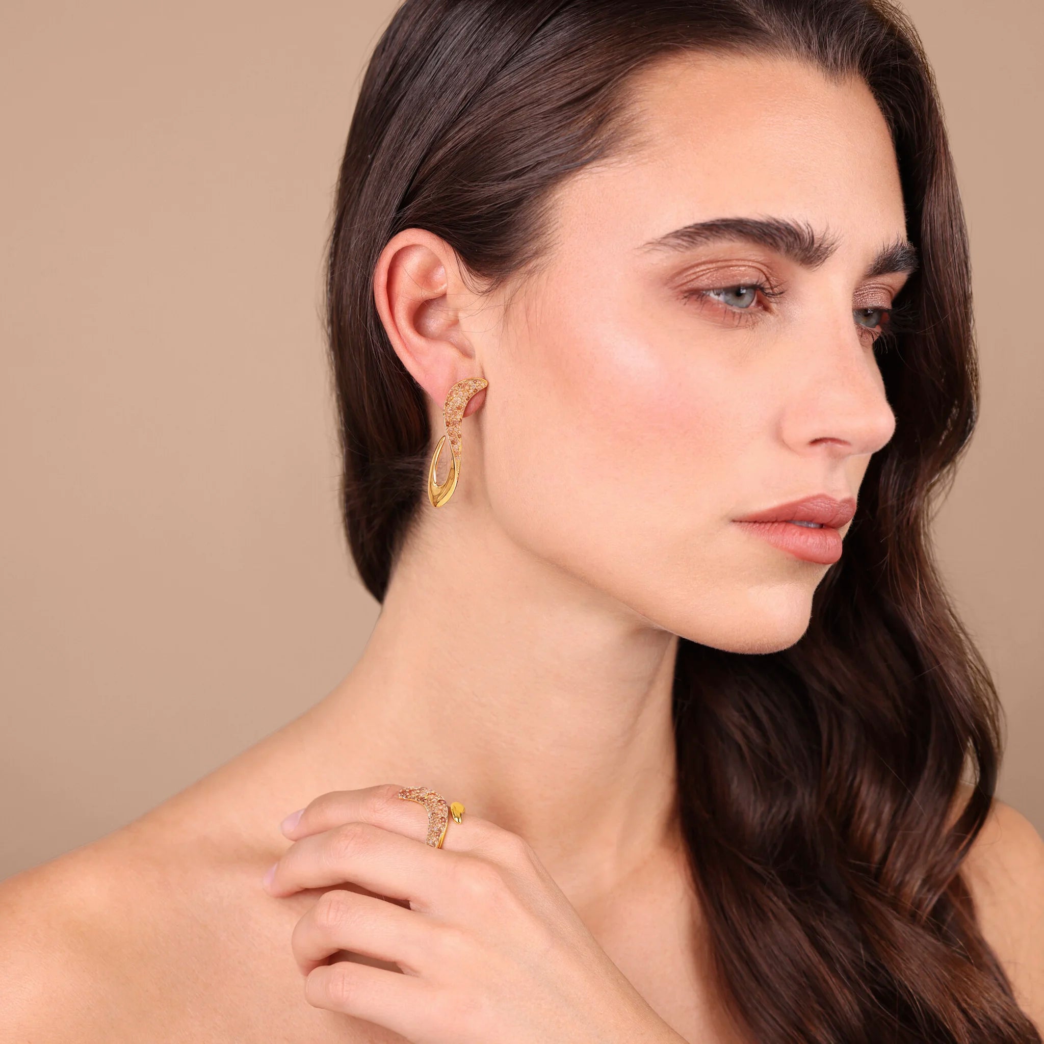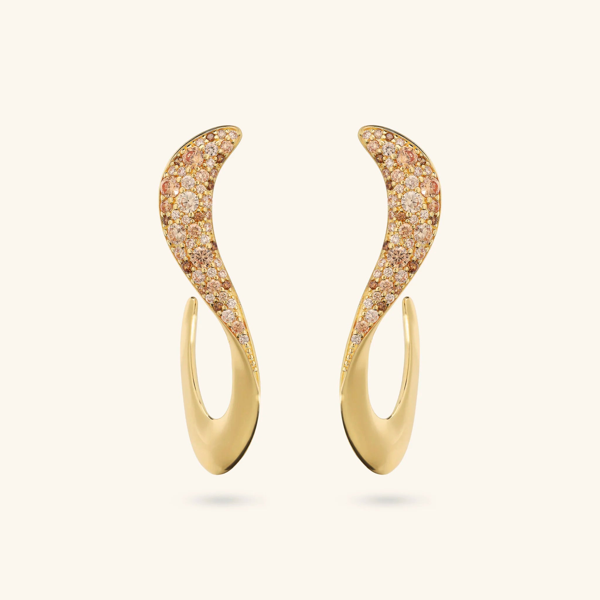 Etrusca Jewelry dangling earrings made of Golden alloy, plated with 18kt yellow gold, featuring a wavy design with champagne-colored cubic zirconia pavé. Pin and butterfly closure.