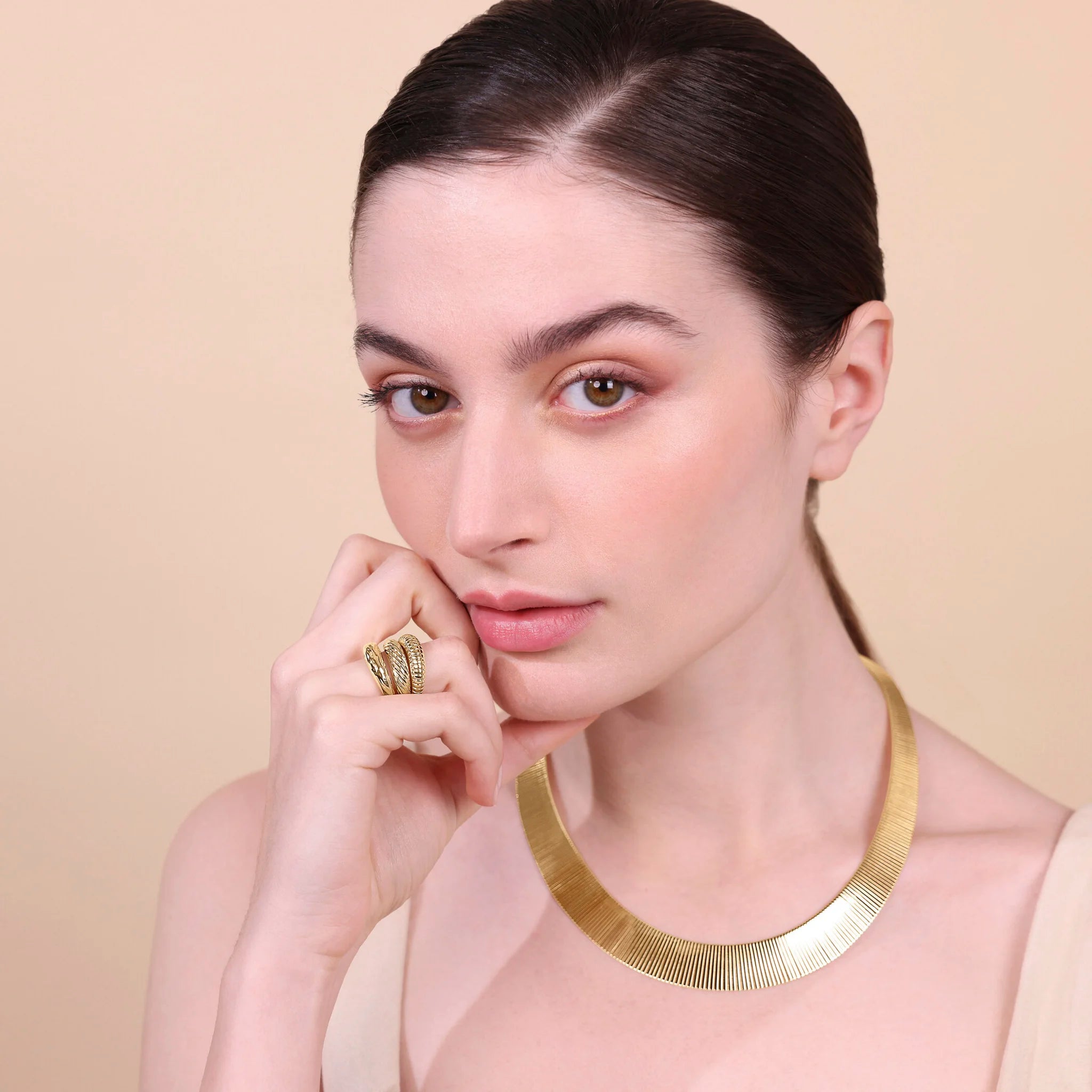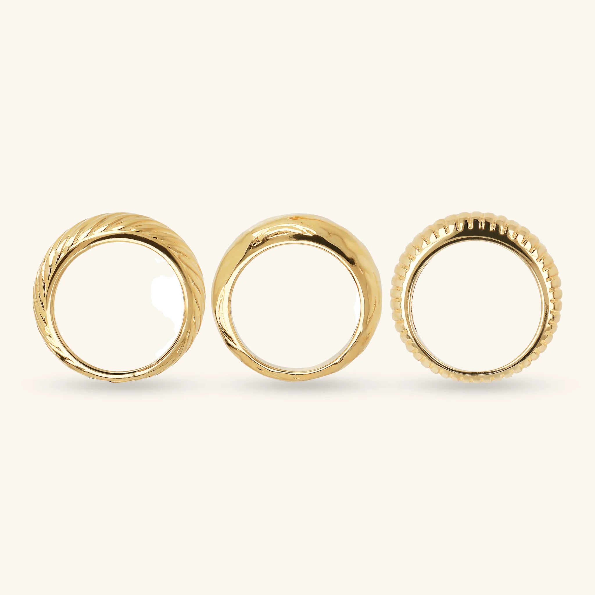 Set of Etrusca Gioielli rings mounted on a Golden base, 18kt yellow gold plated, consisting of a ring with a delicately hammered surface, a ring with a vertical striped texture and a ring with an oblique striped texture.