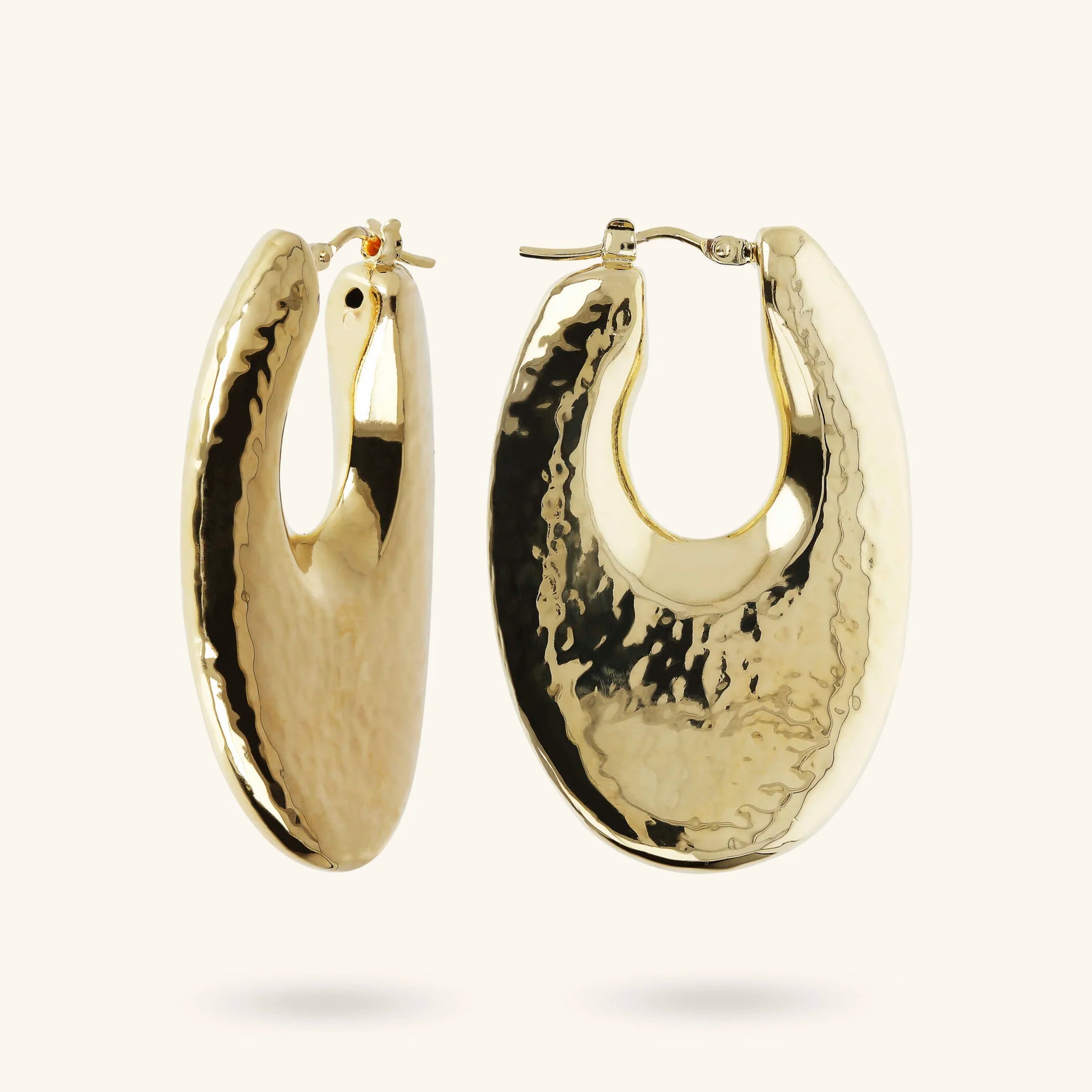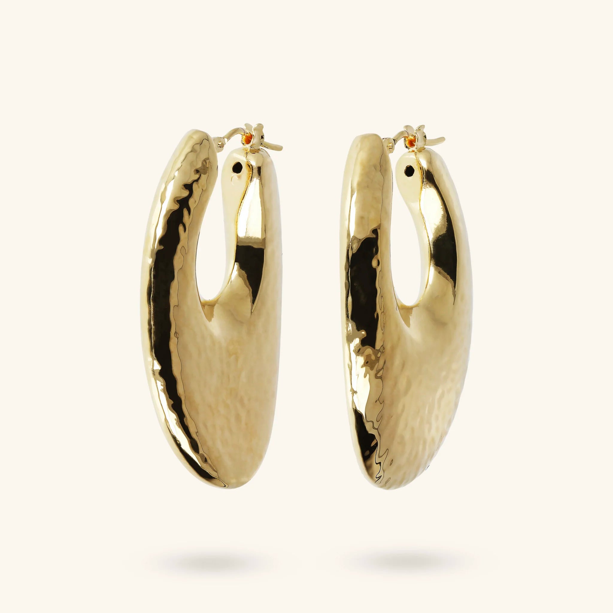 Etrusca Jewels hoop pendant earrings mounted on a Golden base, 18kt yellow gold plated, oval shape with hammered surface; bayonet lock; length of 4.2 cm.