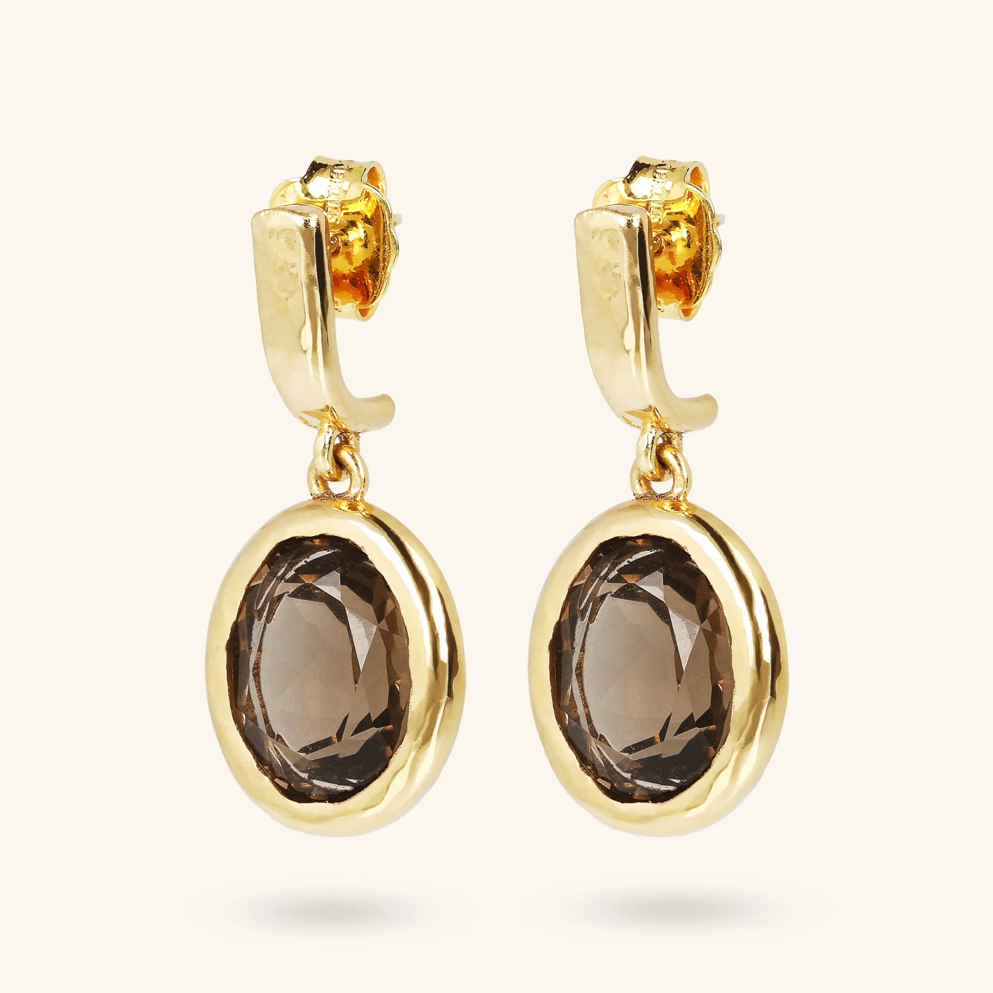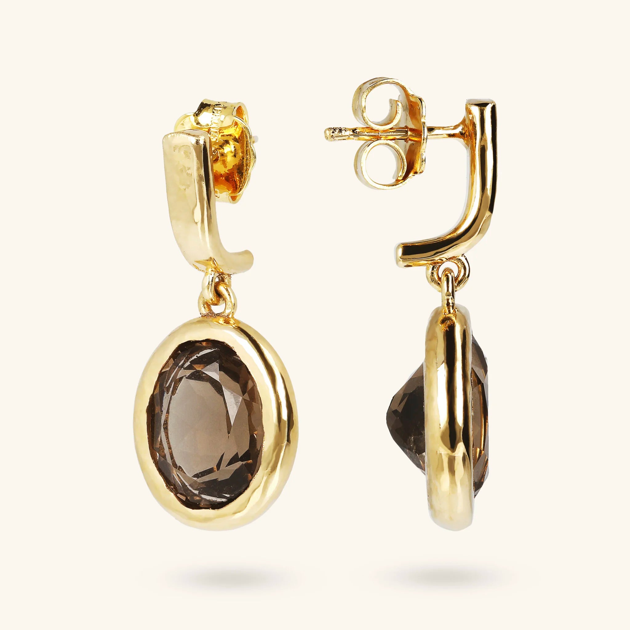 Etrusca Gioielli pendant earrings mounted on a Golden base, 18kt yellow gold plated, embellished with two round natural stones (brown quartz); stud and butterfly closure; length of 3cm.