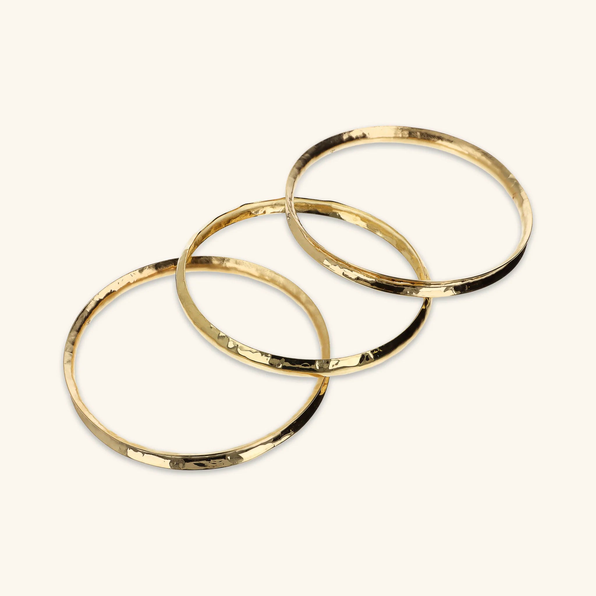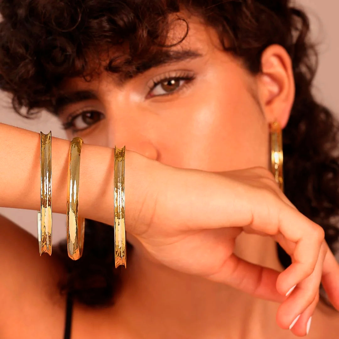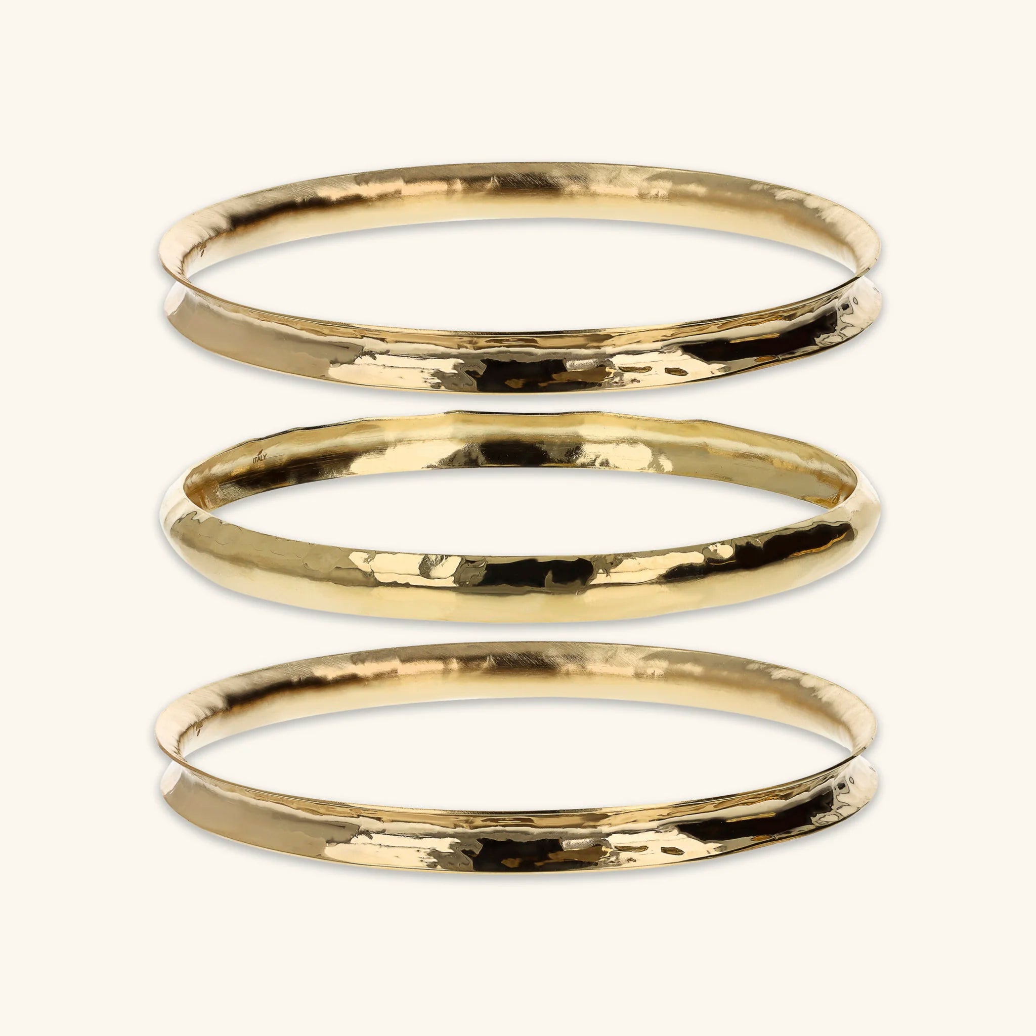Set of Etrusca Gioielli bracelets made of Golden alloy, 18kt yellow gold plated, composed of three rigid bracelets with hammered concave surface. External diameter 47 mm.
