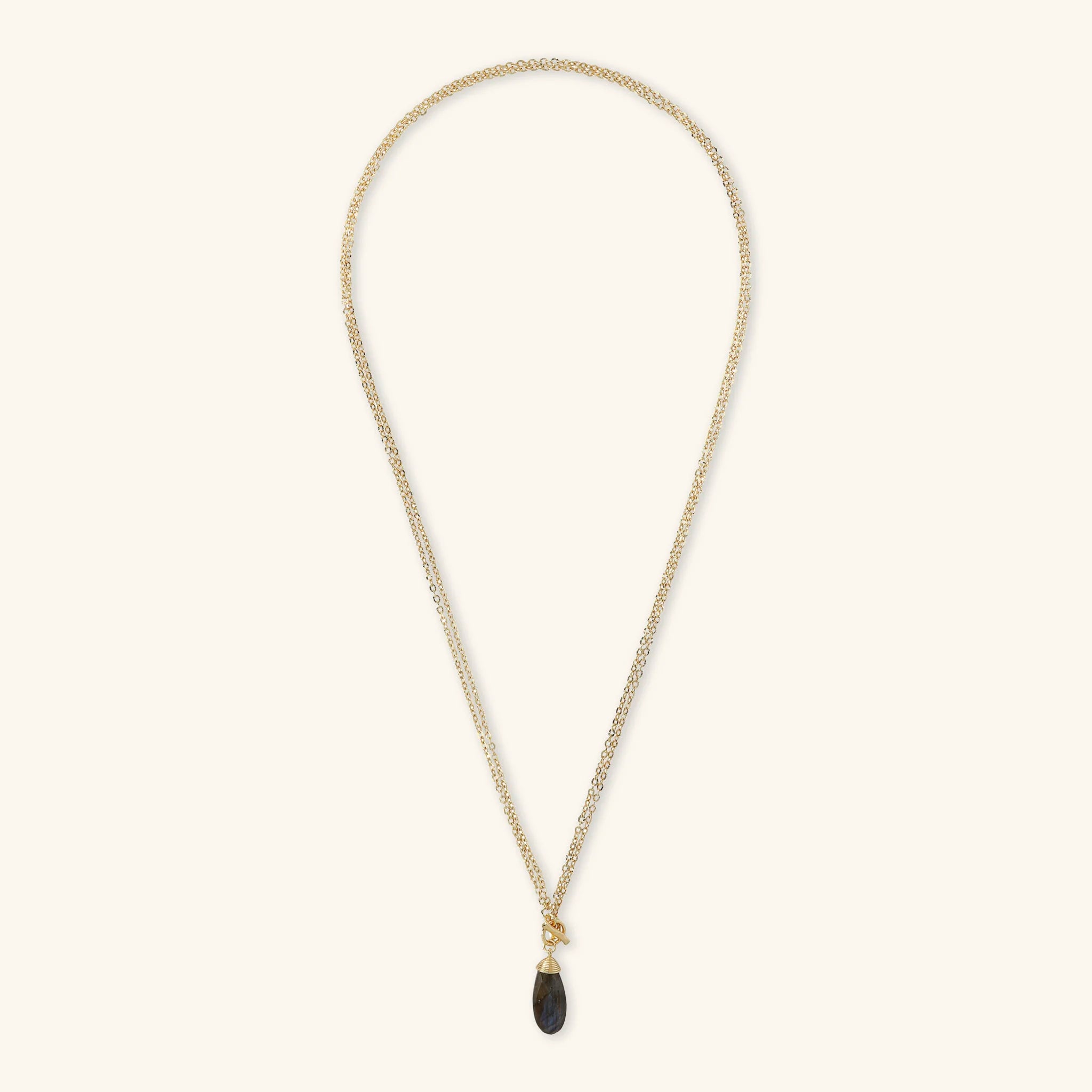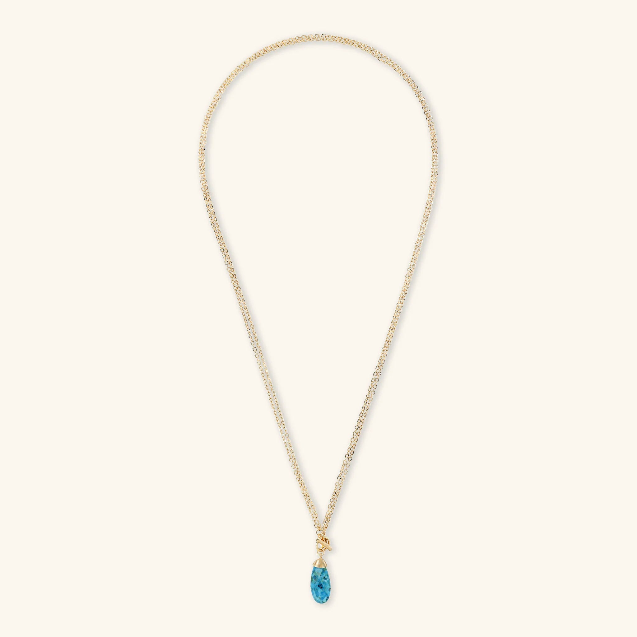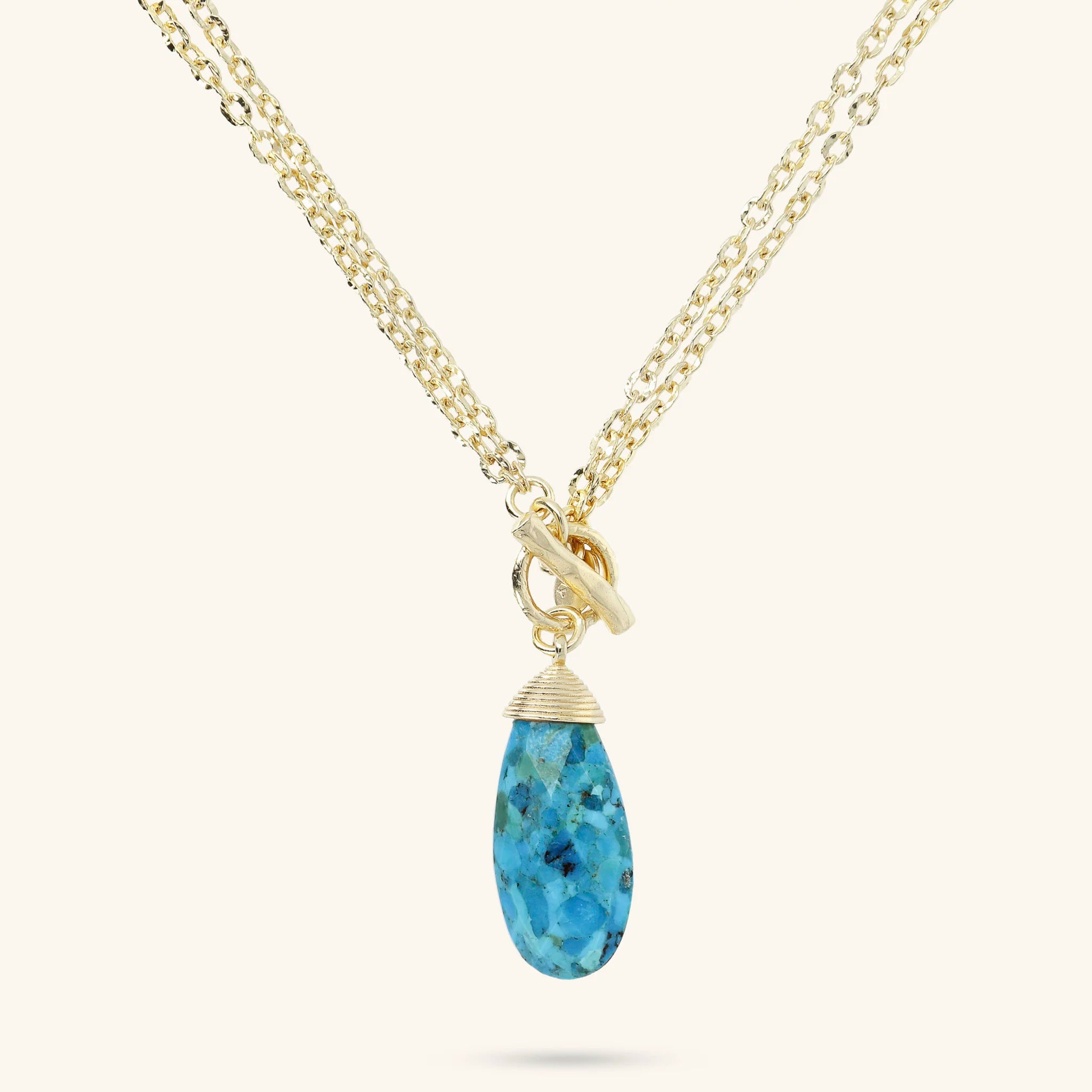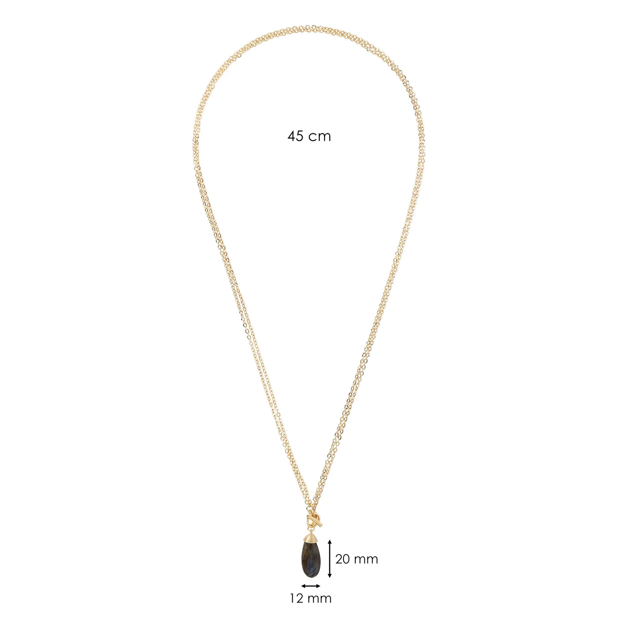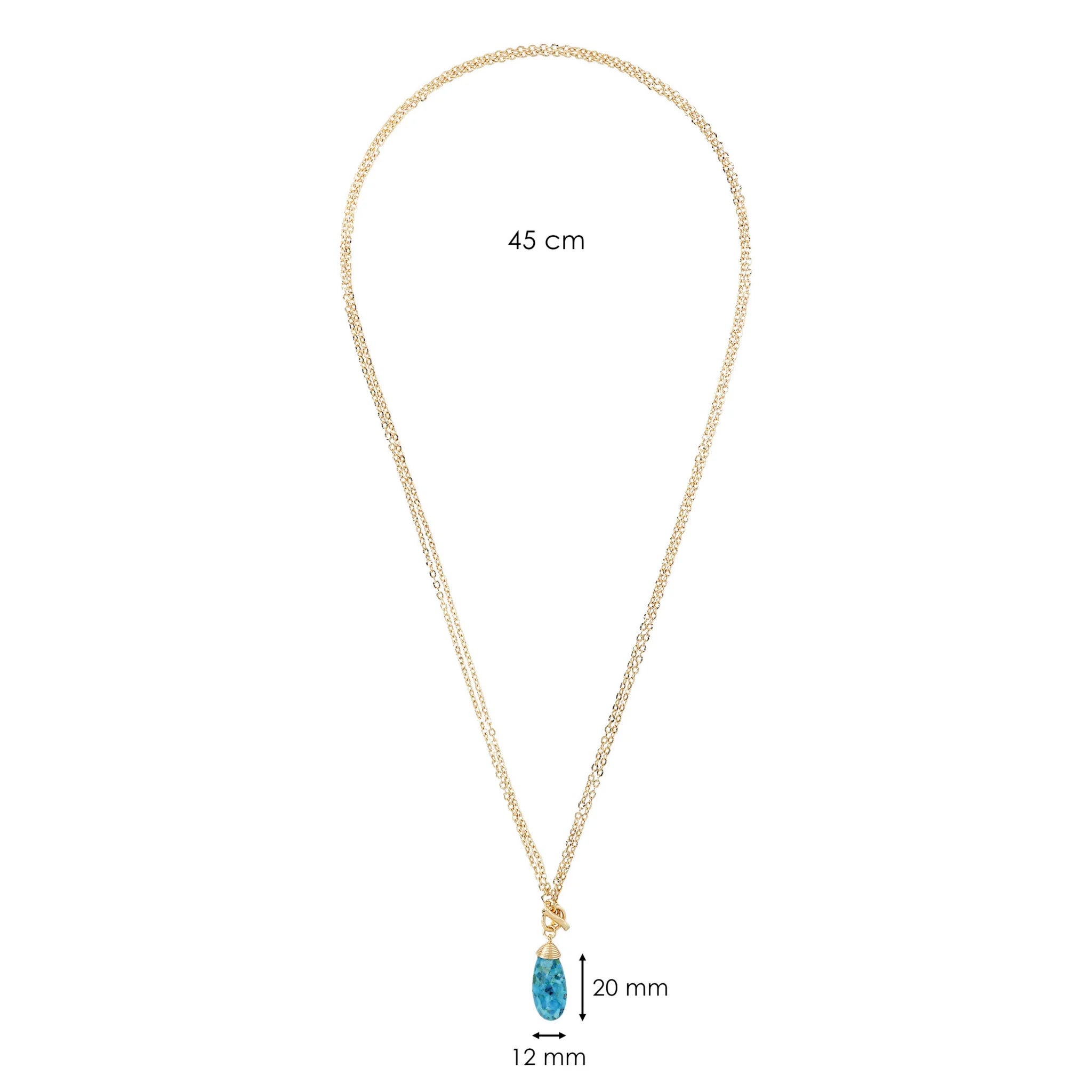 Etrusca Gioielli long necklace mounted on a Golden base, 18kt yellow gold plated, with double elongated cable chain with diamond-cut surface. The ring of the 'T-Bar' closure, located in the front, has a drop-shaped pendant (12x20 mm) in natural turquoise or labradorite stone.