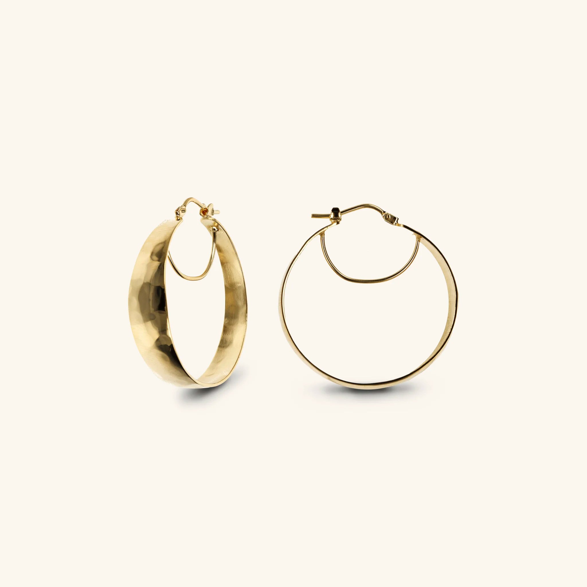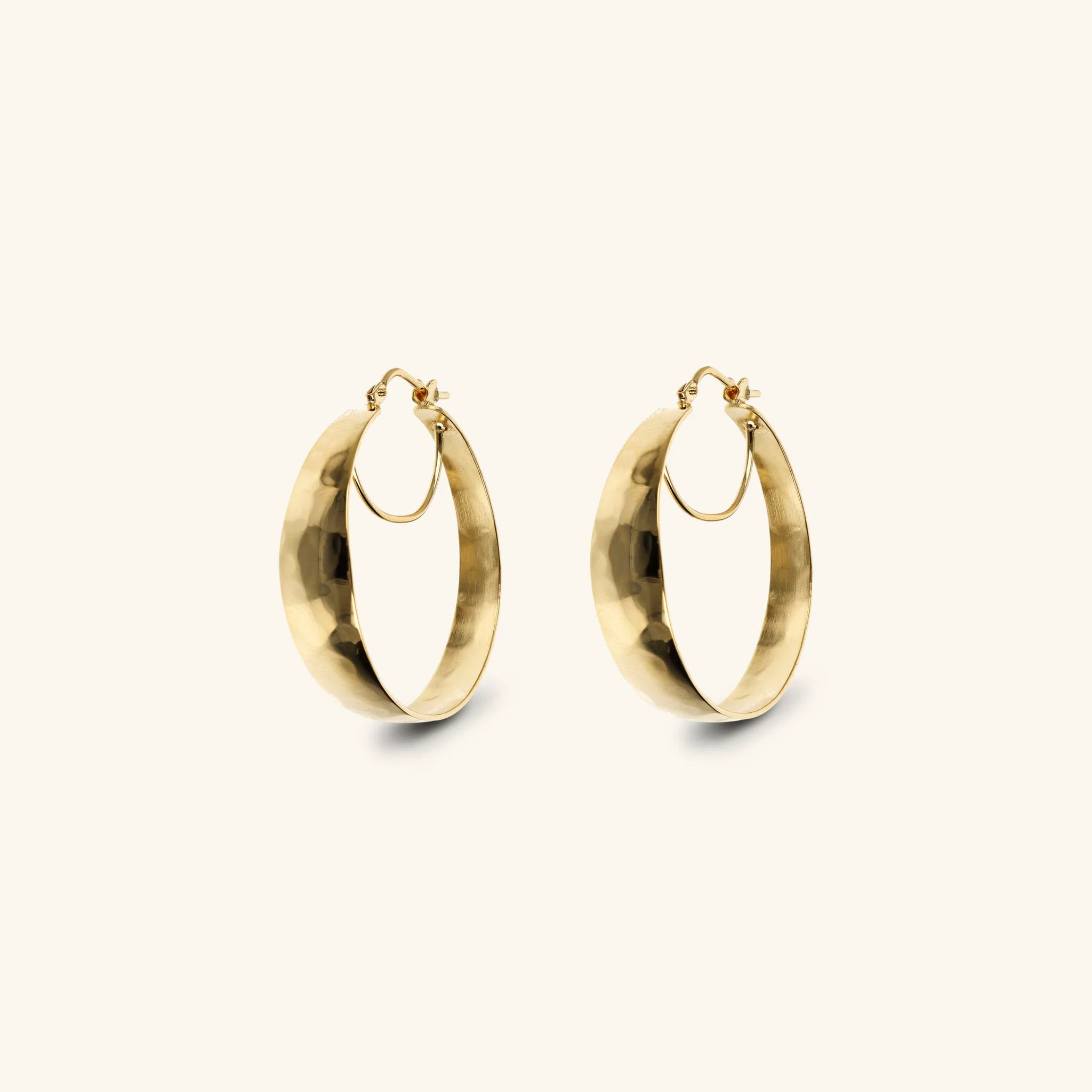 Large Hammered Hoop Earrings plated in 18Kt Yellow Gold Graduated Diameter 3cm