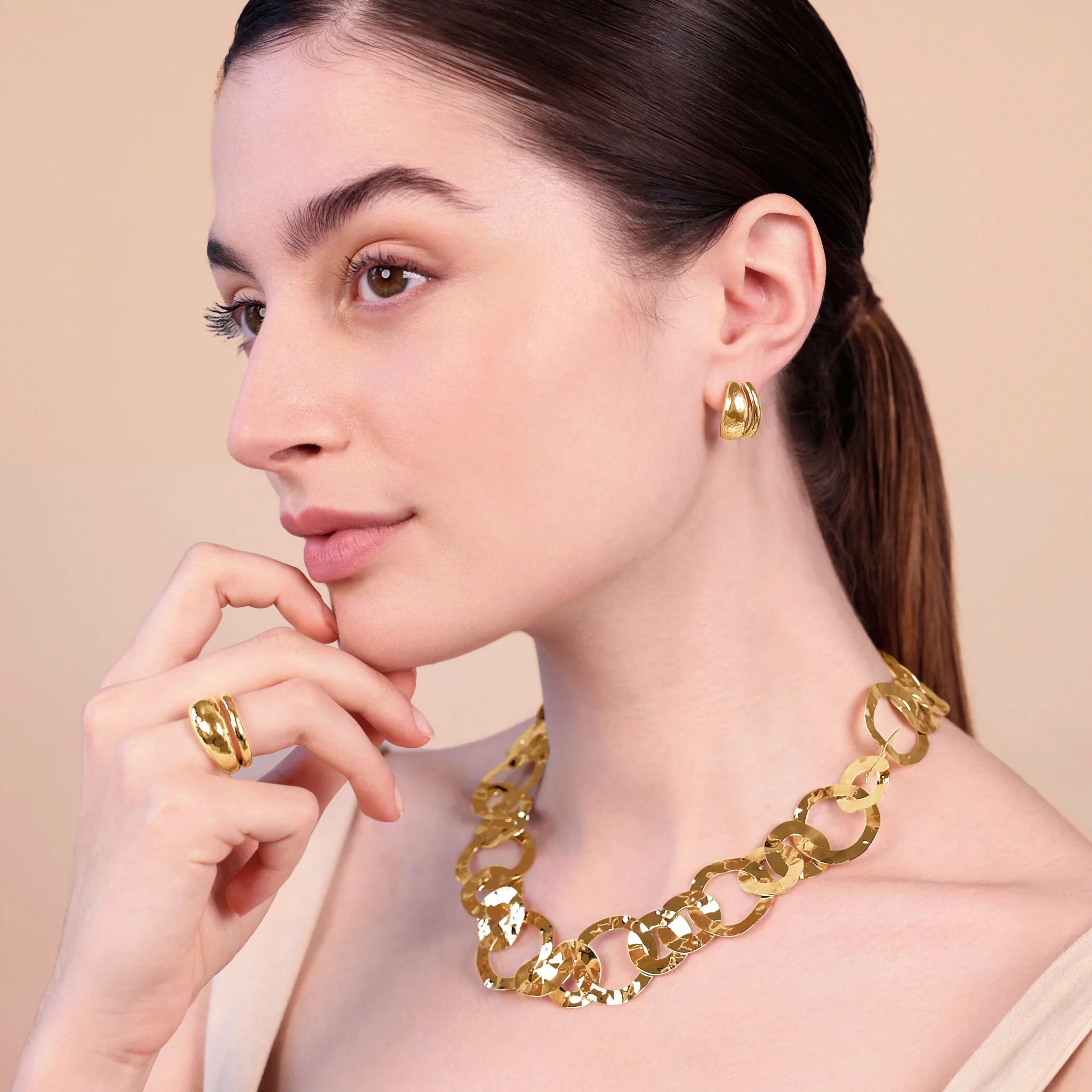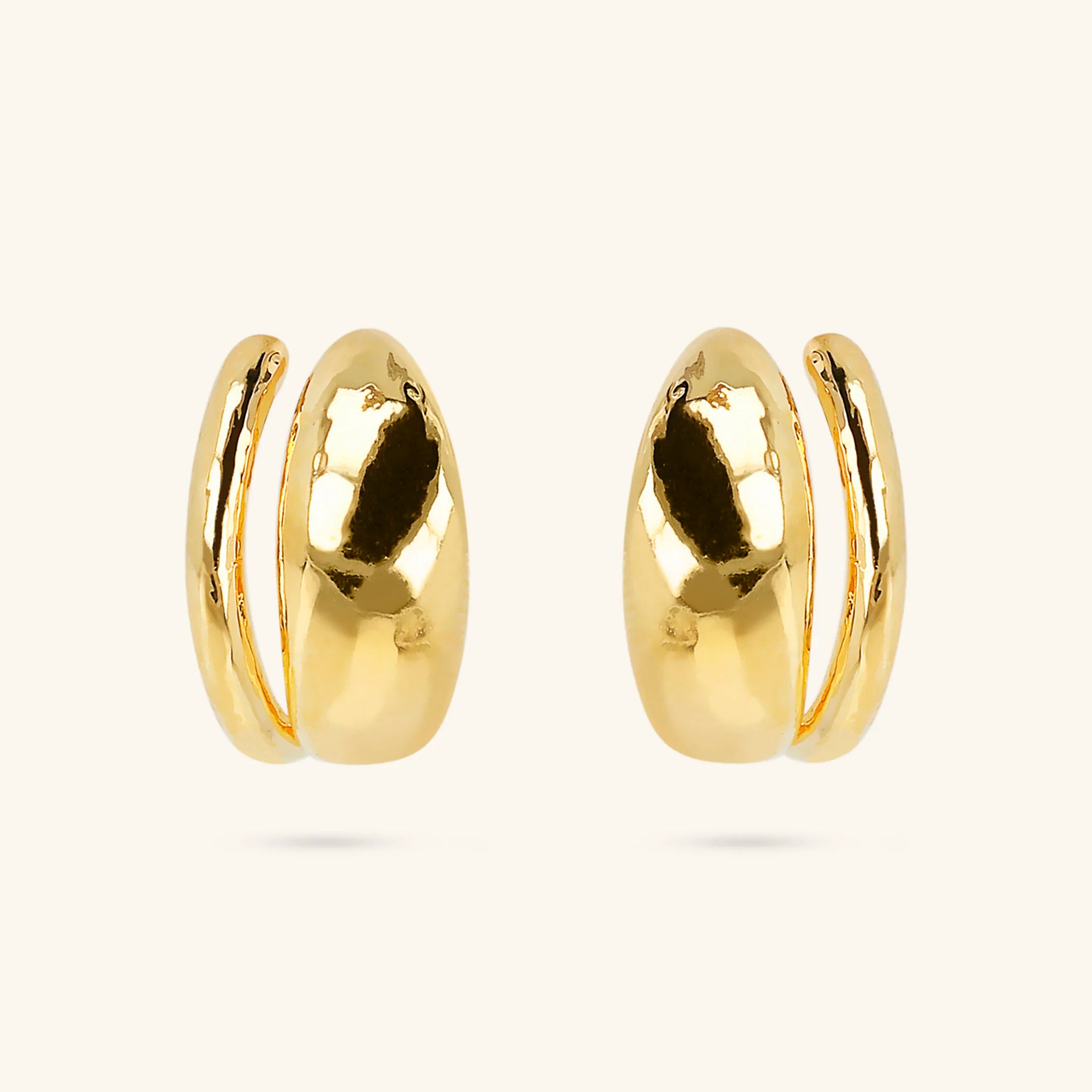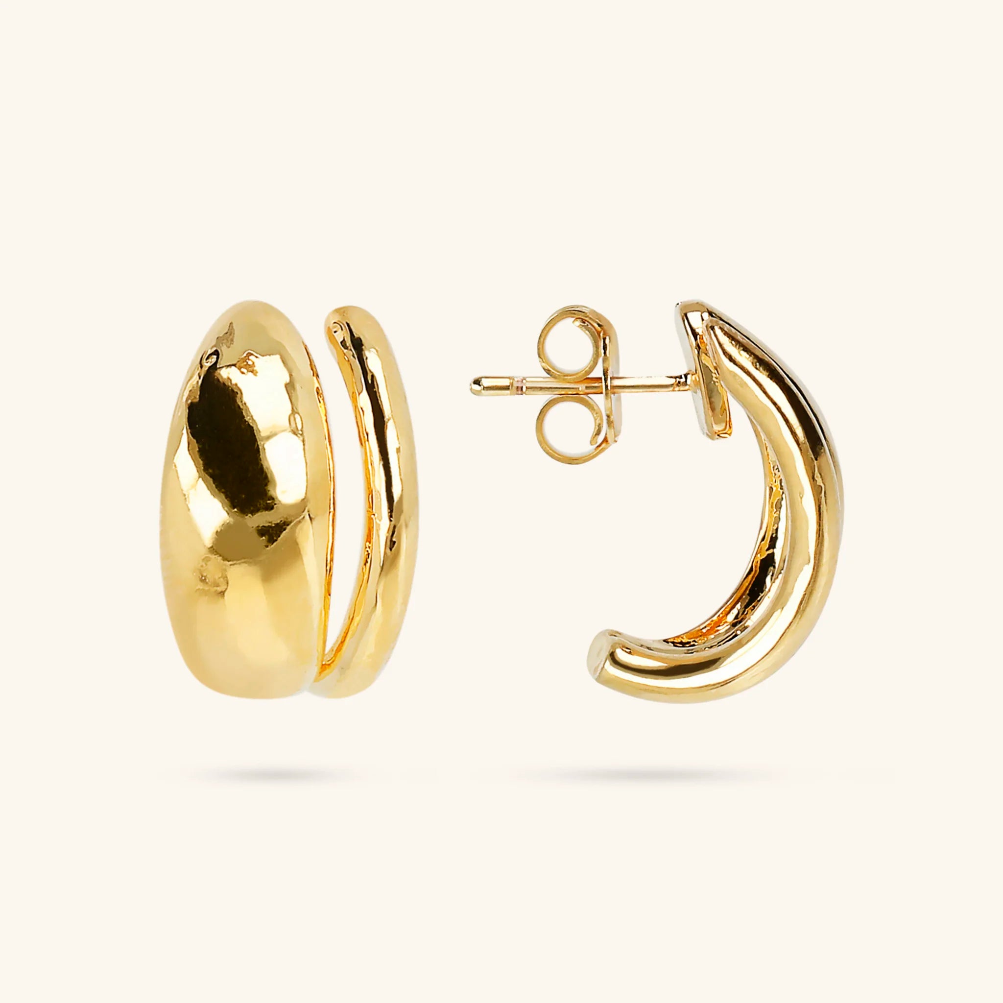 Etrusca Gioielli semicircle earrings mounted on a Golden base, 18kt yellow gold plated, with a classic hammered finish and a duo design that splits the worn product as if it were two overlapping pieces; stud and butterfly closure.