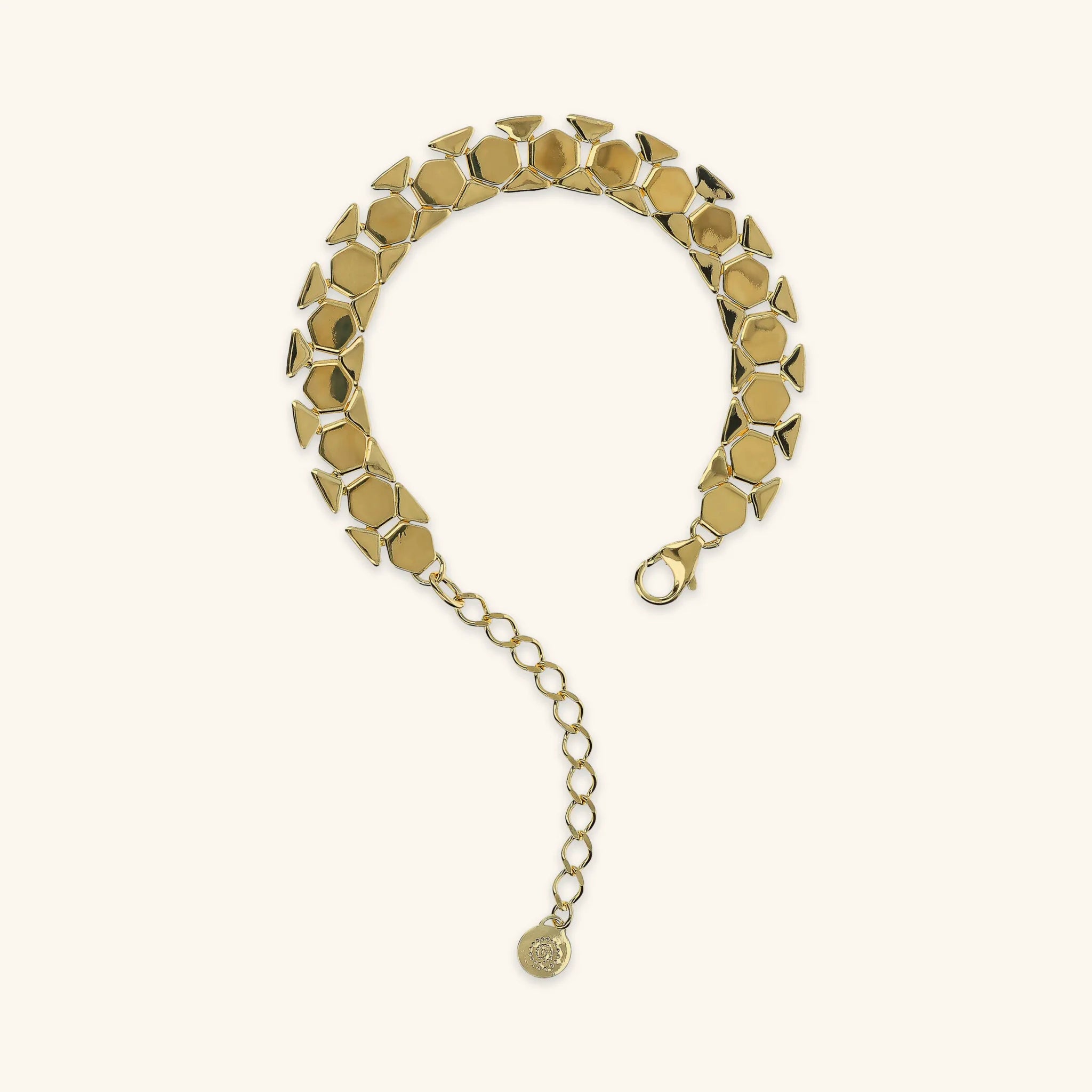 Bracelet Etrusca Gioielli en alliage Golden, doré à l'or jaune fin 18ct, avec lien géométrique plat. Longueur 18,5+3 cm d'extension. Fermoir mousqueton.