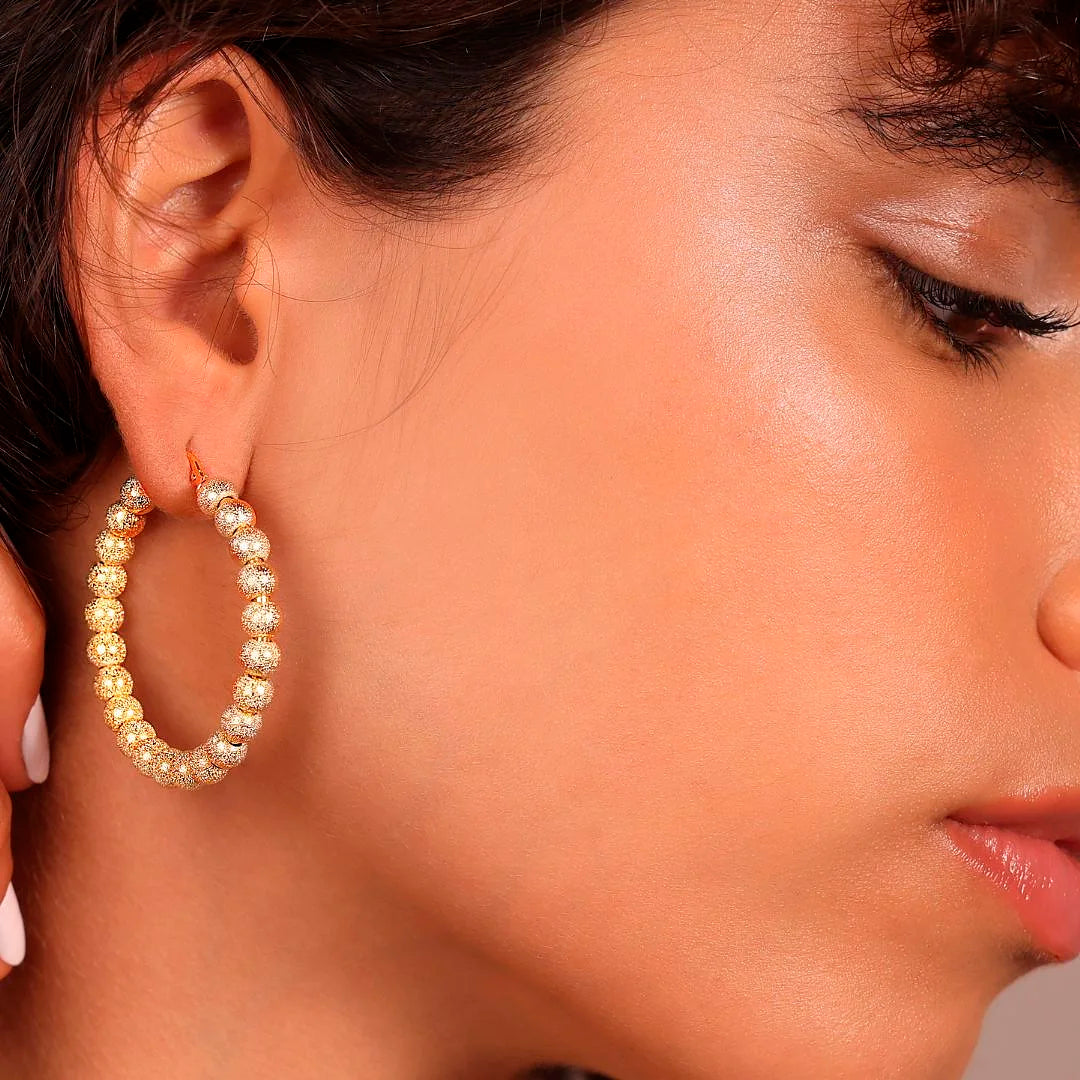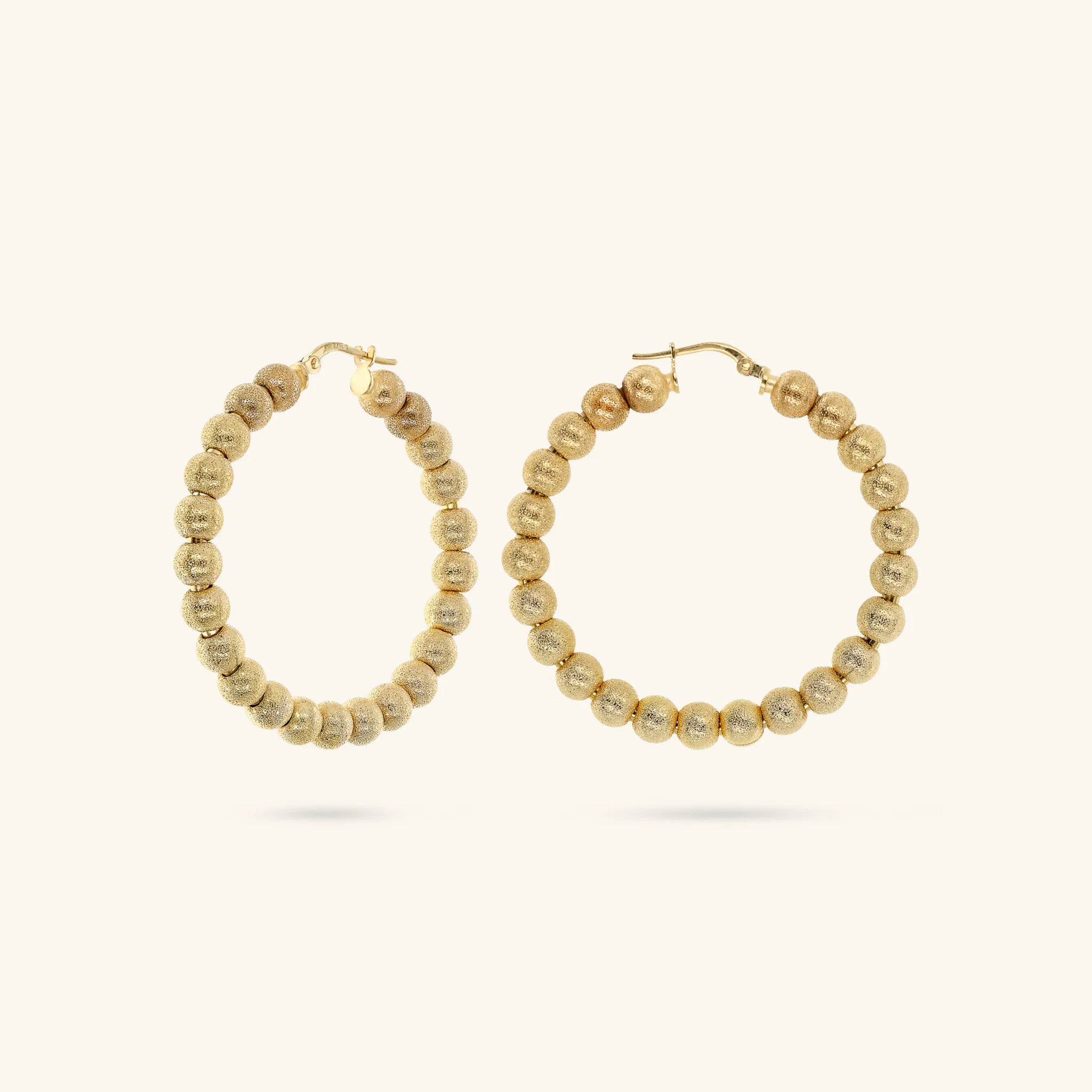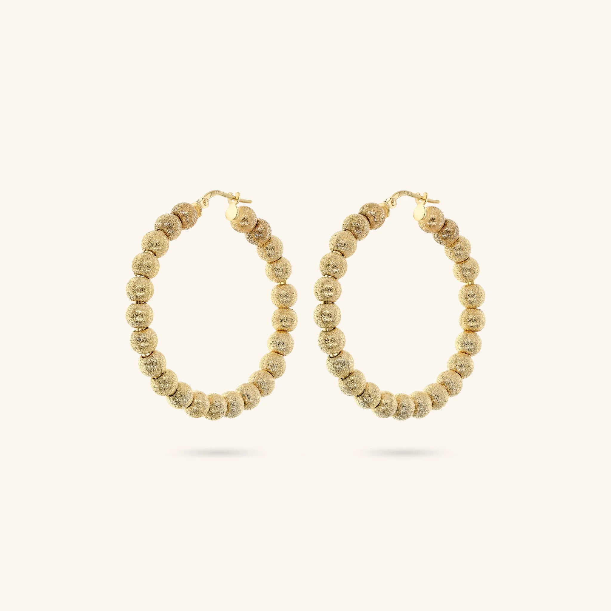 Créoles Etrusca Gioielli en alliage Golden, doré à l'or jaune fin 18ct, avec perles en satin (5 mm). Fermeture à baïonnette. Diamètre extérieur 4 cm.