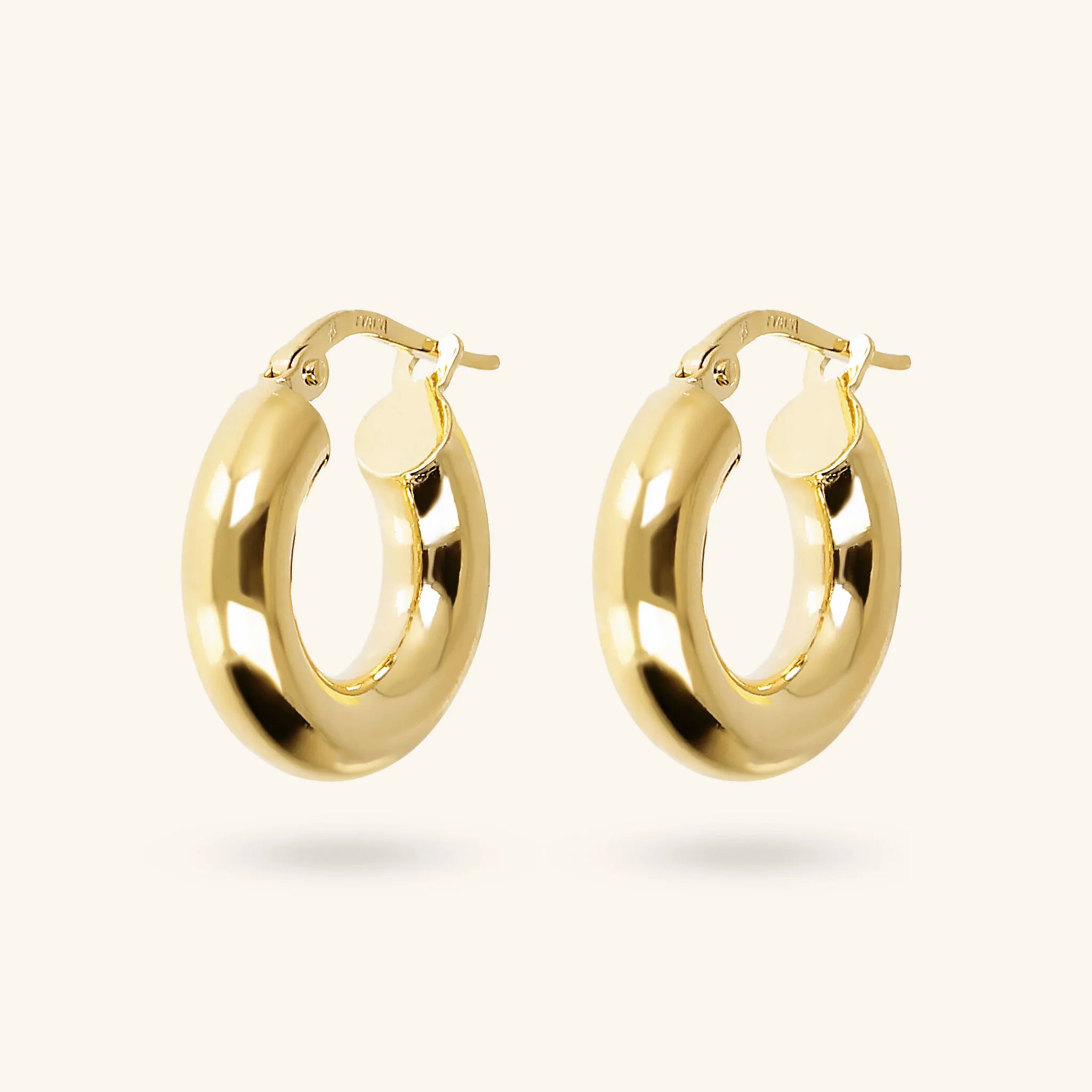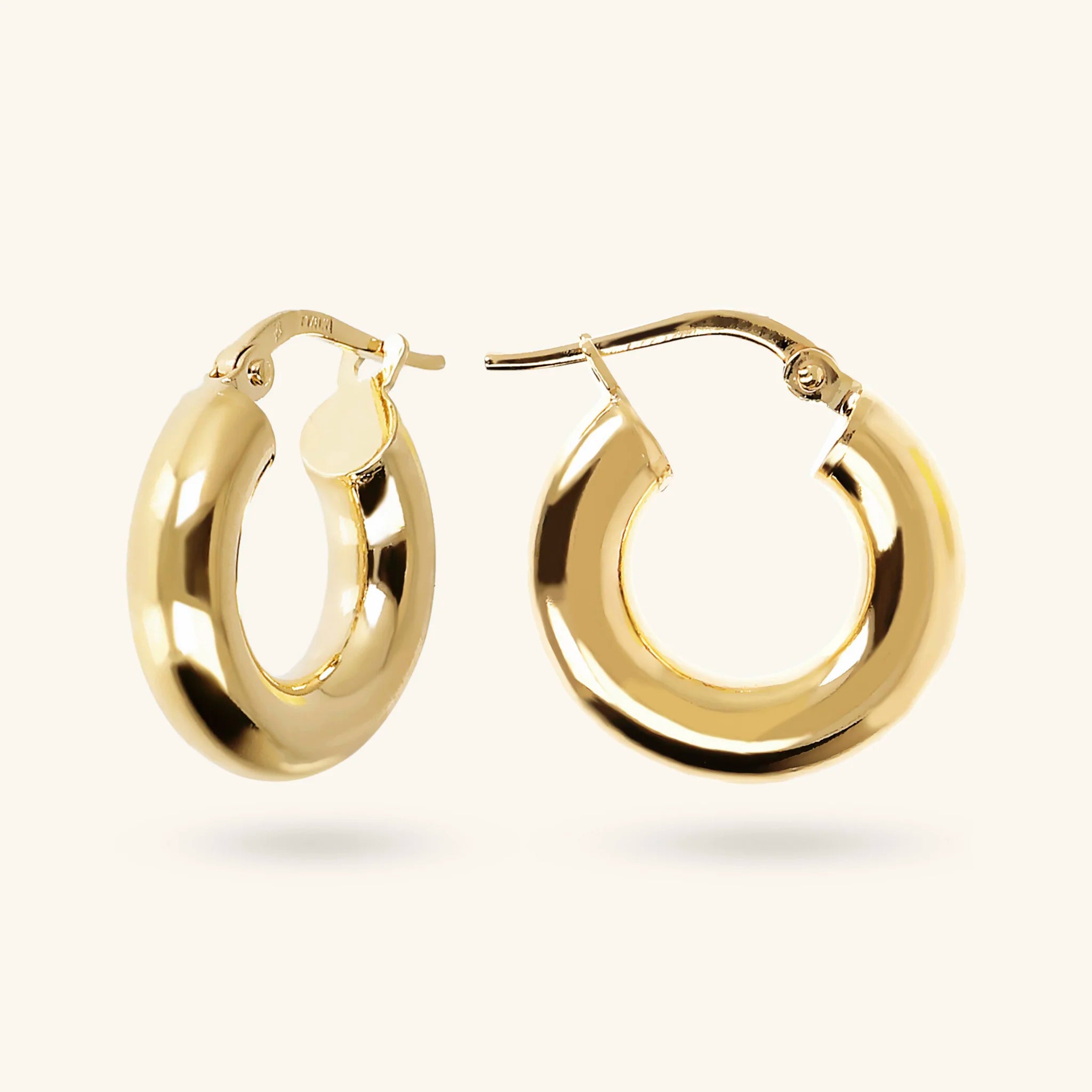Boucles d'oreilles créoles Etrusca Gioielli en alliage Golden, doré à l'or fin 18ct, avec un design épais avec une surface lisse ; fermoir à baïonnette; longueur de 1,7 cm.