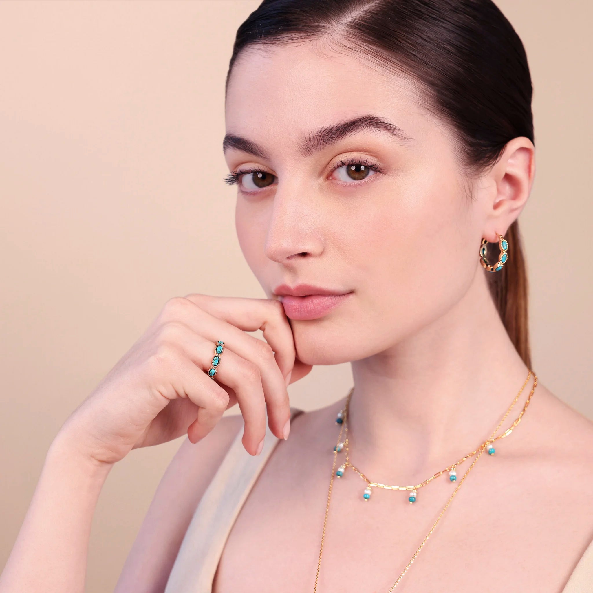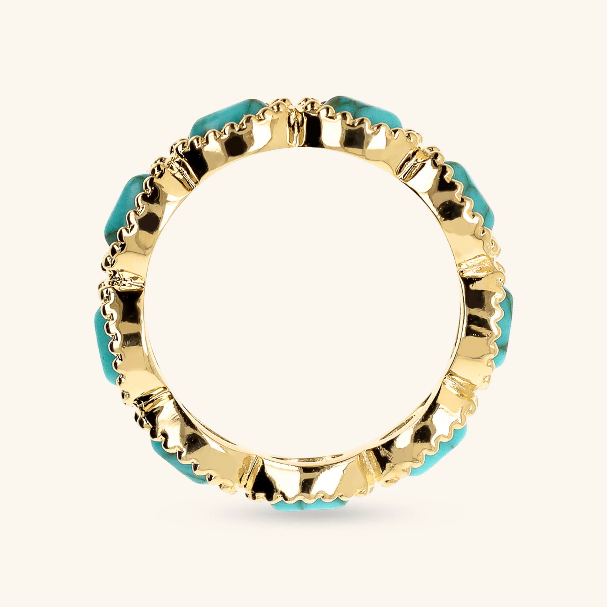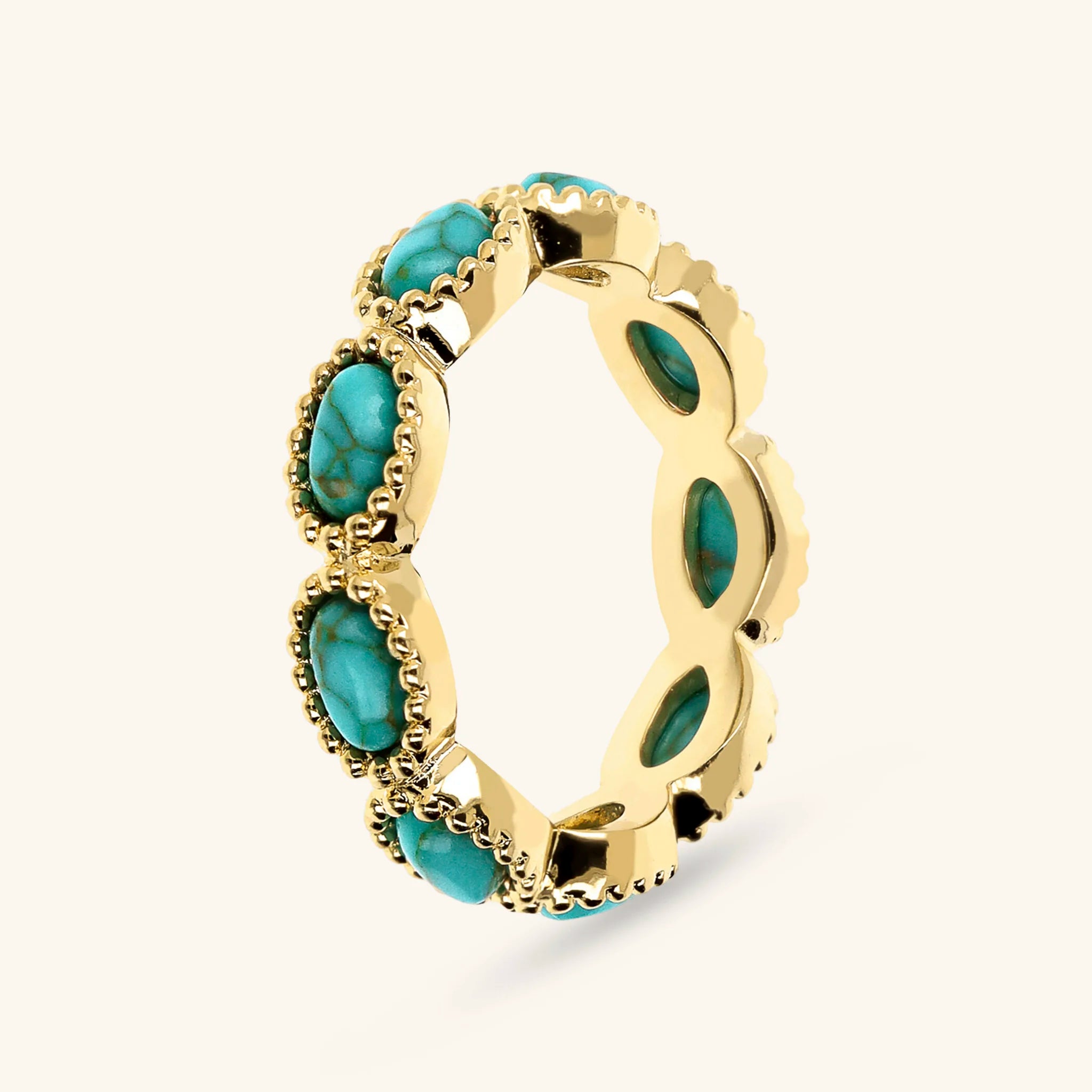 Bague d'éternité montée sur une base dorée, dorée à l'or fin 18ct, agrémentée de turquoises de forme ovale.