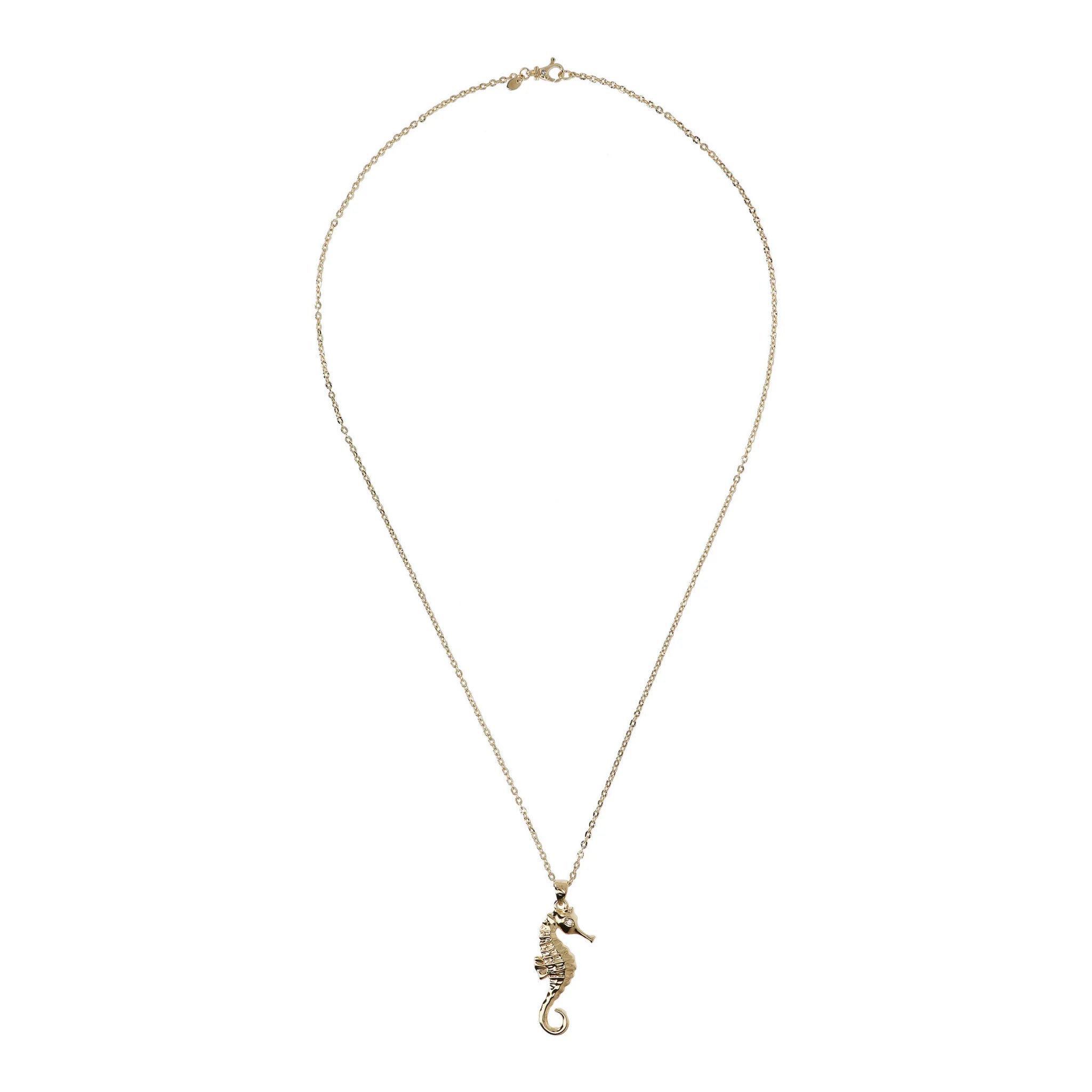 Collier matinée Etrusca Gioielli en alliage Golden, doré à l'or fin 18ct, avec chaîne forcée en diamants agrémentée d'un pendentif martelé en forme d'hippocampe avec un point lumineux en zircone cubique blanche, qualité lumineuse; Fermoir à homard.
