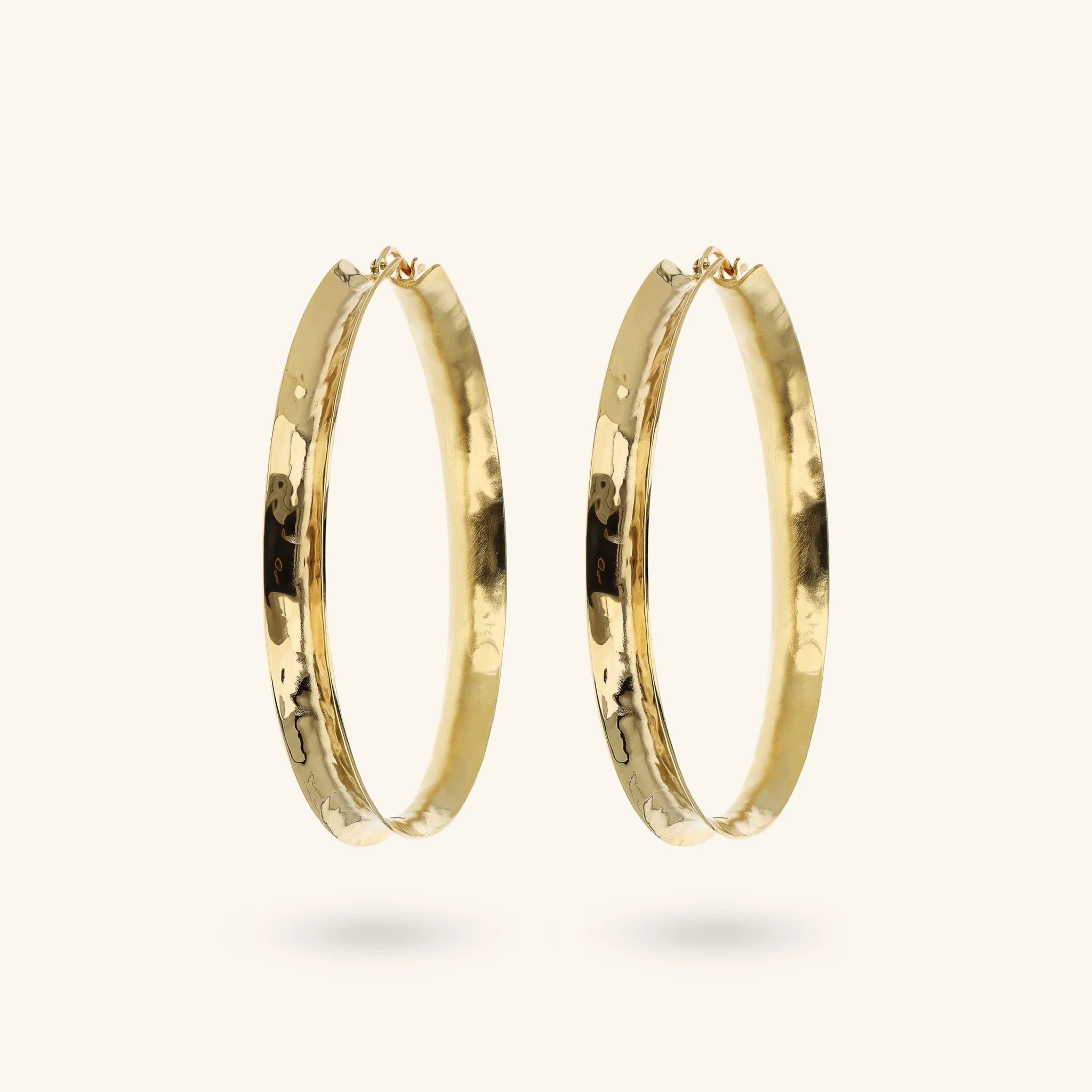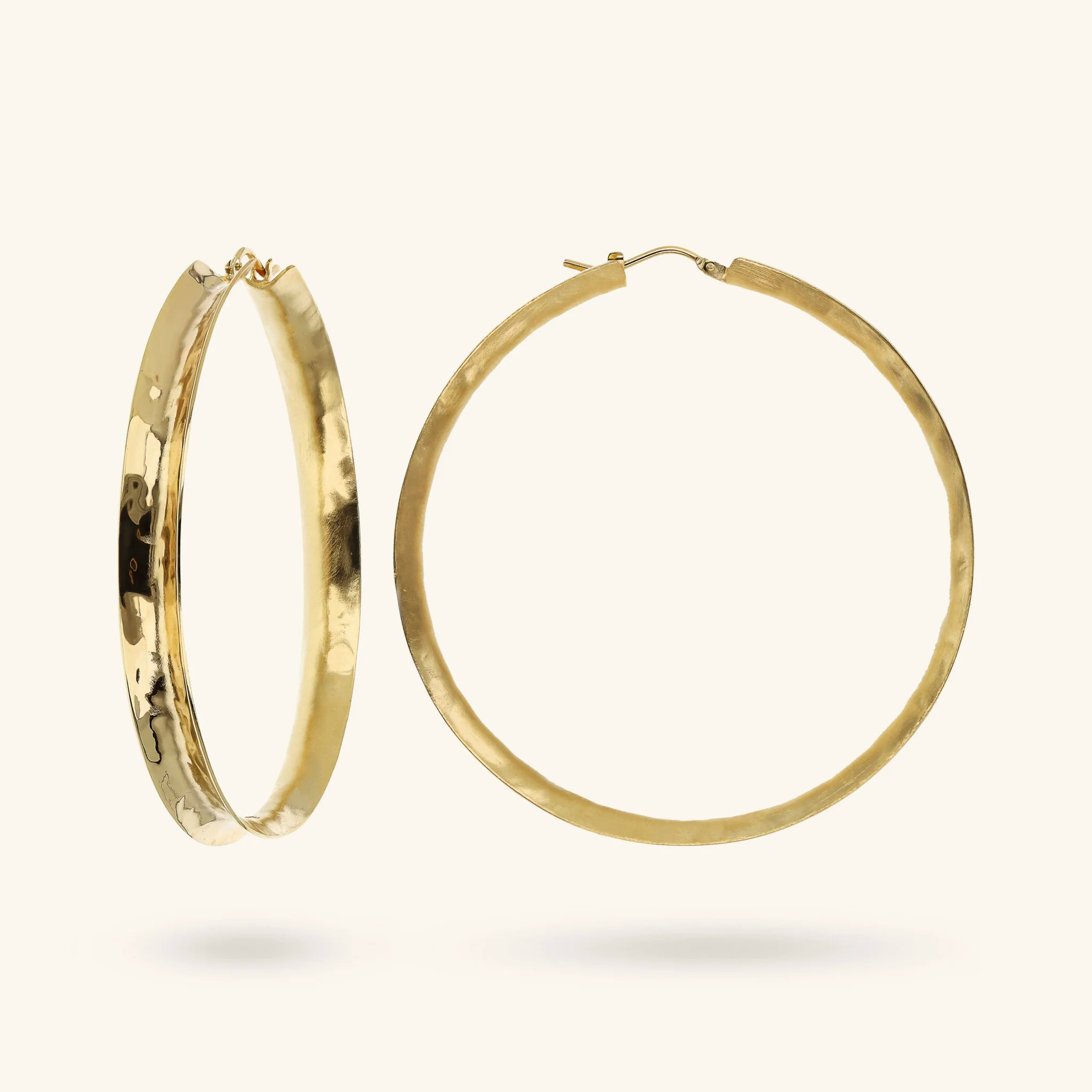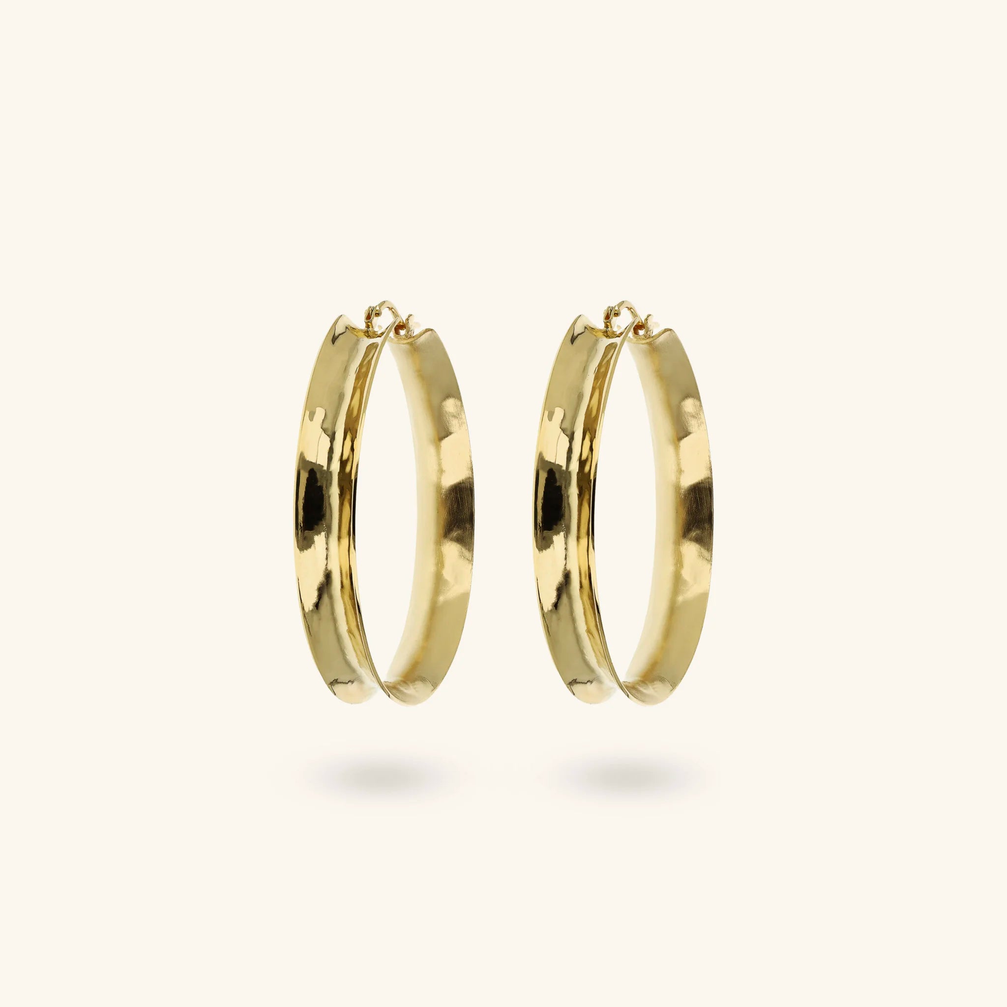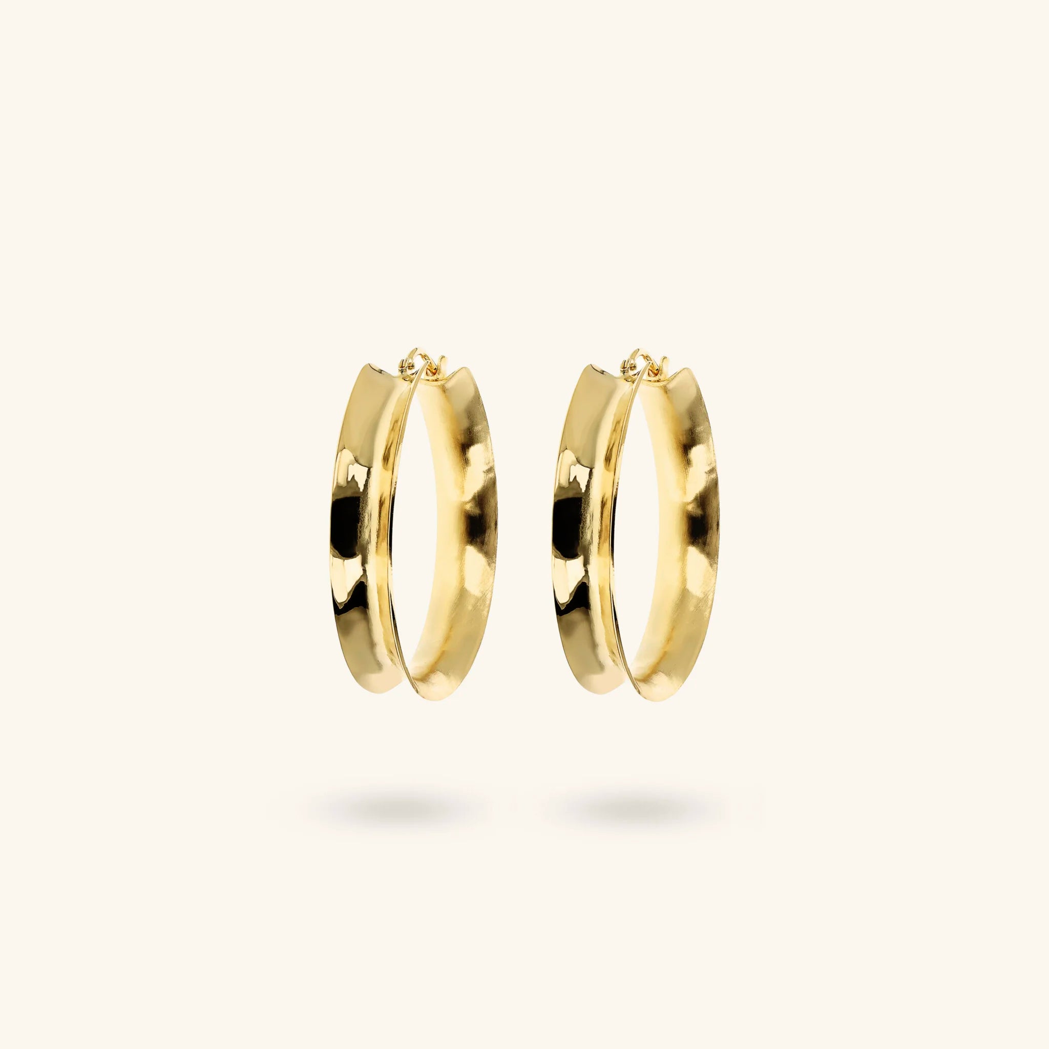 Boucles d'oreilles créoles Etrusca Gioielli en alliage Golden, doré à l'or jaune fin 18ct, avec surface concave martelée. Fermeture à baïonnette. Disponible en trois tailles : Small (diamètre externe 2,5 cm) / Medium (diamètre externe 4 cm) / Large (diamètre externe 5 cm).