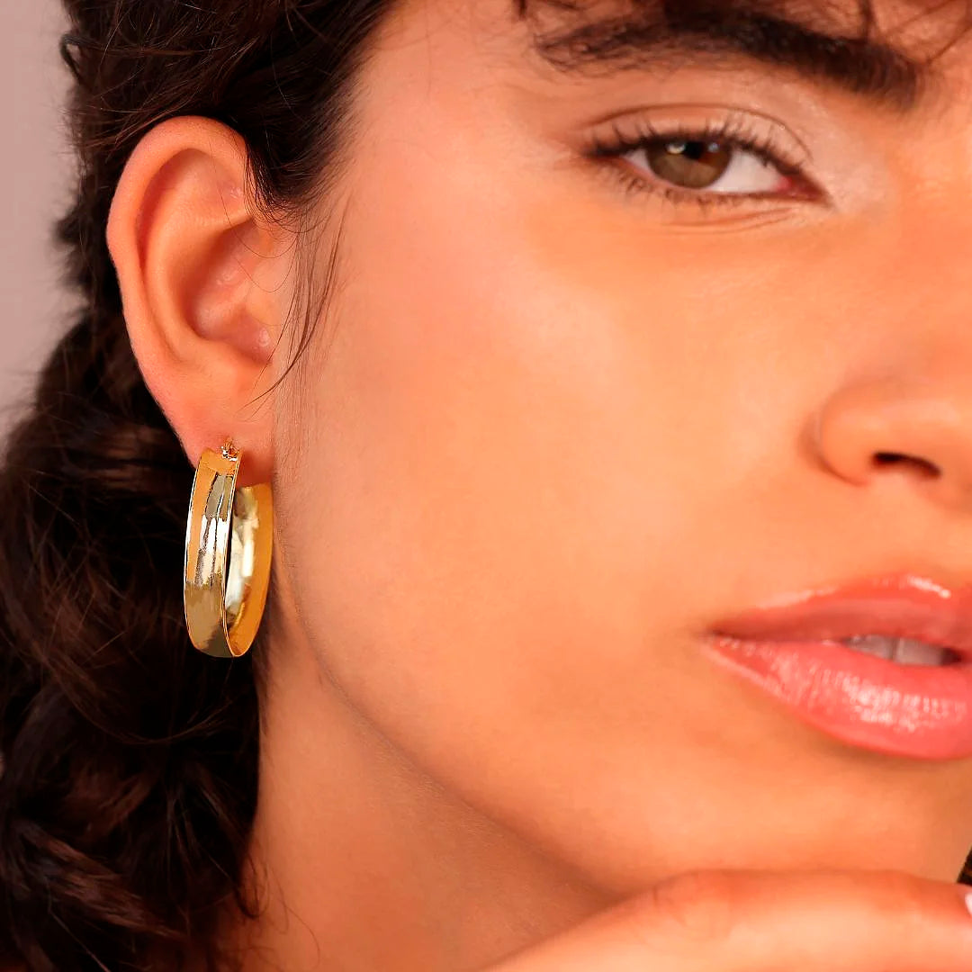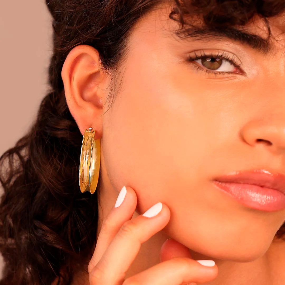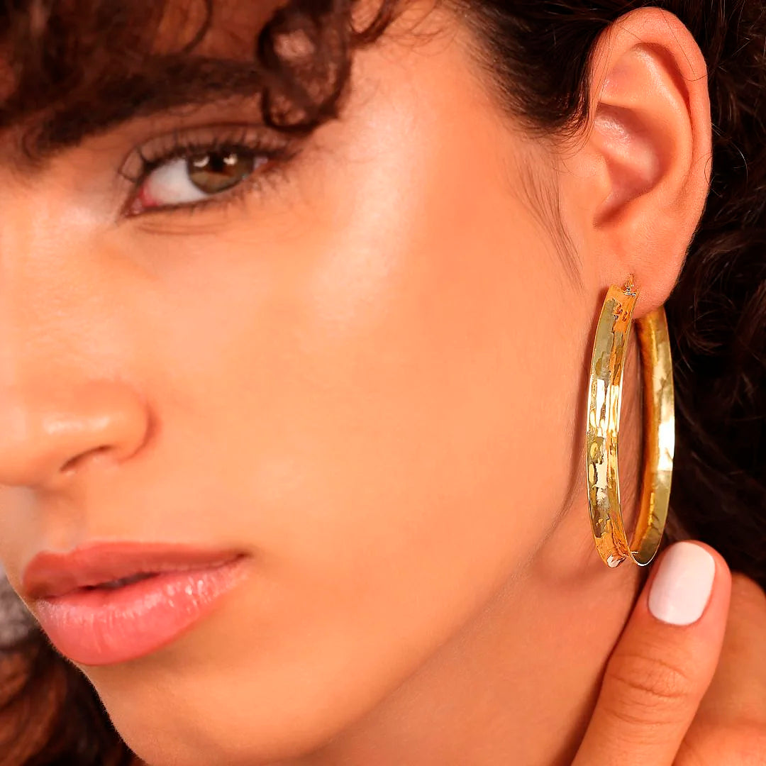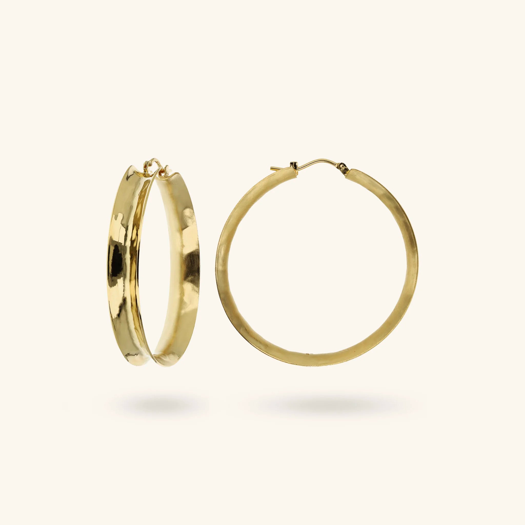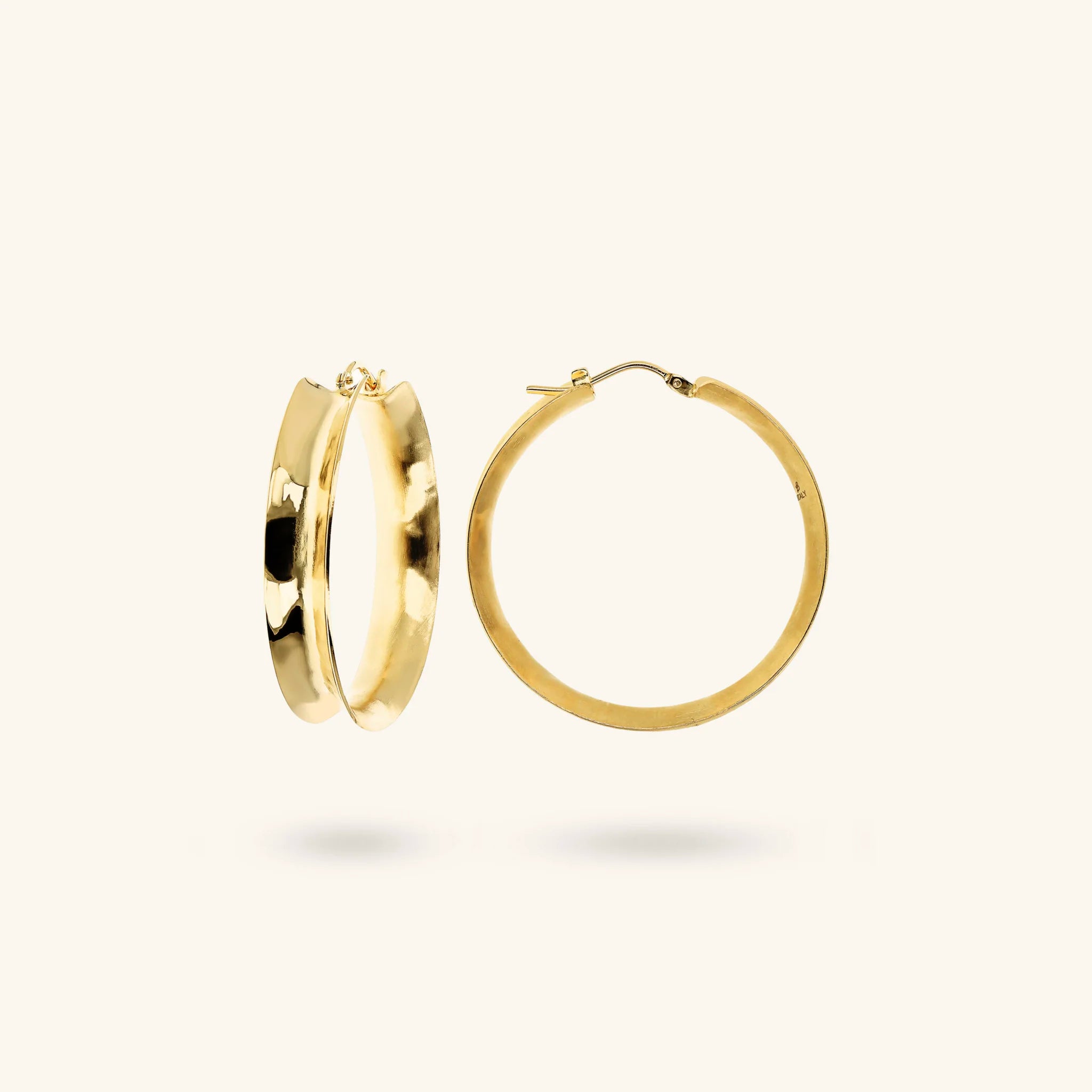 Boucles d'oreilles créoles Etrusca Gioielli en alliage Golden, doré à l'or jaune fin 18ct, avec surface concave martelée. Fermeture à baïonnette. Disponible en trois tailles : Small (diamètre externe 2,5 cm) / Medium (diamètre externe 4 cm) / Large (diamètre externe 5 cm).