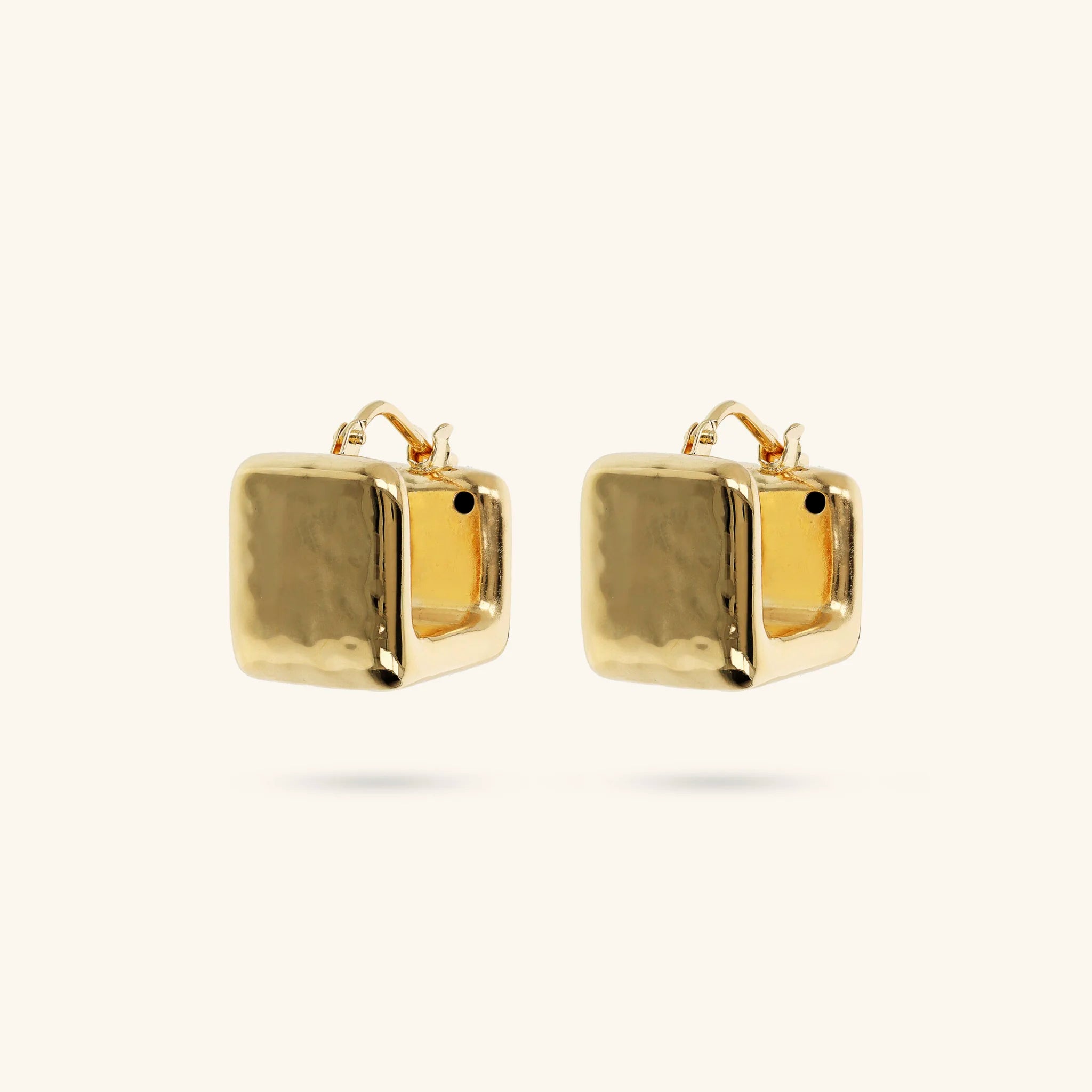 Boucles d'oreilles créoles Etrusca Gioielli réalisées sur une base dorée, dorée à l'or fin 18ct, de forme carrée avec une surface martelée ; fermoir à baïonnette.