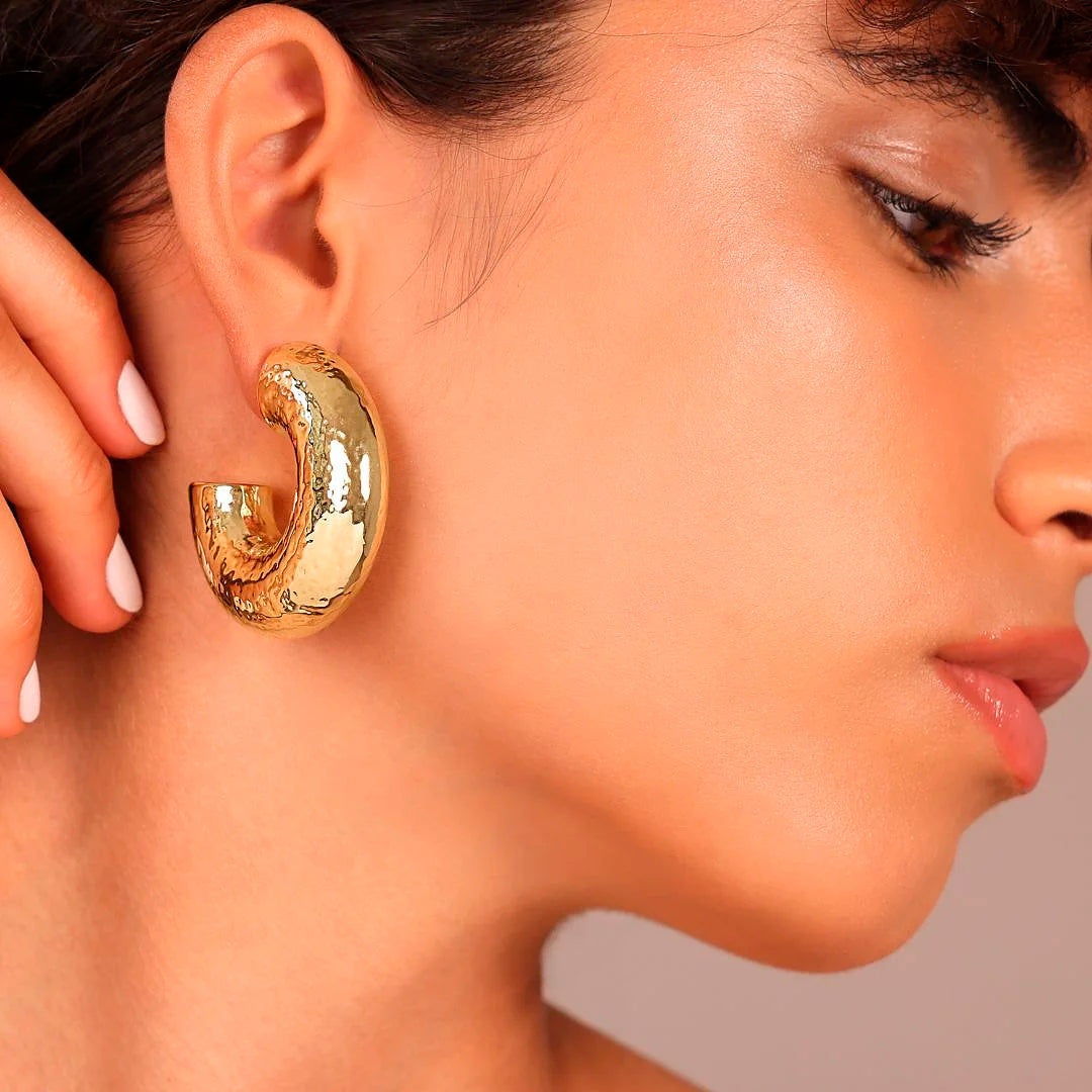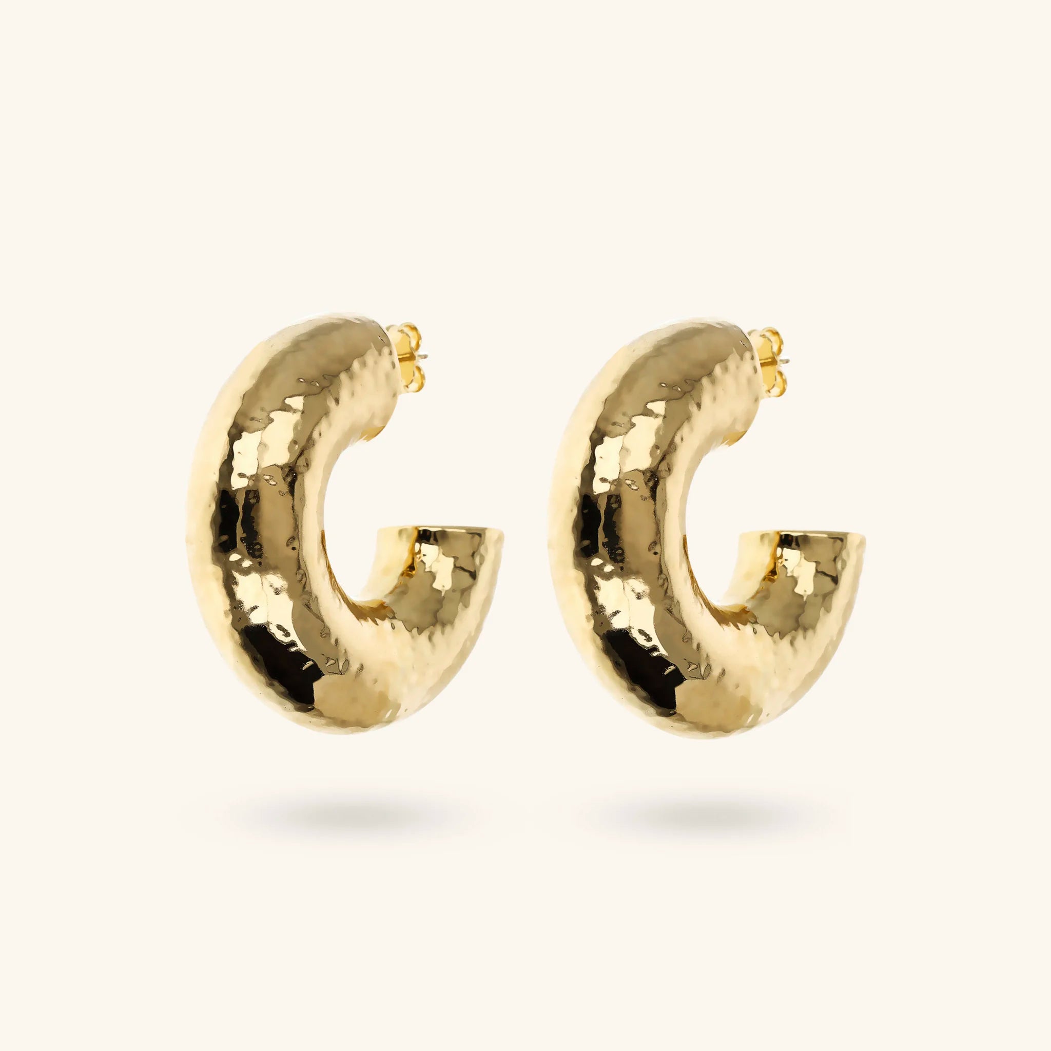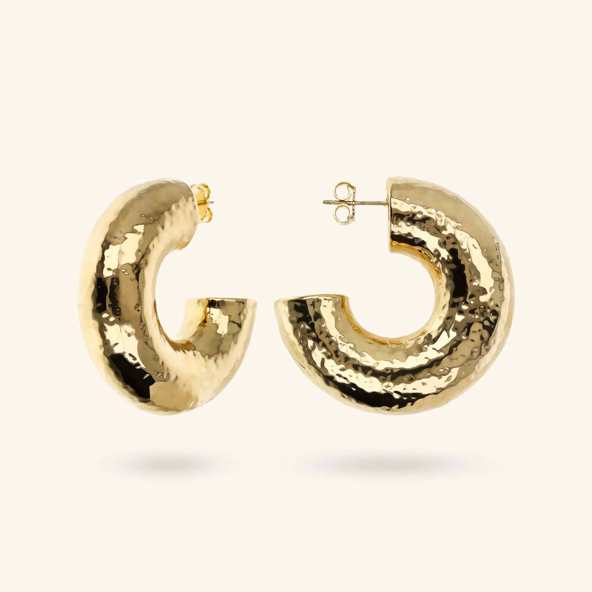 Boucles d'oreilles lobe Etrusca Gioielli en alliage Golden, doré à l'or jaune fin 18ct, avec un design en demi-cercle avec surface martelée. Diamètre 42 mm. Épaisseur 13 mm. Fermeture épingle et papillon.