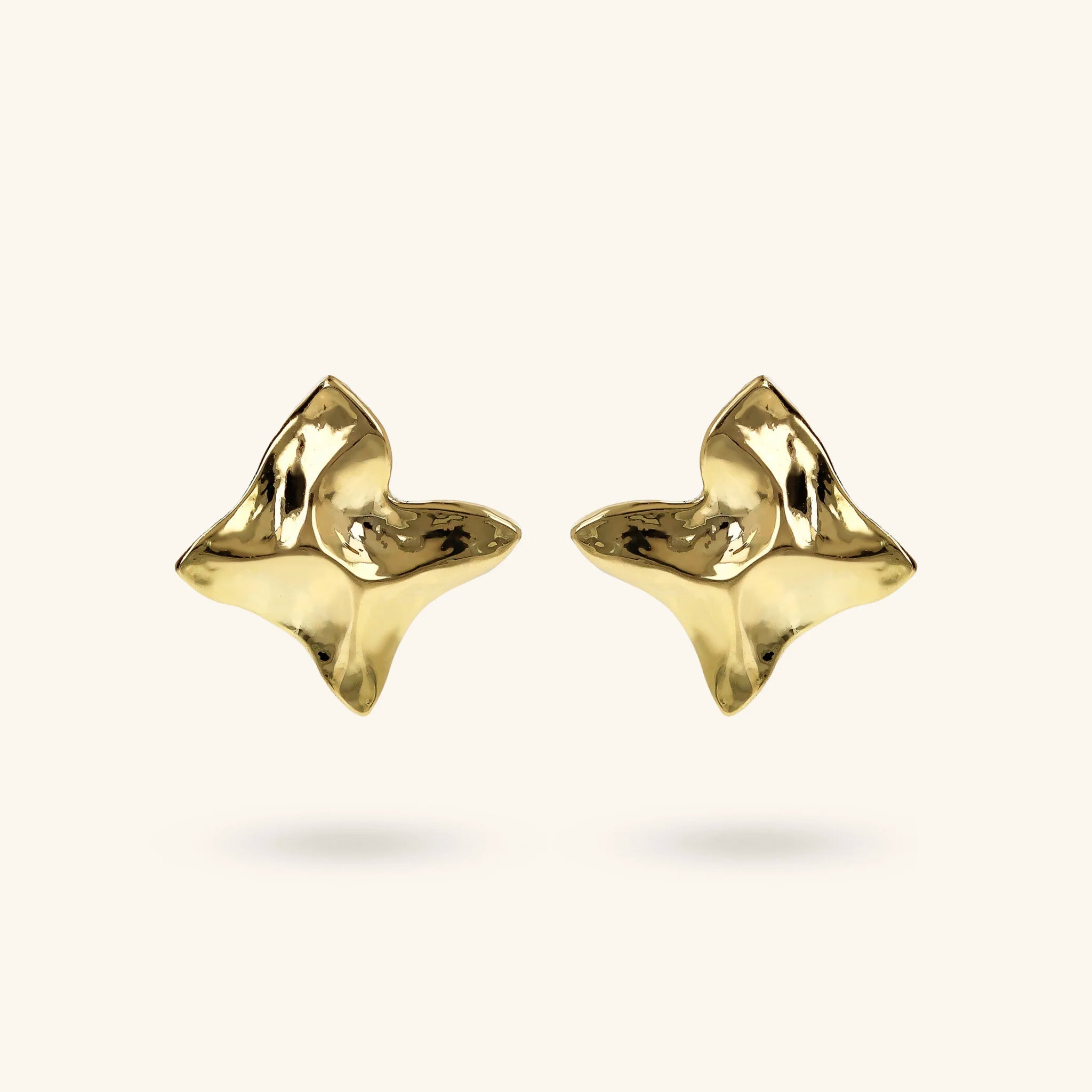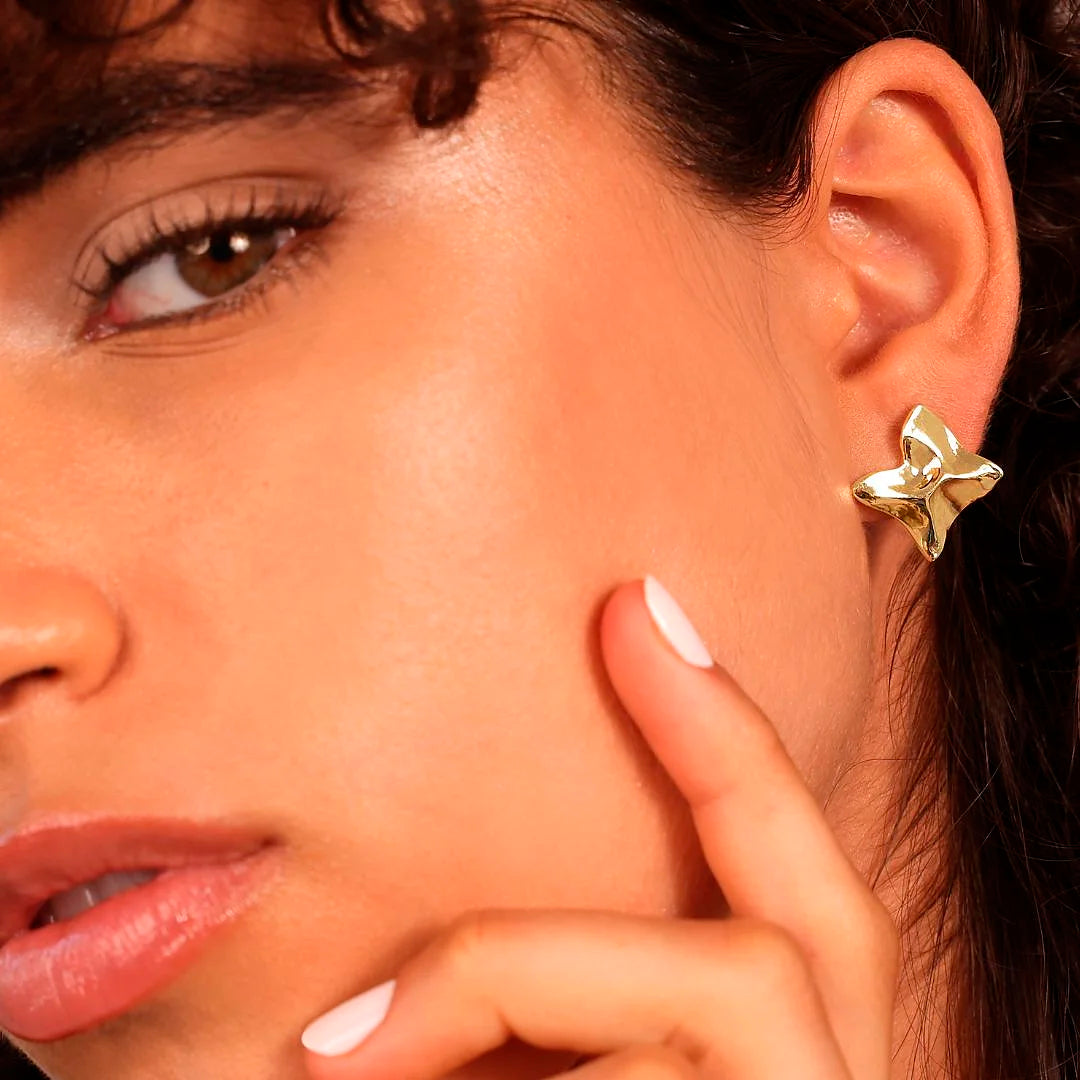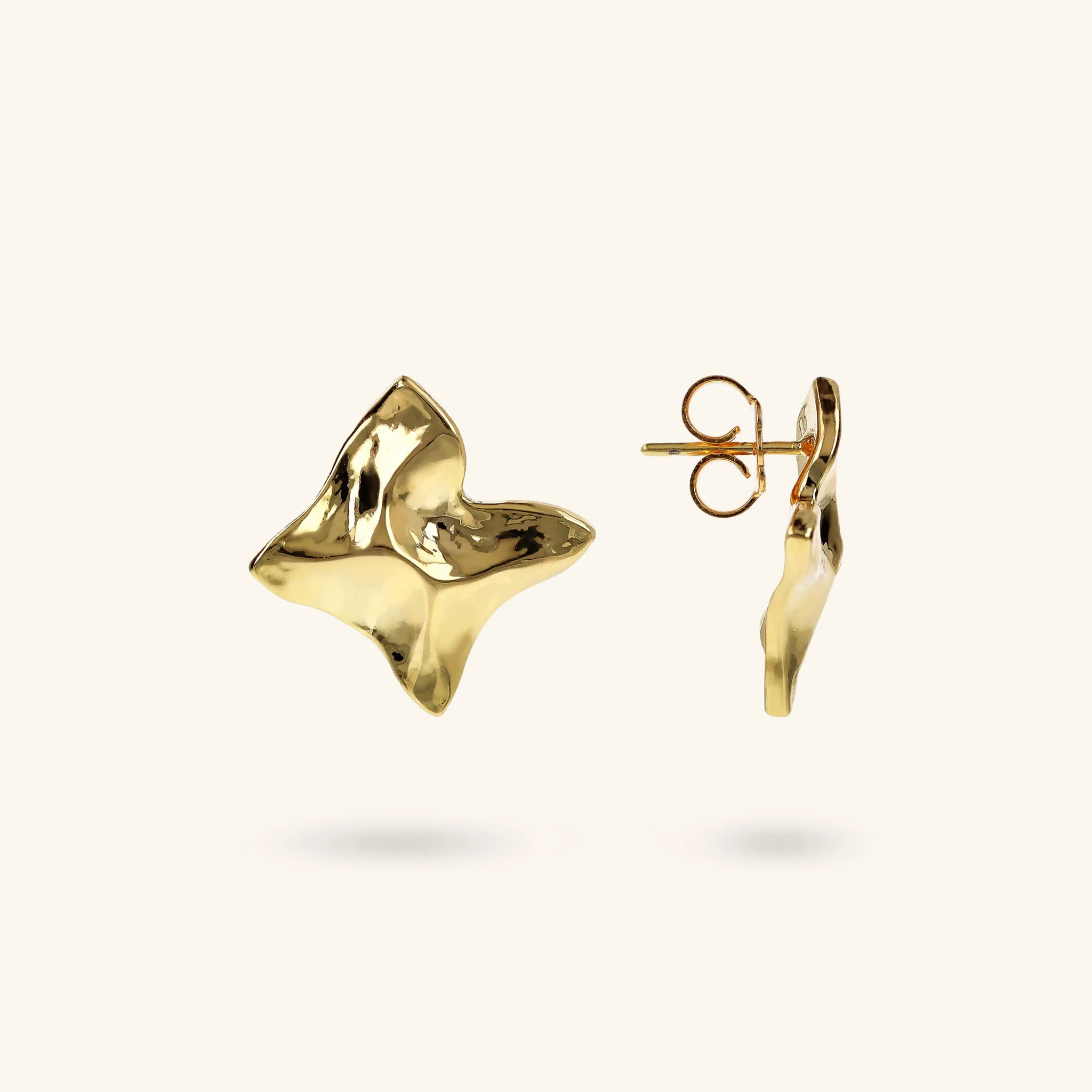 Boucles d'oreilles lobe Etrusca Gioielli en alliage Golden, doré à l'or jaune fin 18ct, avec un motif étoile à quatre branches avec surface martelée. Fermeture épingle et papillon.
