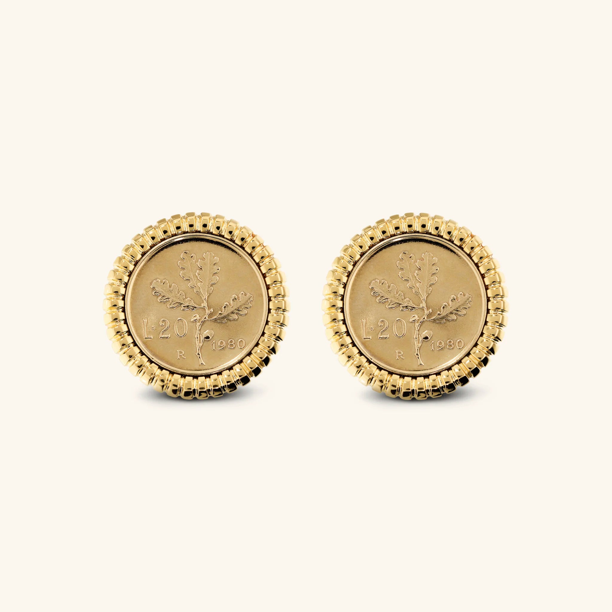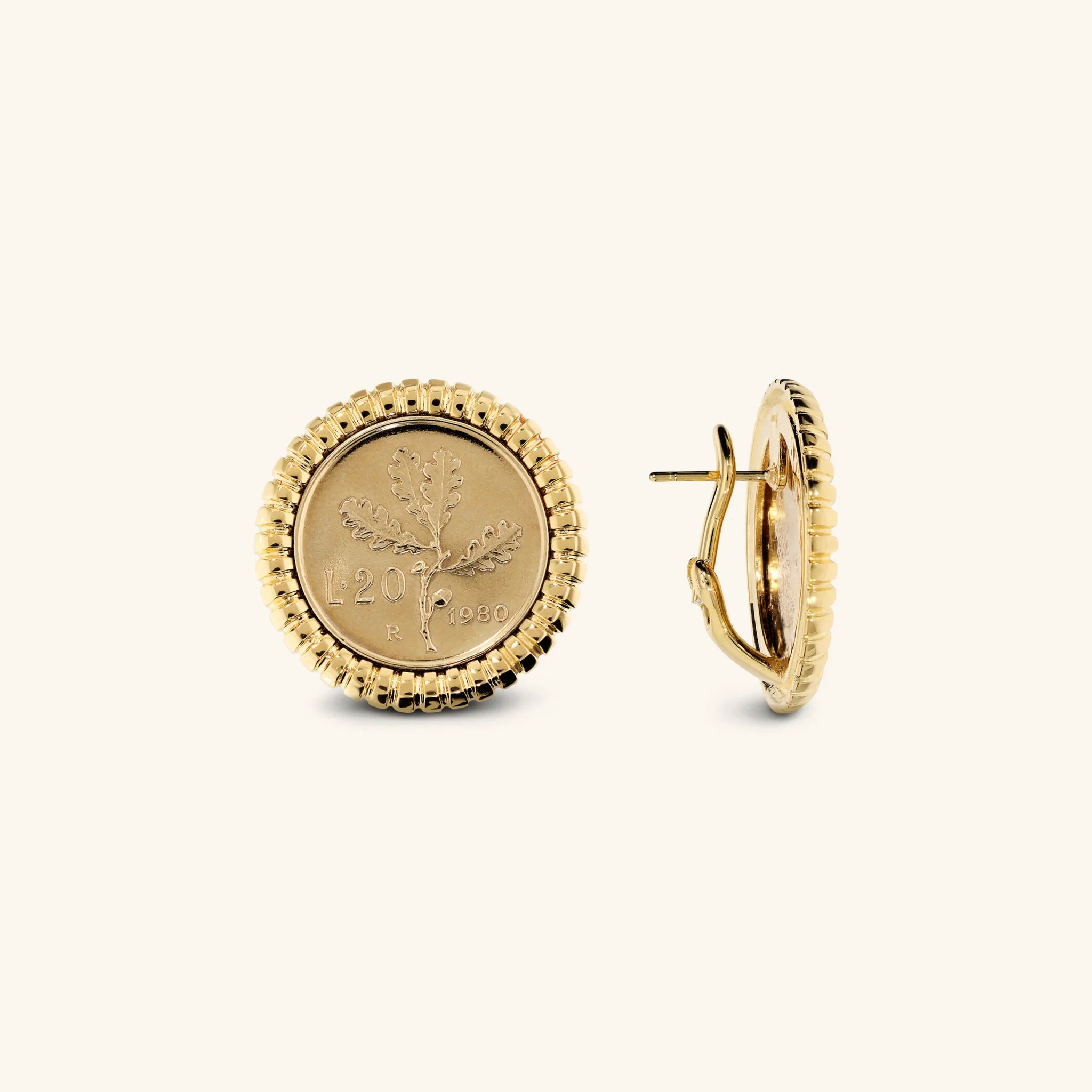 Boucles d'oreilles à lobe Etrusca Bijoux réalisés en alliage Golden, doré à l'or jaune fin 18ct, avec une pièce originale de 20 lires et un bord à texture striée. Fermeture à tige et clip.