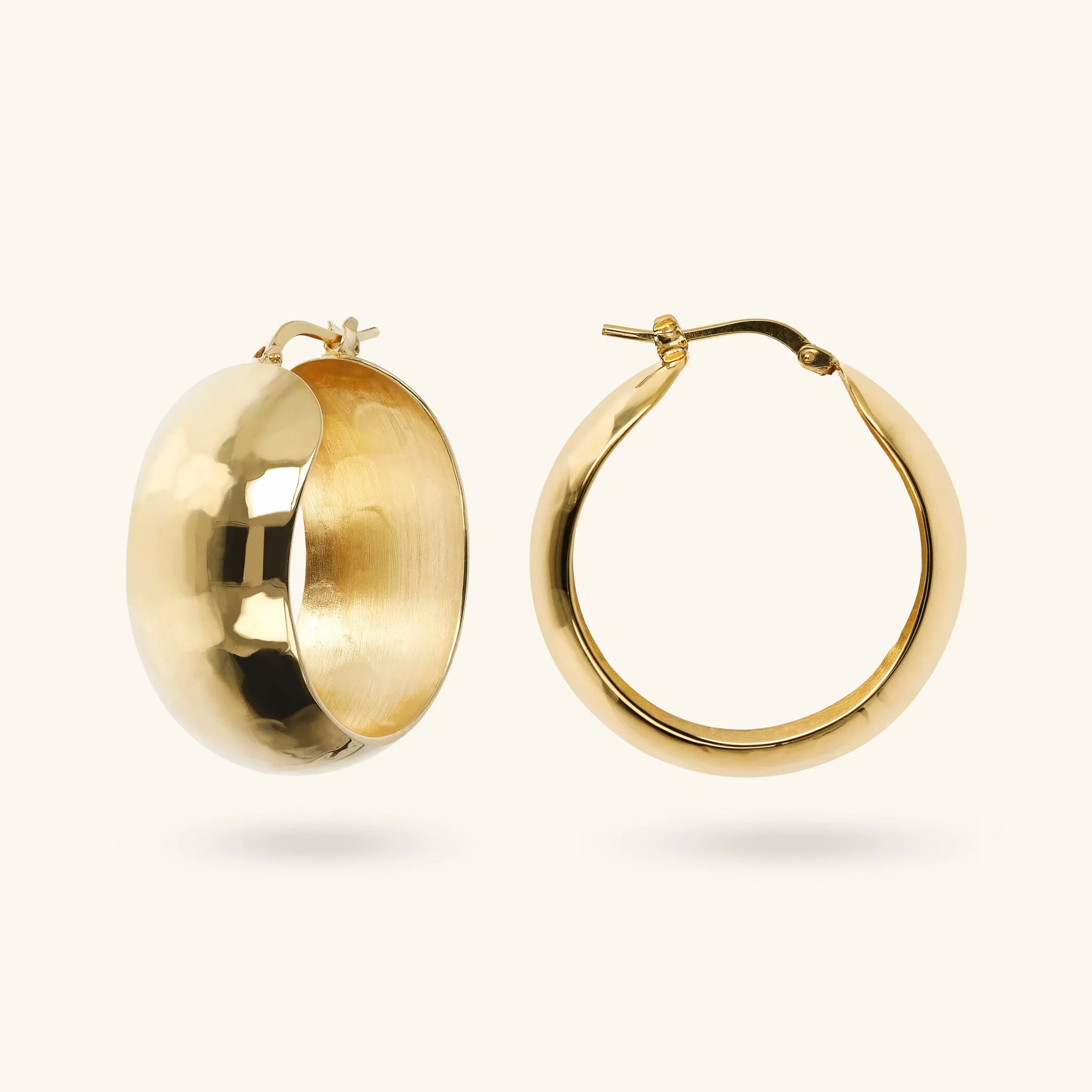 Boucles d'oreilles pendantes Etrusca Gioielli montées sur une base dorée, dorées à l'or fin 18ct, agrémentées d'anneaux concentriques plats à surface martelée ; fermoir à crochet; longueur de 3 cm.