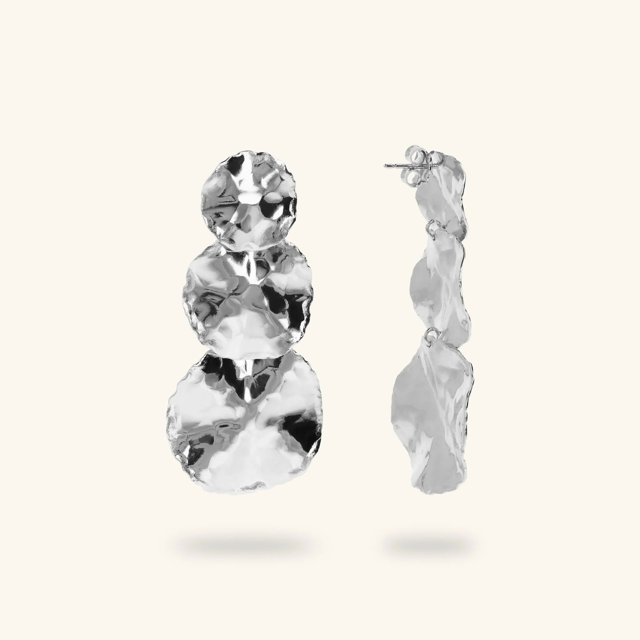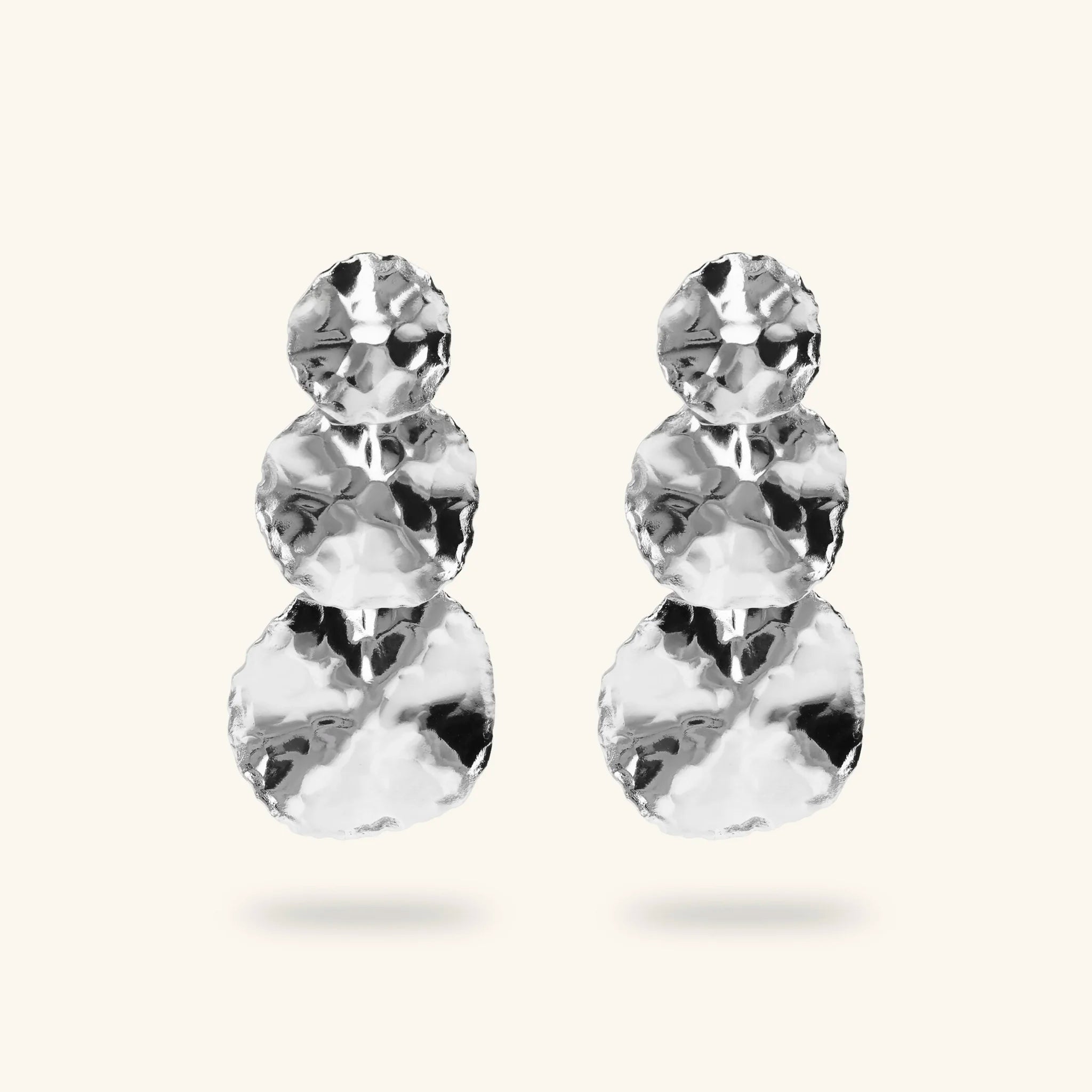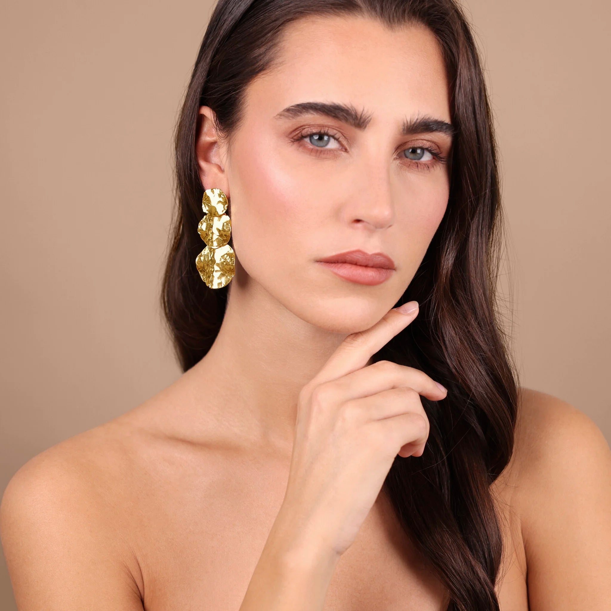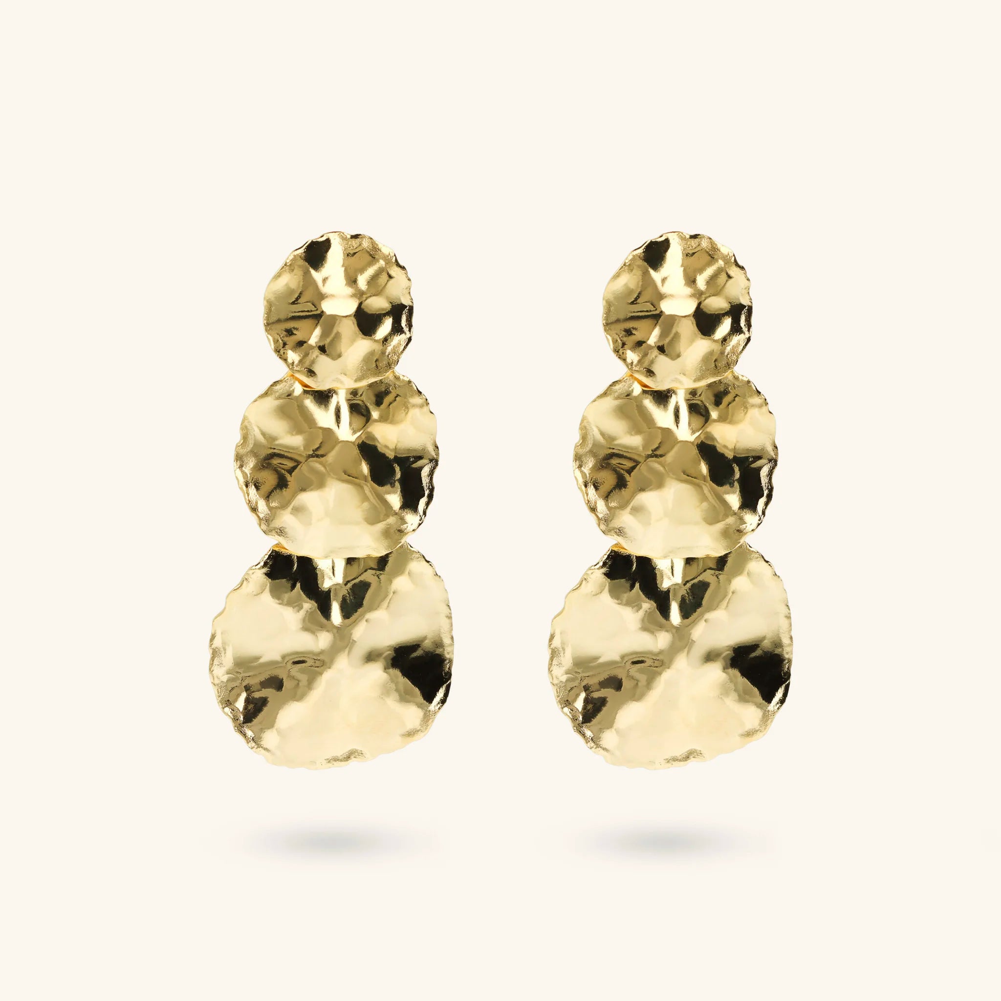 Boucles d'oreilles pendantes Etrusca Bijoux réalisées en alliage doré, plaqué or jaune 18kt, avec trois disques gradués (18-24-30 mm) et surface martelée. Longueur 6 cm. Fermeture à tige et papillon.