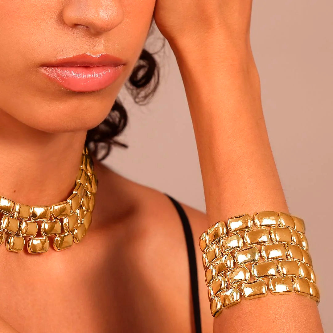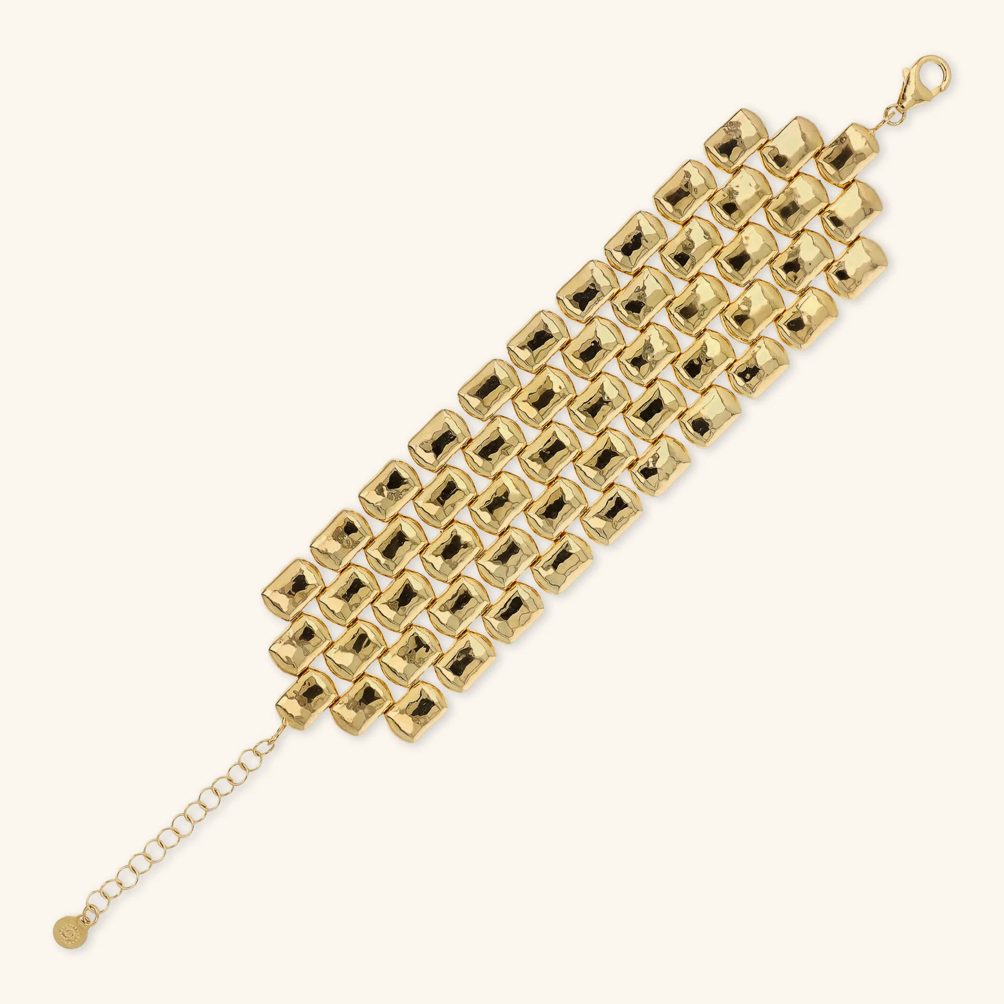 Bracelet bandeau Etrusca Gioielli en alliage Golden, doré à l'or jaune fin 18ct, avec maillon maxi panthère avec une grande surface martelée. Largeur de surface (5 cm). Longueur 19+5,5 cm d'extension. Fermoir mousqueton.