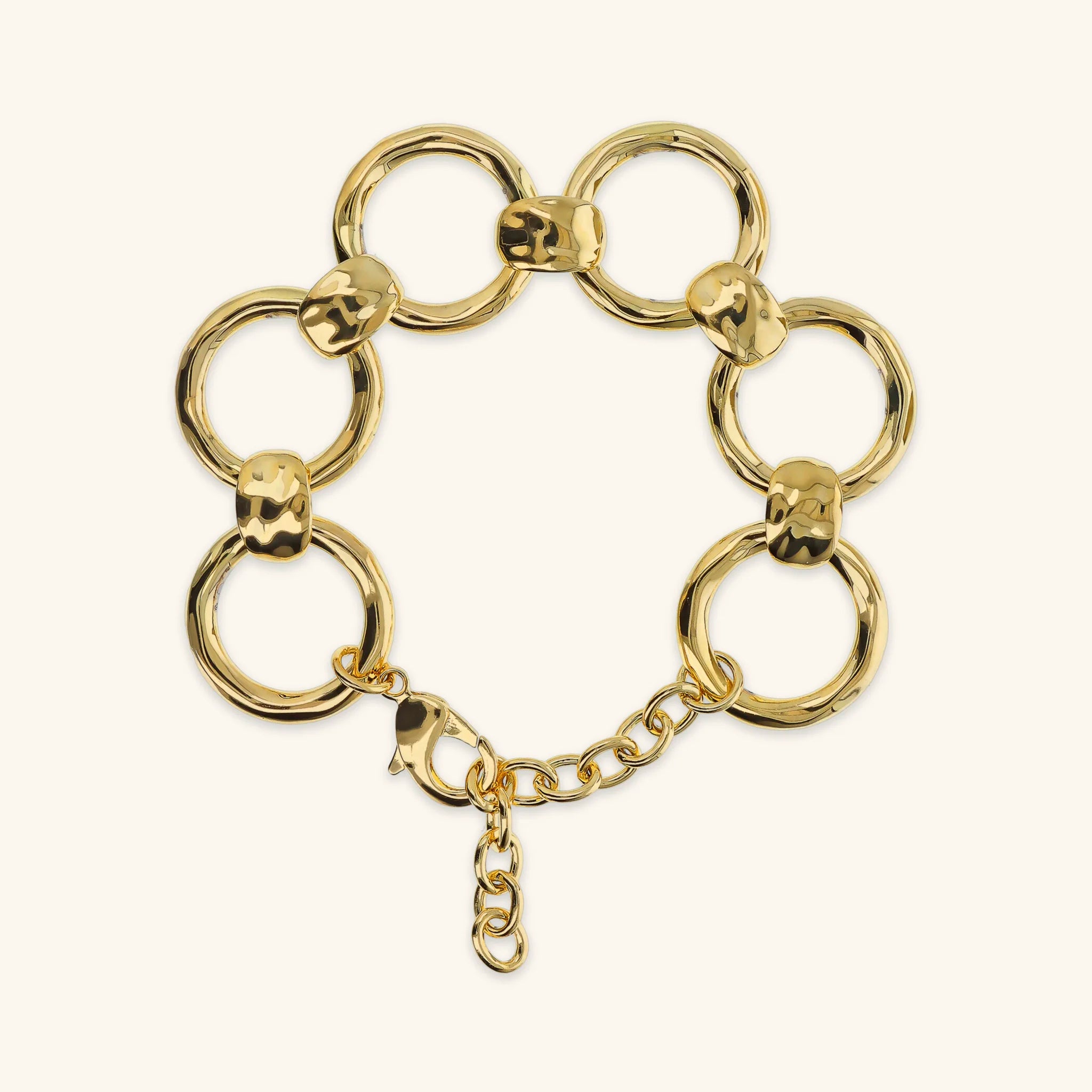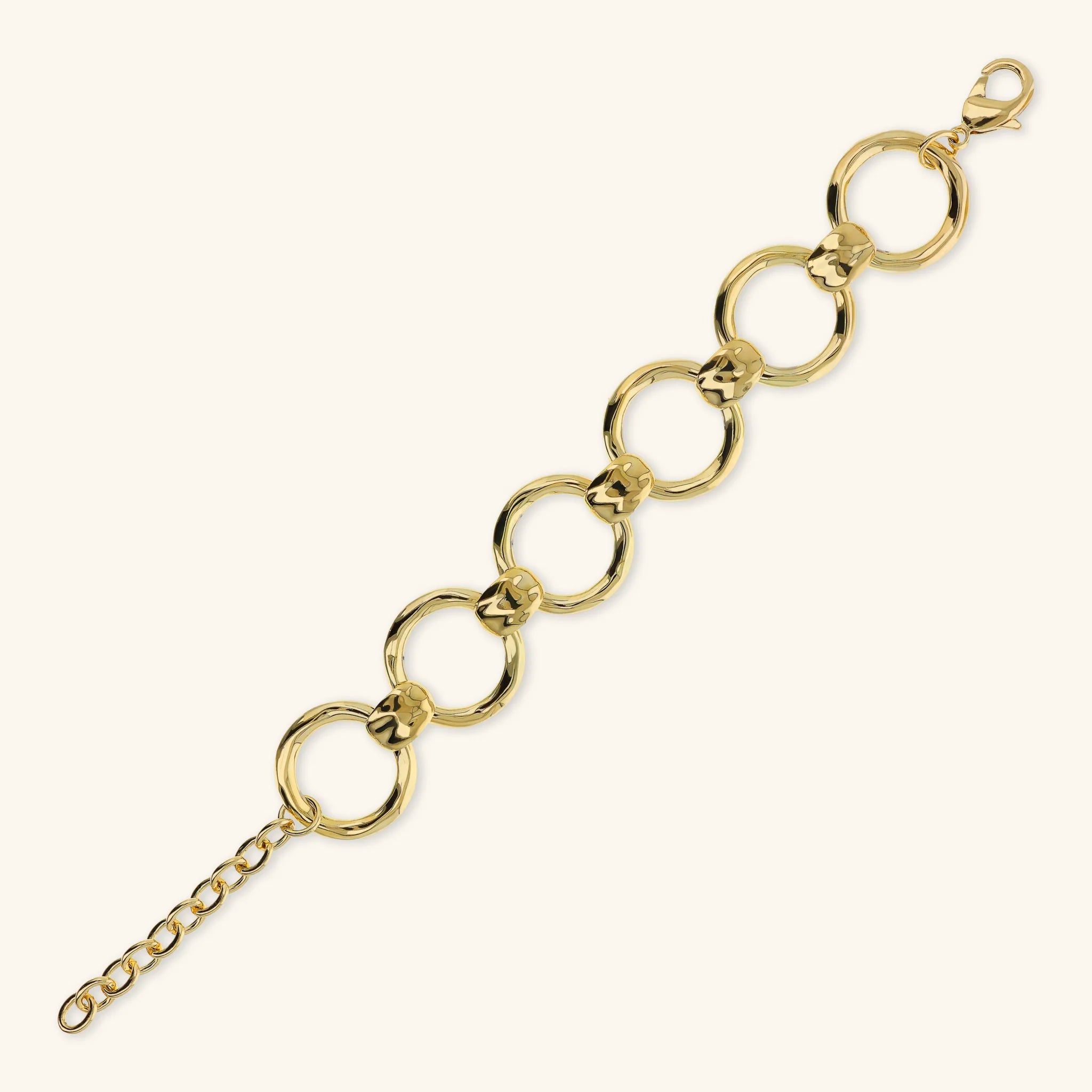 Bracelet Etrusca Gioielli en alliage Golden, doré à l'or jaune fin 18ct, avec des anneaux (24,5 mm) alternés de pépites plates. Surface martelée. Longueur 18+5 cm de rallonge. Fermoir mousqueton.