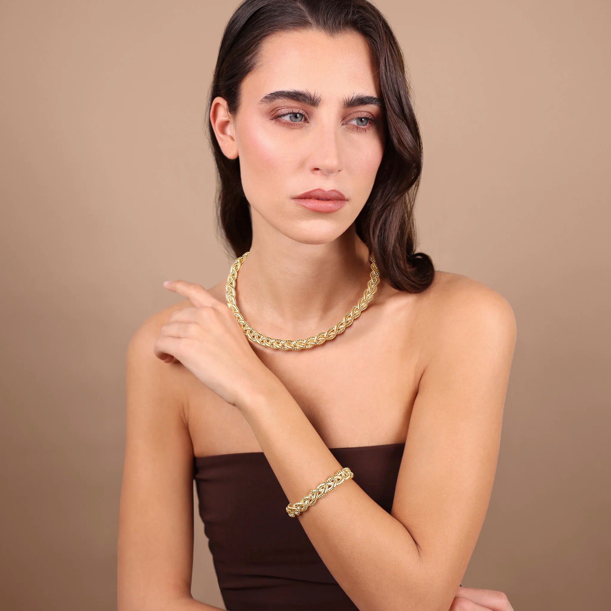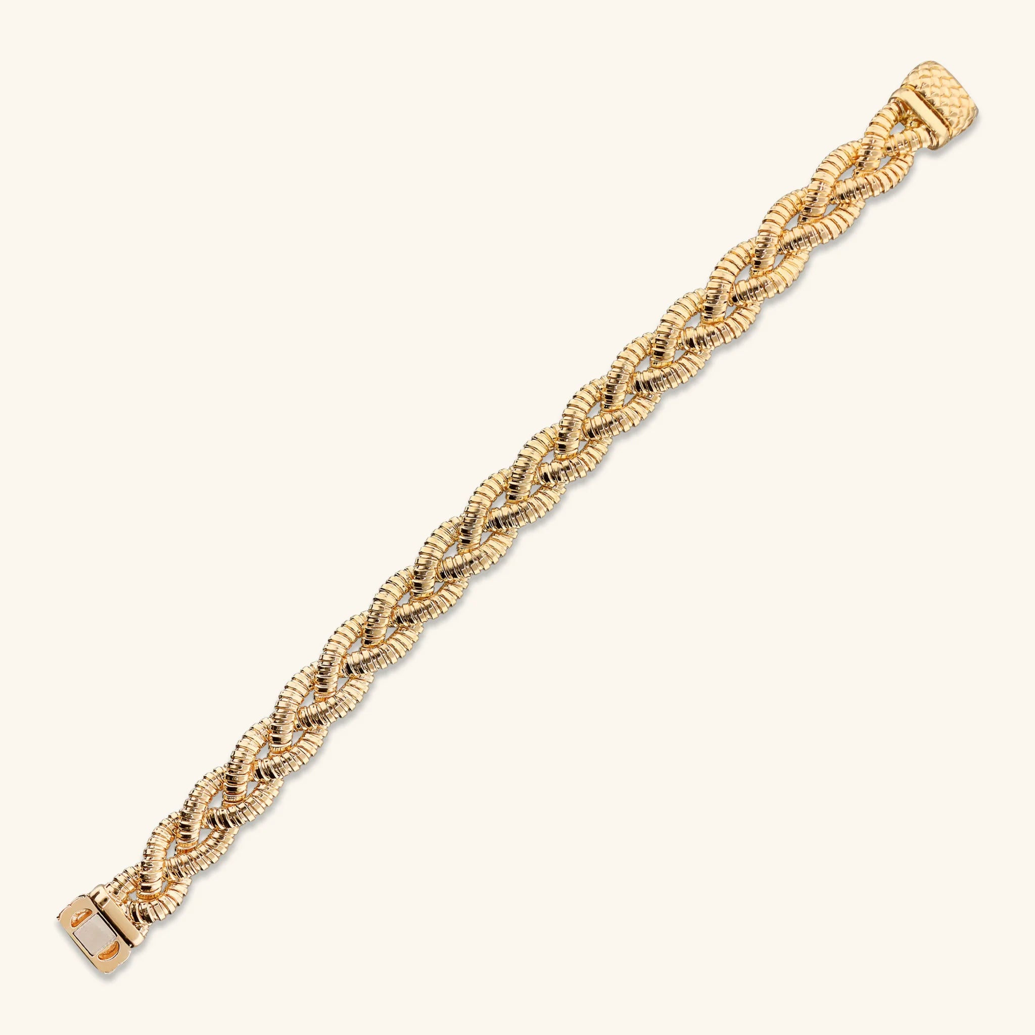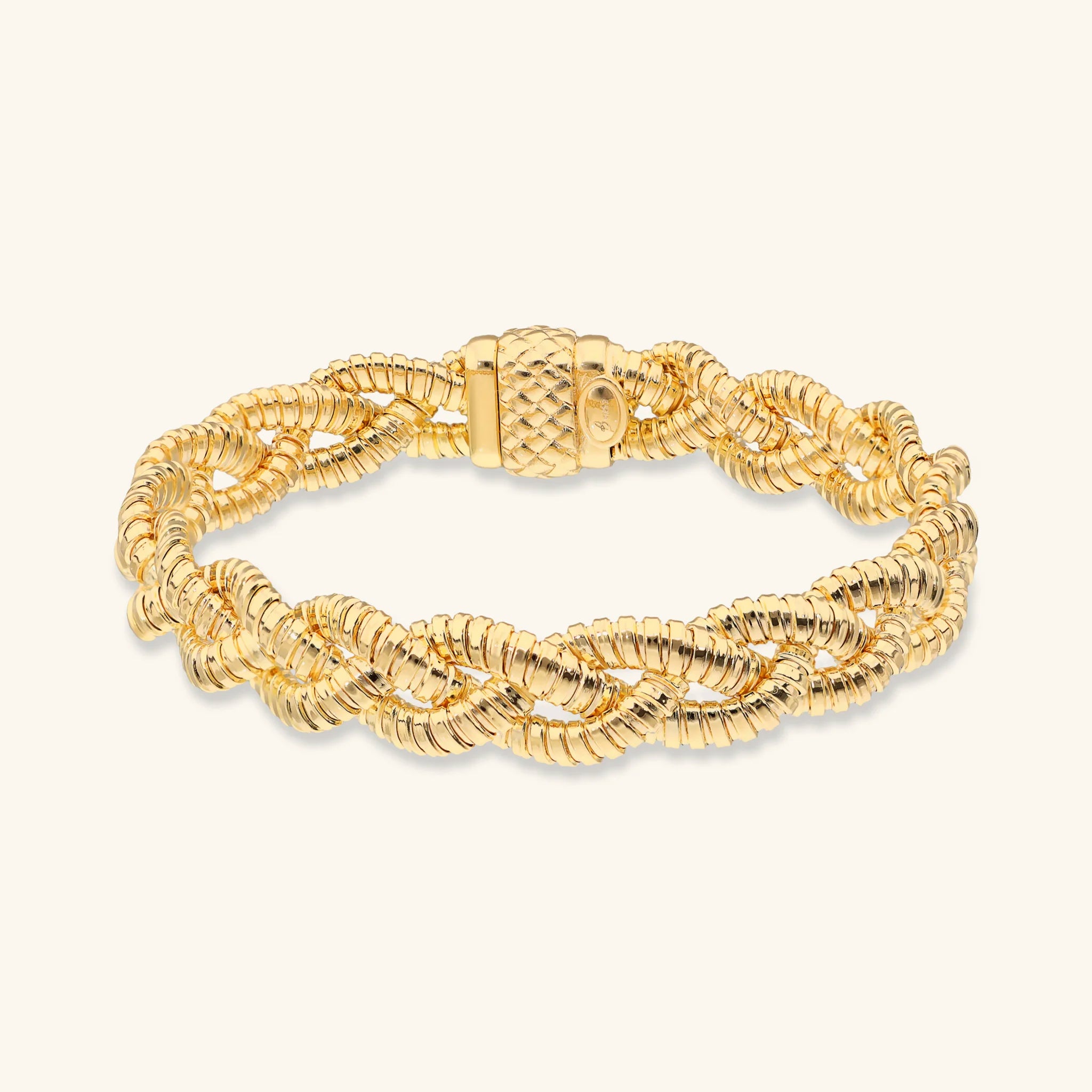 Bracelet Étrusque Joaillerie réalisé en alliage Golden, doré à l'or jaune fin 18ct, avec maille tubogas entrelacée. Longueur 19 cm. Fermeture magnétique.