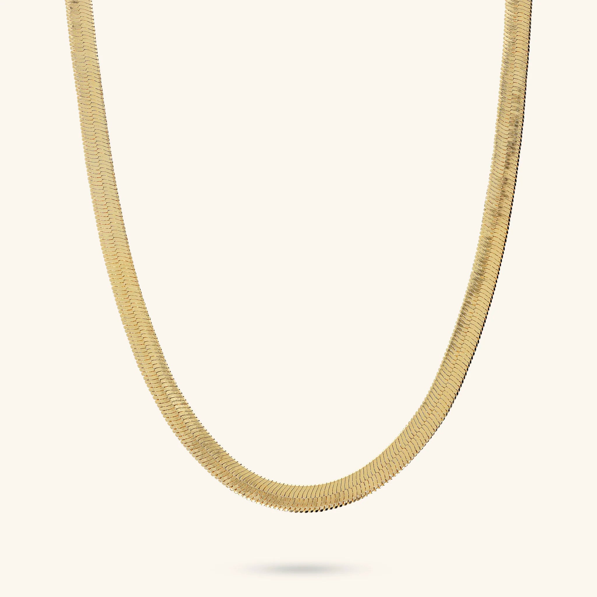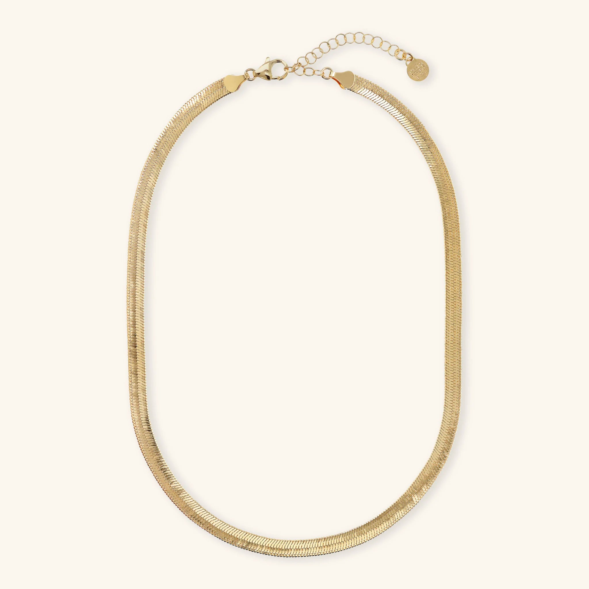 Collier ras du cou en alliage Golden, doré à l'or fin 18ct, avec chaîne serpent plate, effet 'fluide', à surface brillante. Fermoir mousqueton.