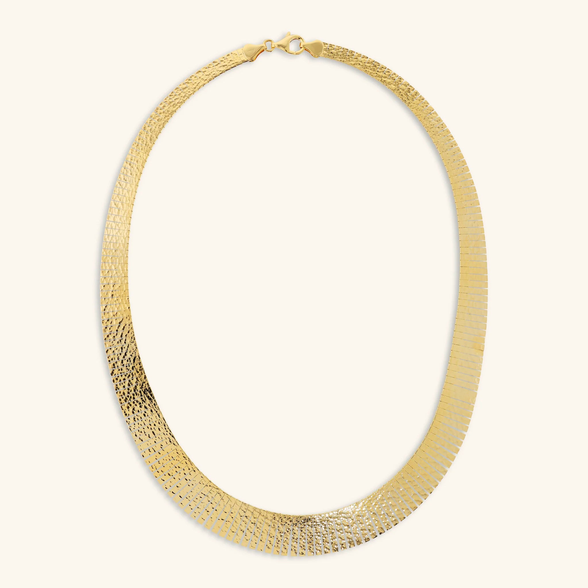 Collier ras du cou Etrusca Gioielli réalisé en alliage Golden, plaqué or jaune 18kt, avec maille Cleopatra. Surface finement martelée de 14 mm de largeur. Fermoir mousqueton.