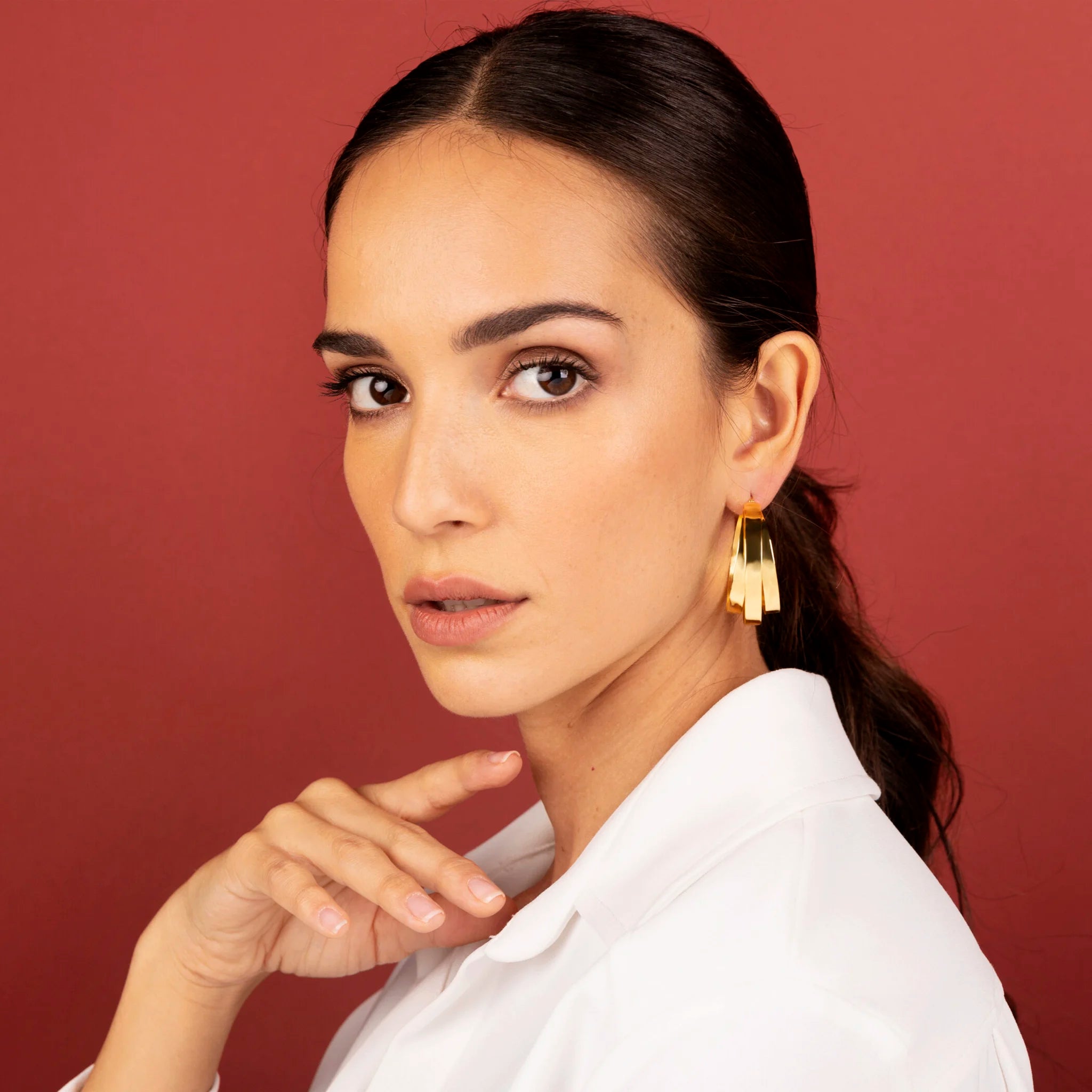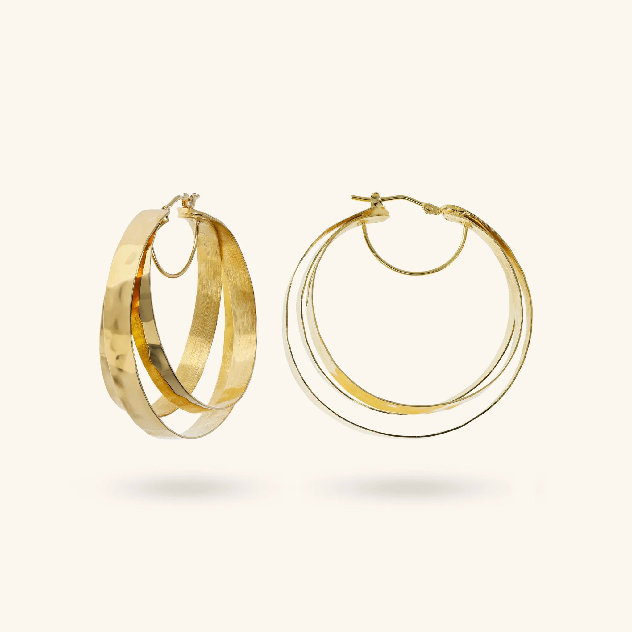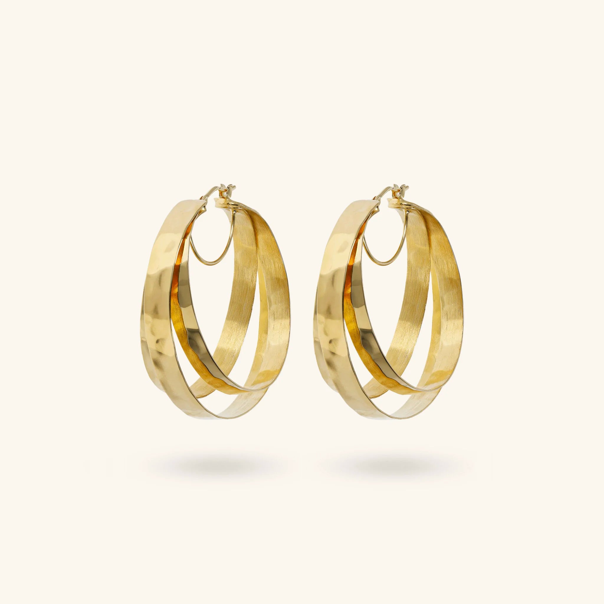 Boucles d'oreilles pendantes multi-cercles Etrusca Gioielli en alliage Golden, doré à l'or fin 18ct, agrémentées de 3 cercles gradués avec surface martelée ; fermoir à baïonnette.