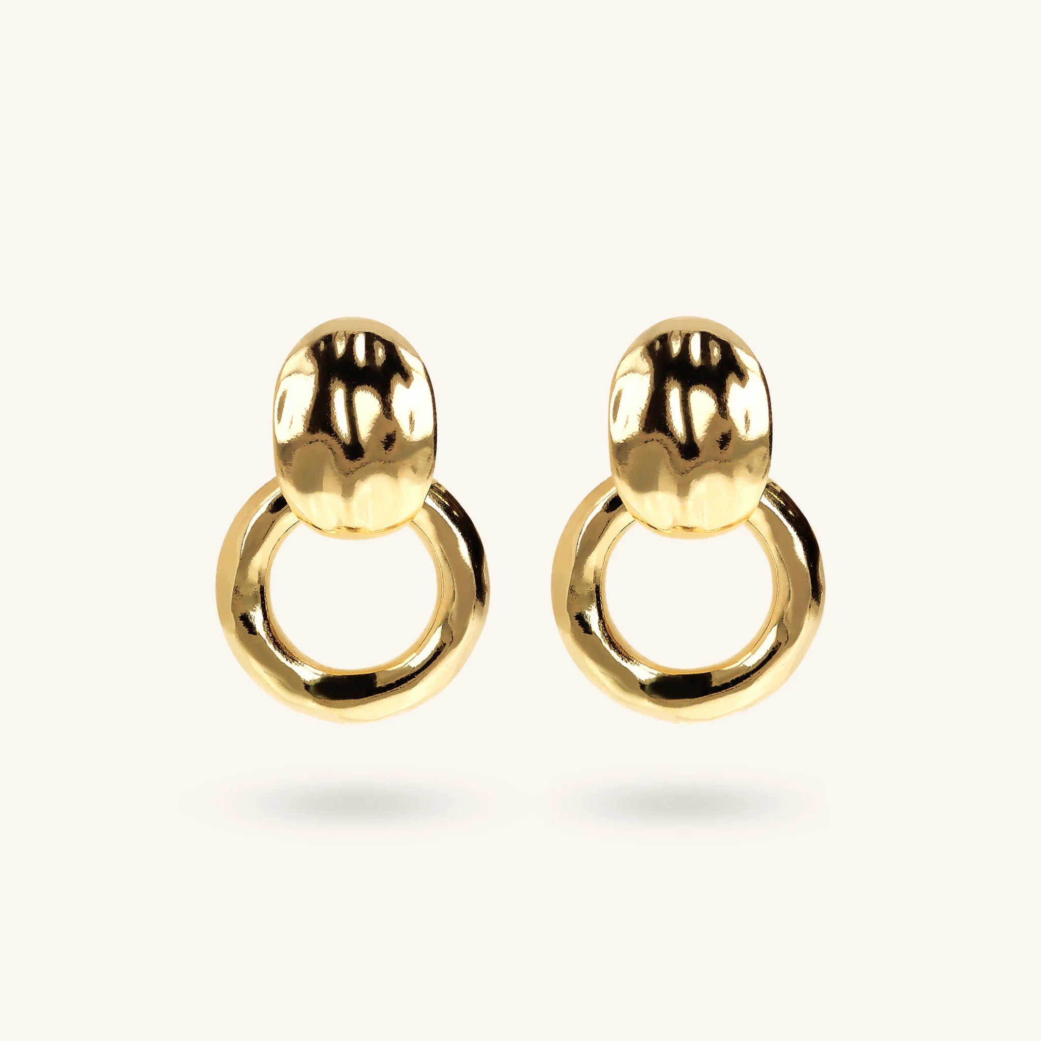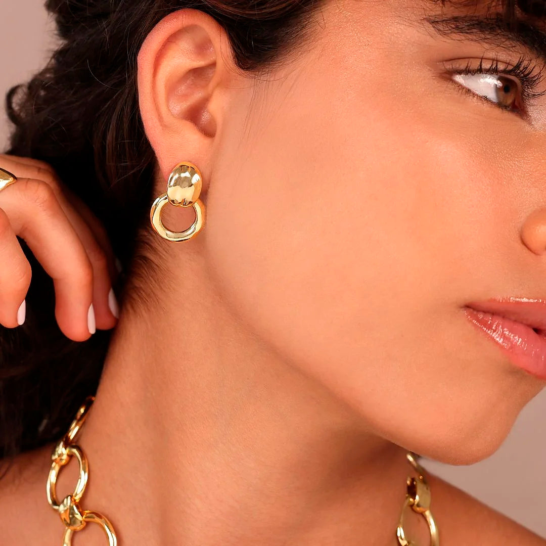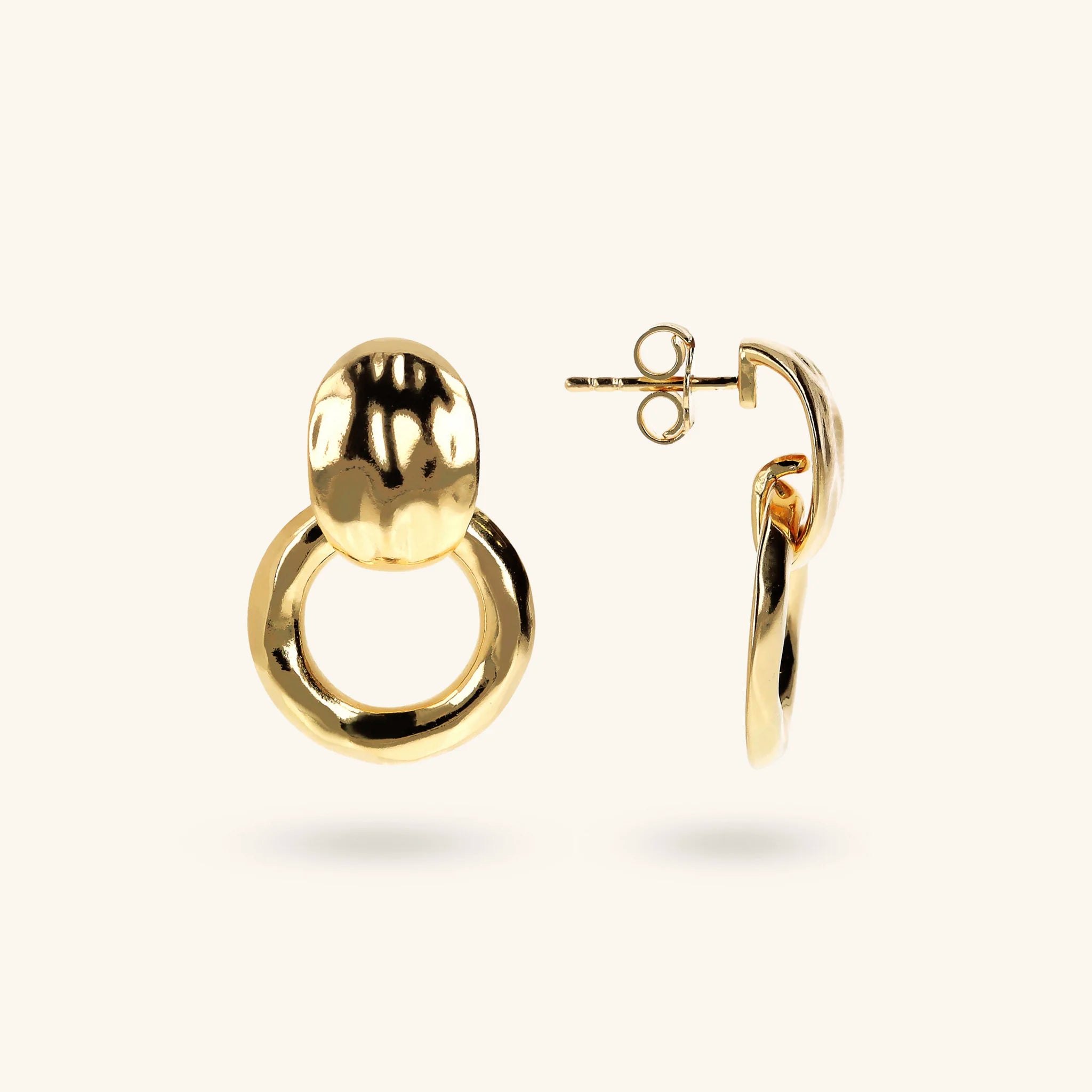 Boucles d'oreilles pendantes Etrusca Gioielli en alliage Golden, doré à l'or jaune fin 18ct, avec contre-maillon pépite plate et anneau (18 mm). Surface martelée. Longueur 2,5 cm. Fermeture épingle et papillon.