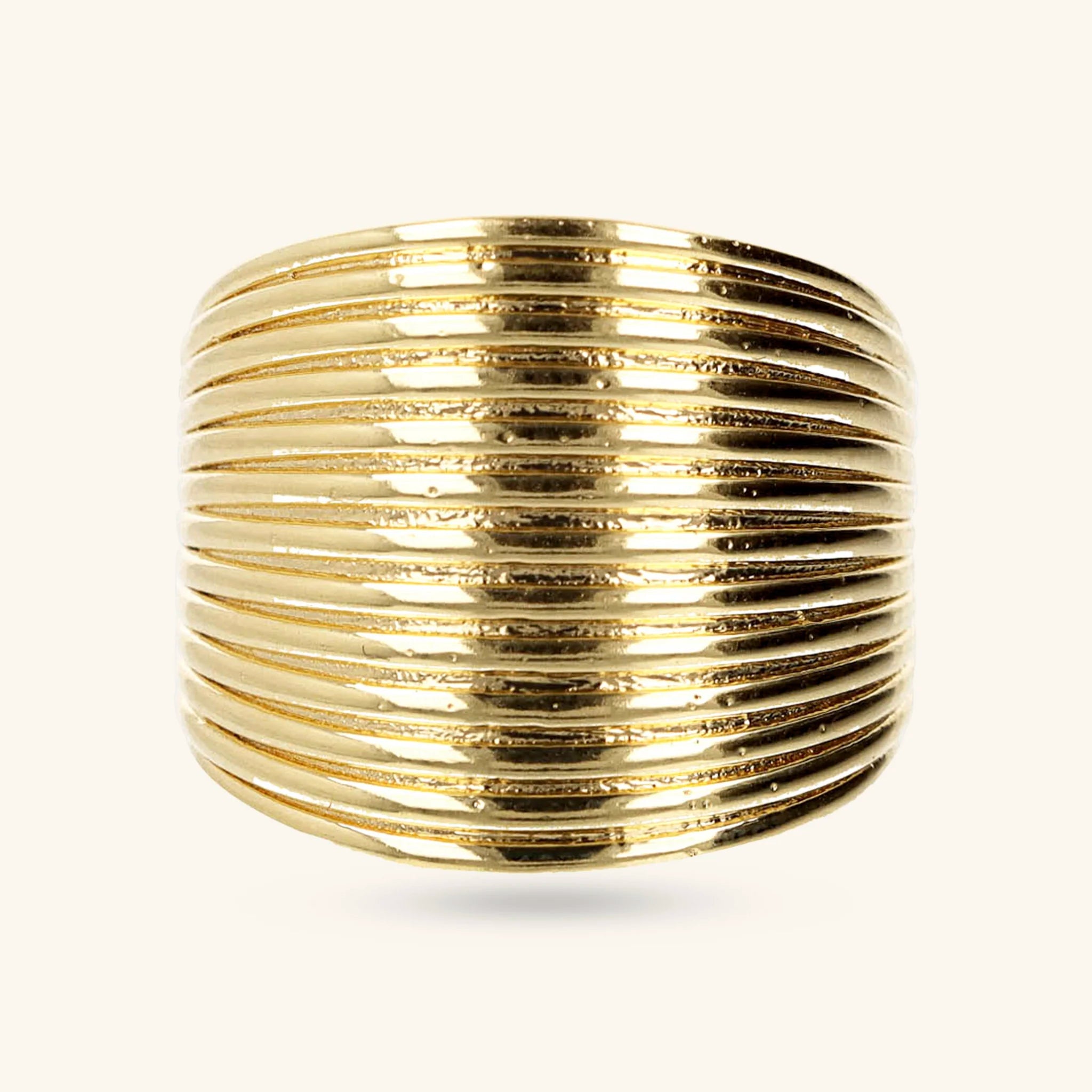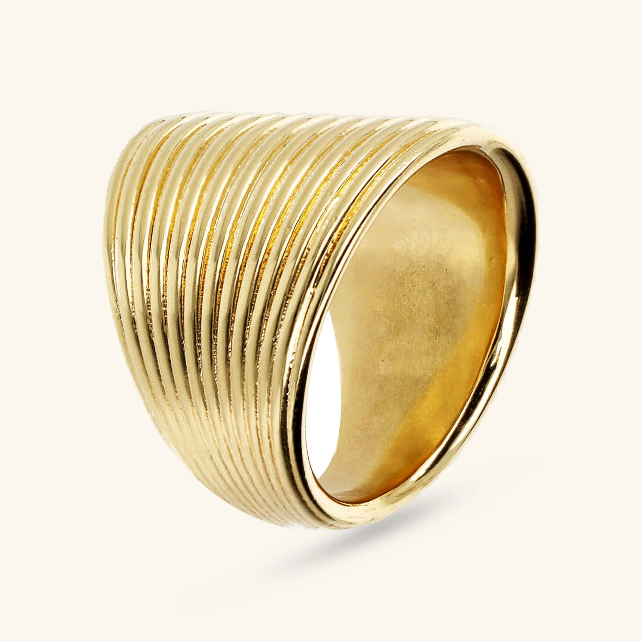 Anello a fascia realizzato in lega Golden, placcata oro giallo 18kt, dal design graduato con superficie rigata.
