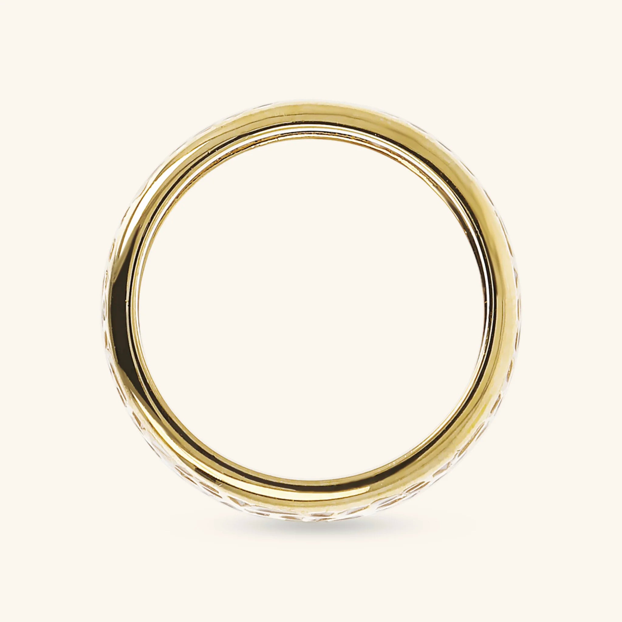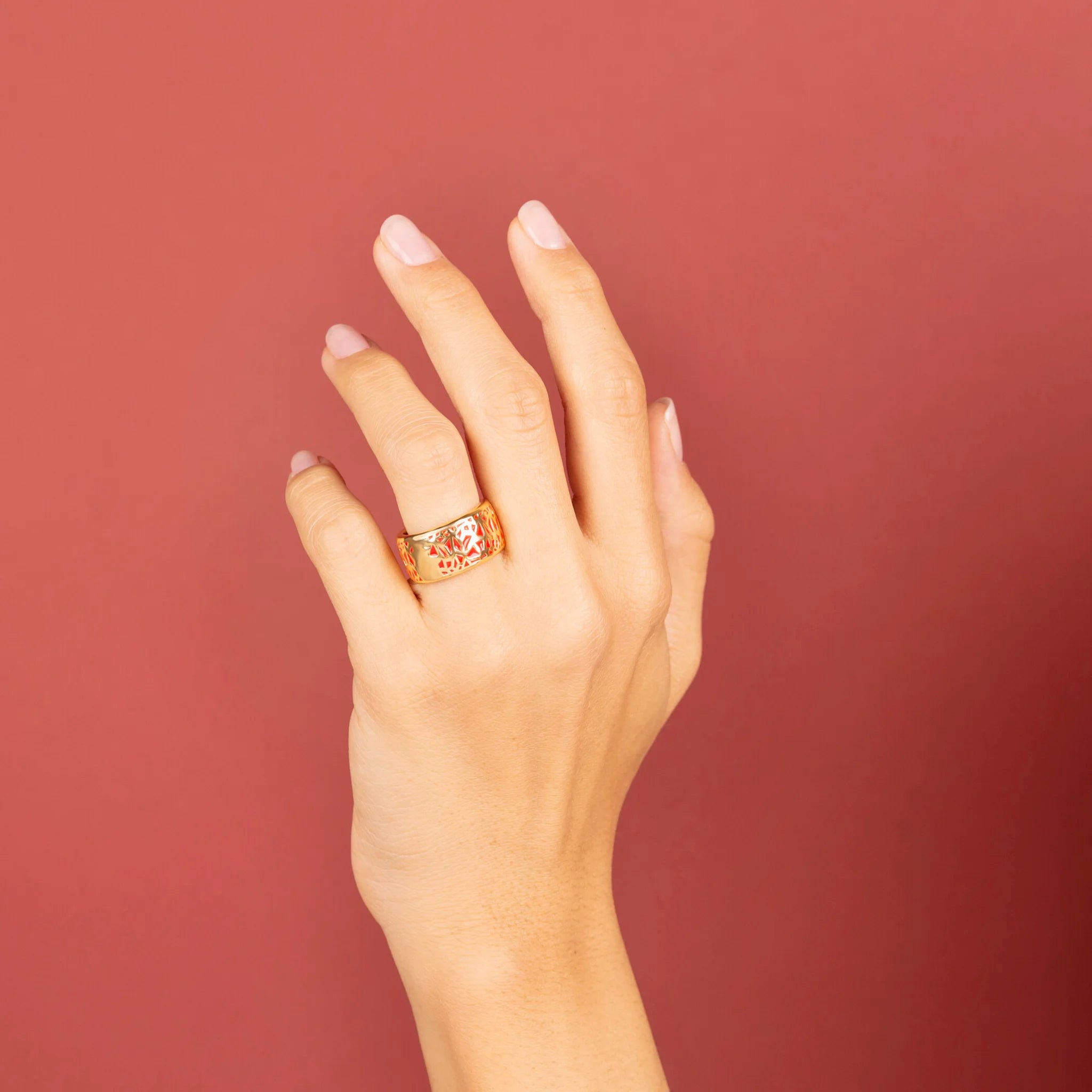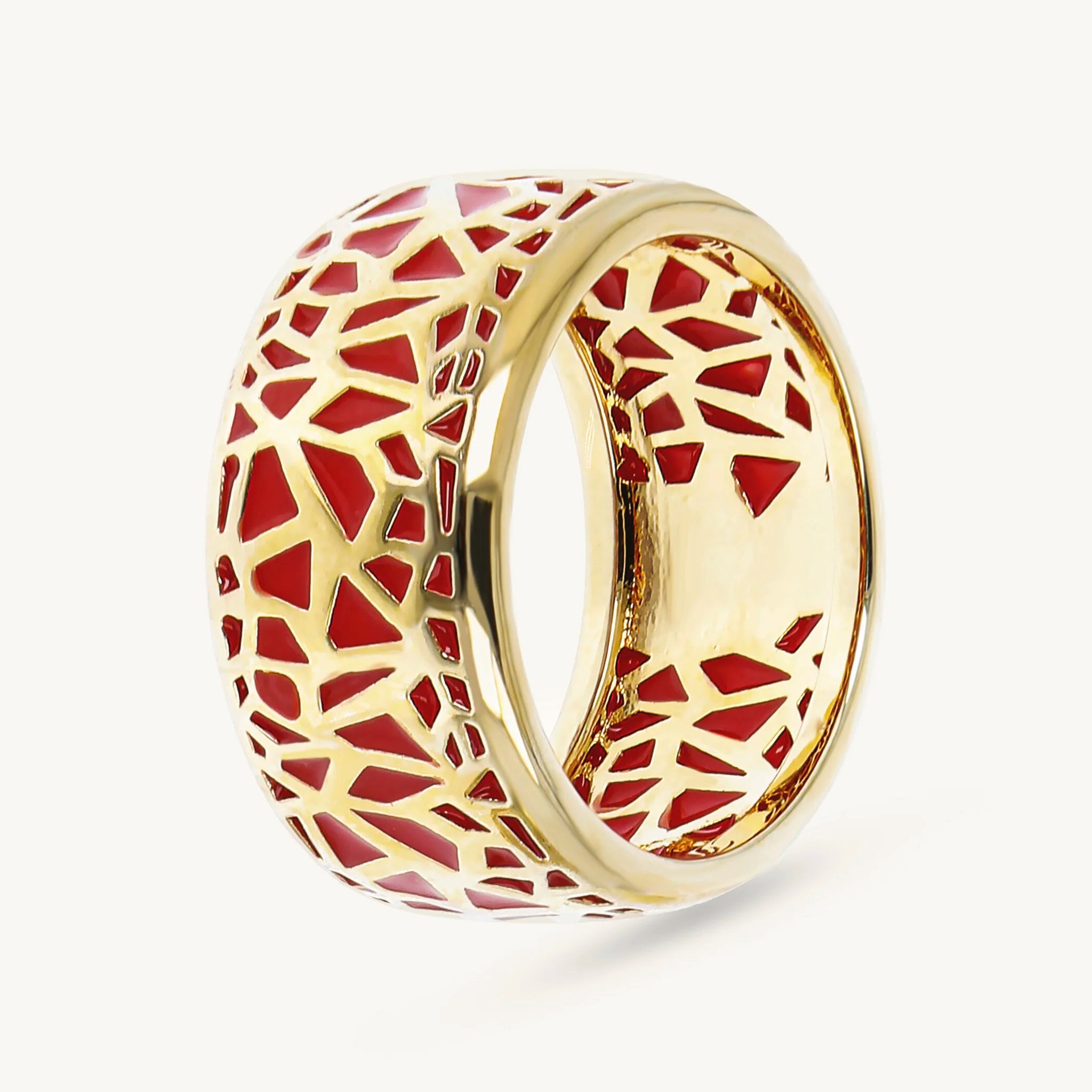 Anello a fascia Etrusca Gioielli realizzato in lega Golden, placcata oro giallo 18kt, dal design traforato con superficie smaltata di colore rosso, bianco o azzurro che richiama la tecnica del mosaico.
