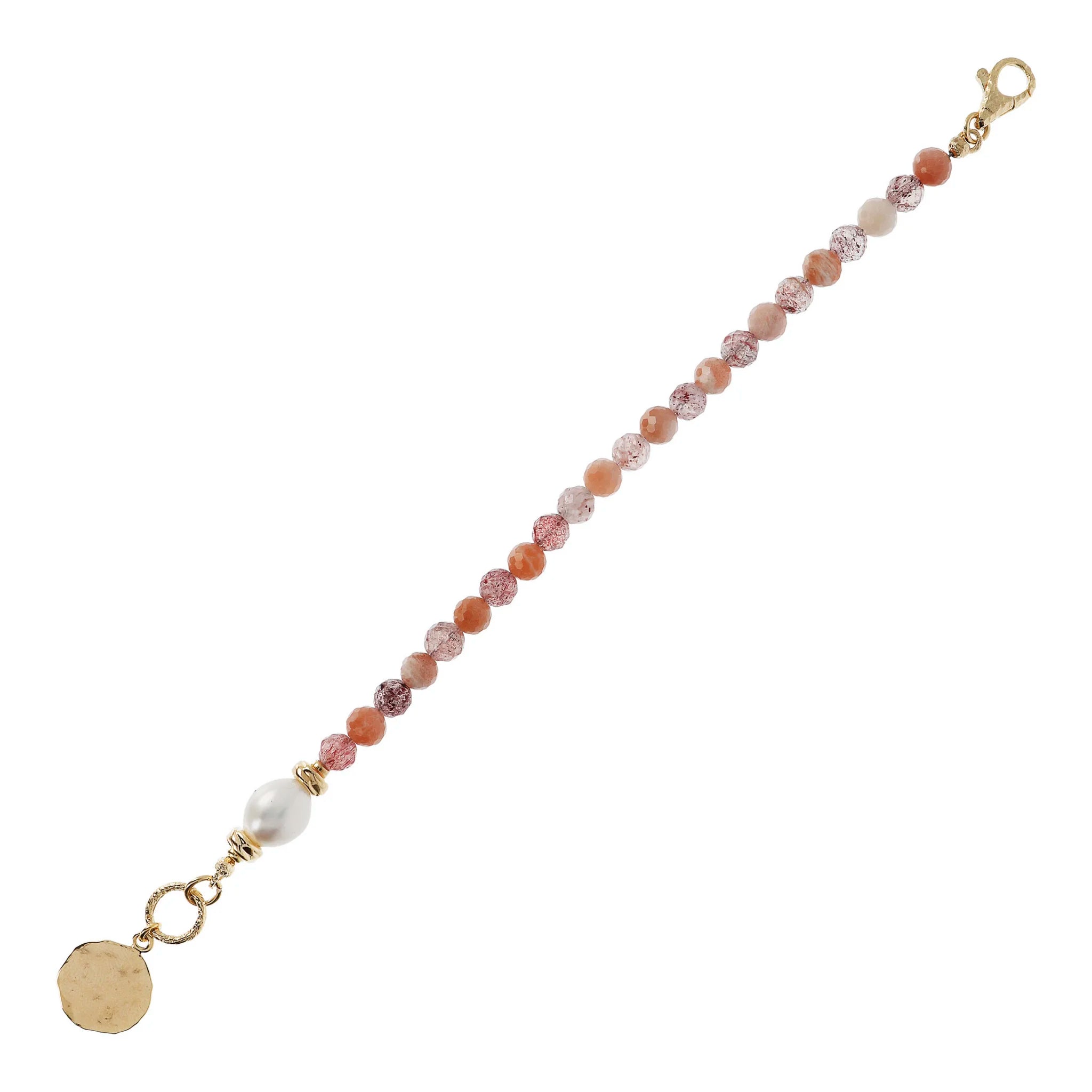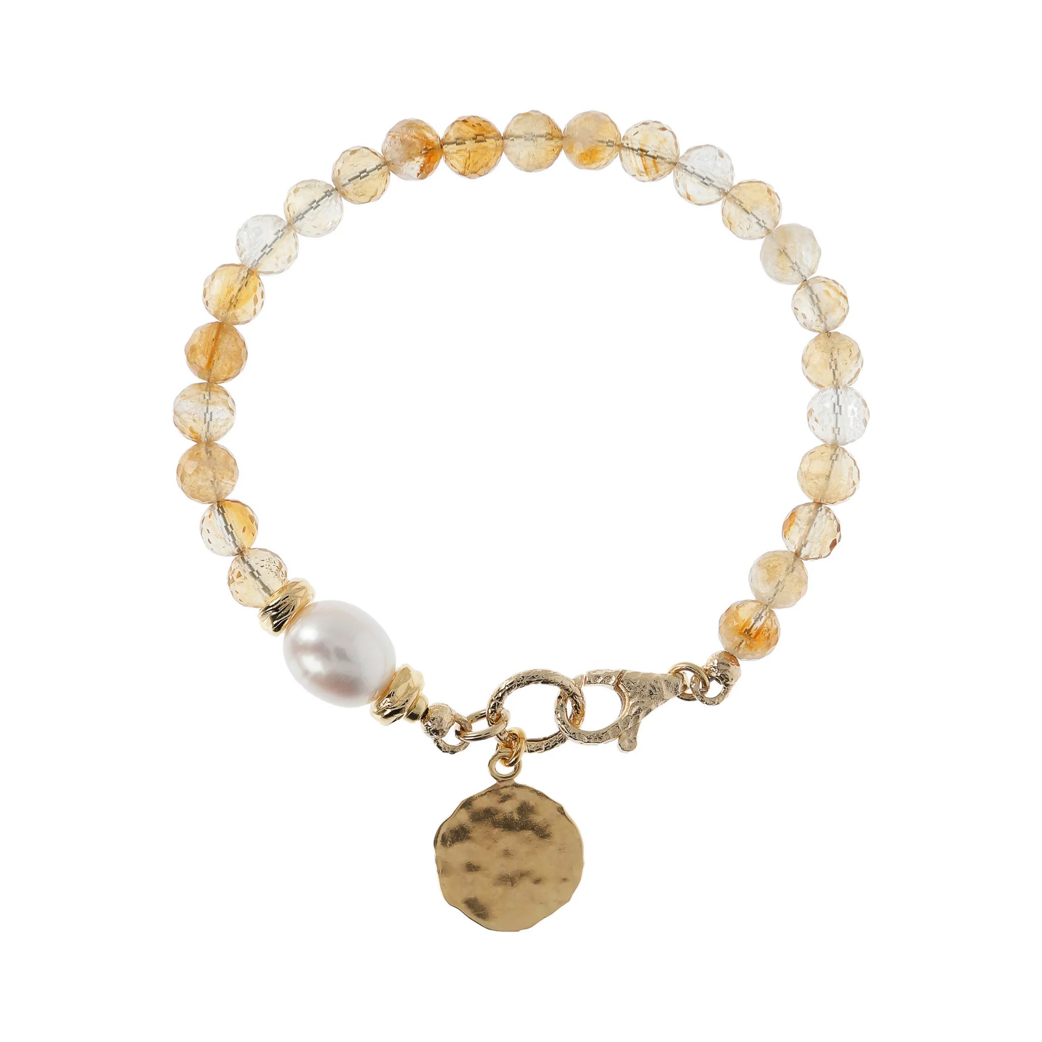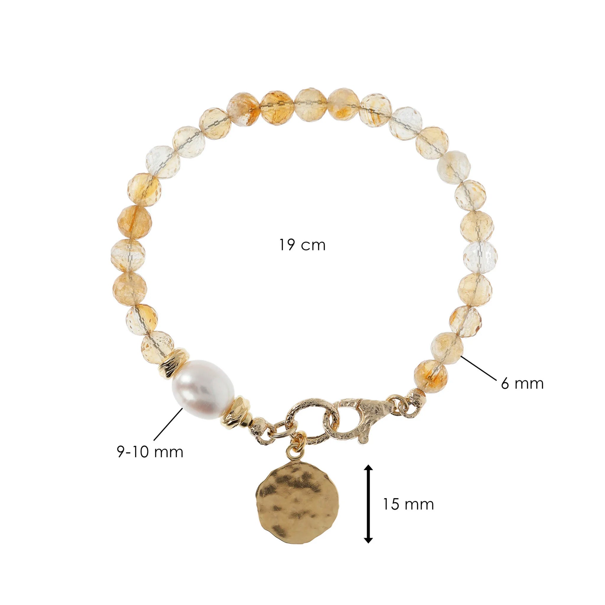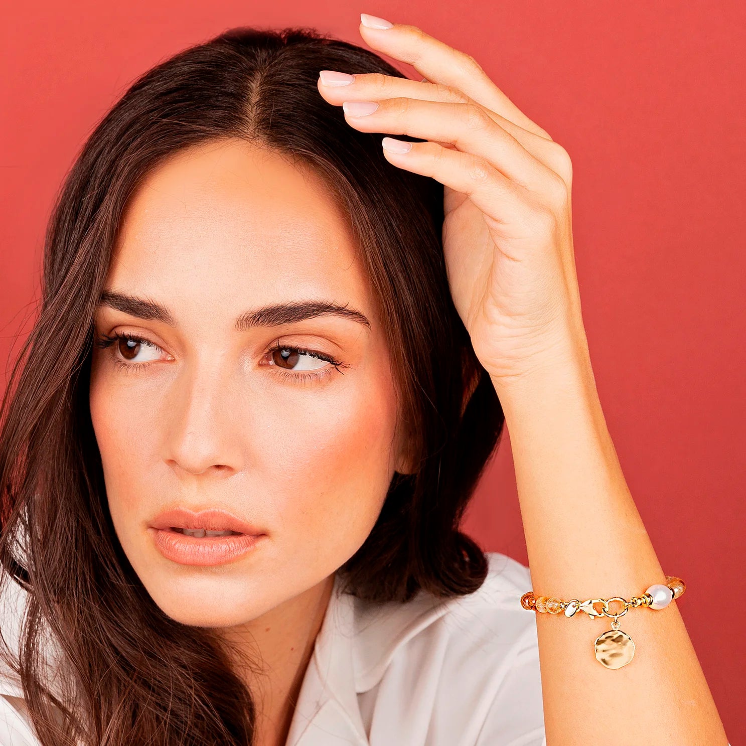 Bracciale Etrusca Gioielli realizzato in lega Golden, placcata oro giallo 18kt, impreziosito da piccole pietre naturali sfaccettate (6 mm) e da una perla Barocca coltivata d'acqua dolce di colore bianco con diametro di circa 9-10 mm. L'anello della chiusura del bracciale a moschettone presenta un pendente a forma di disco (15 mm) con superficie martellata.