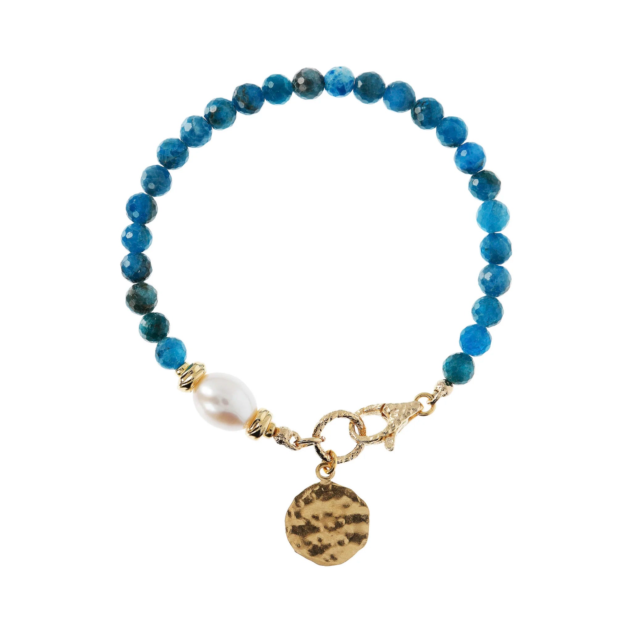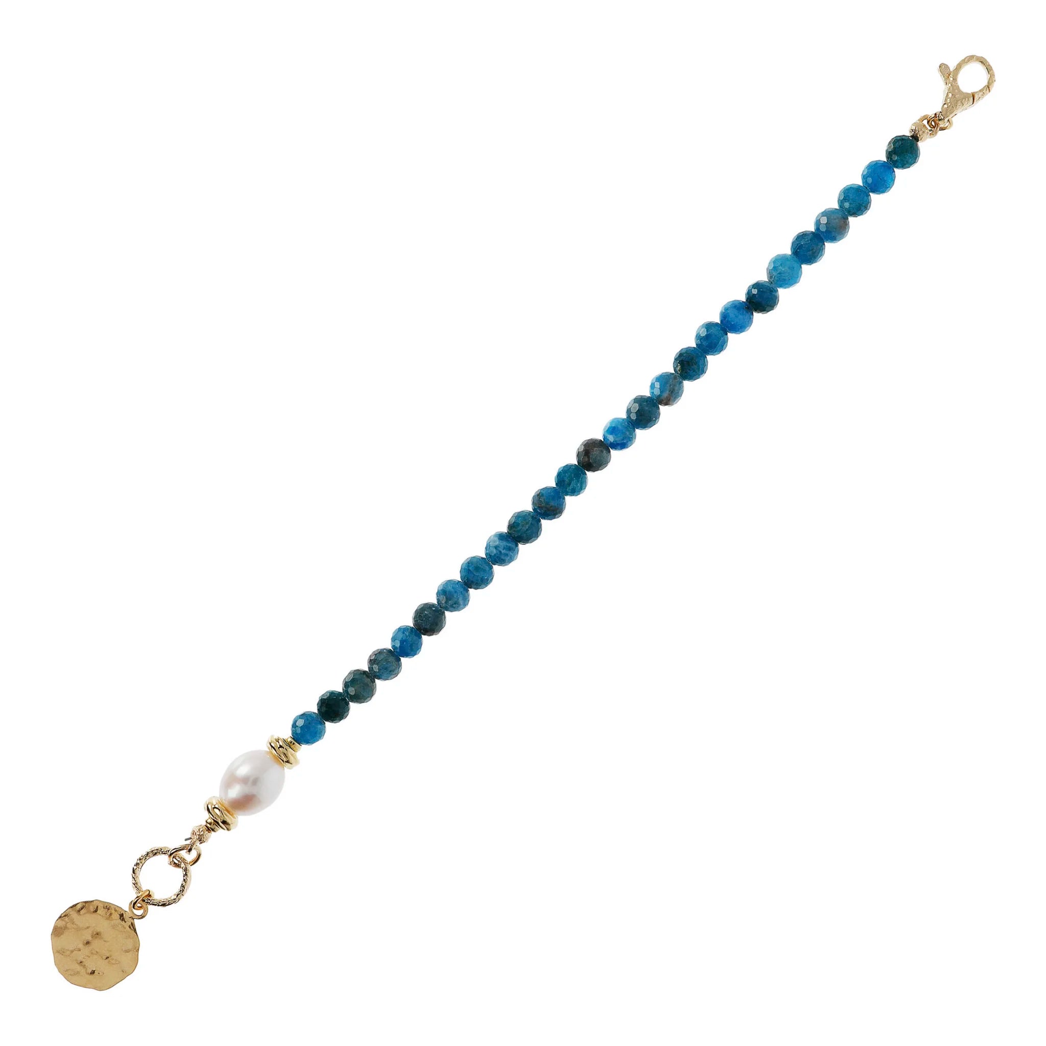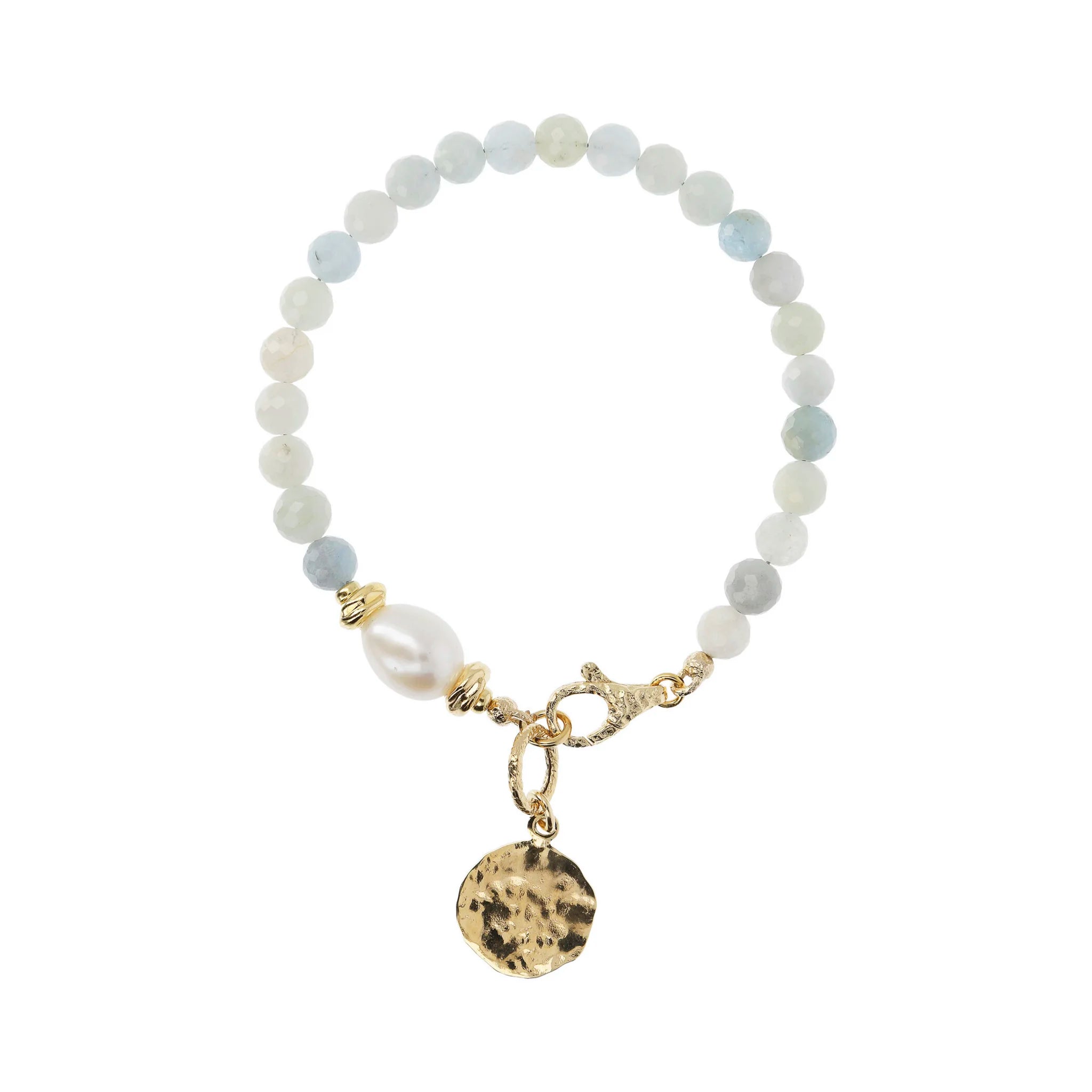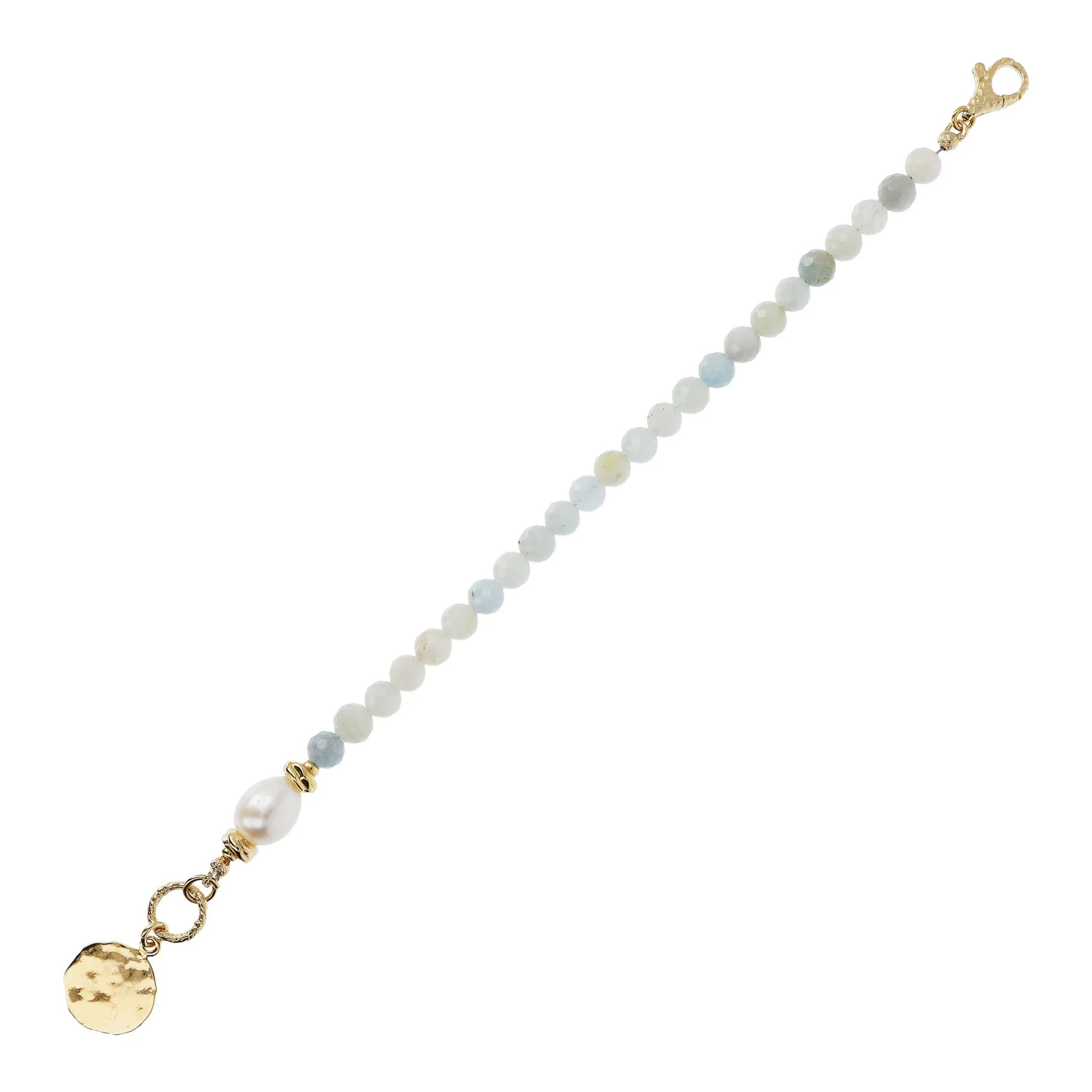 Bracciale Etrusca Gioielli realizzato in lega Golden, placcata oro giallo 18kt, impreziosito da piccole pietre naturali sfaccettate (6 mm) e da una perla Barocca coltivata d'acqua dolce di colore bianco con diametro di circa 9-10 mm. L'anello della chiusura del bracciale a moschettone presenta un pendente a forma di disco (15 mm) con superficie martellata.