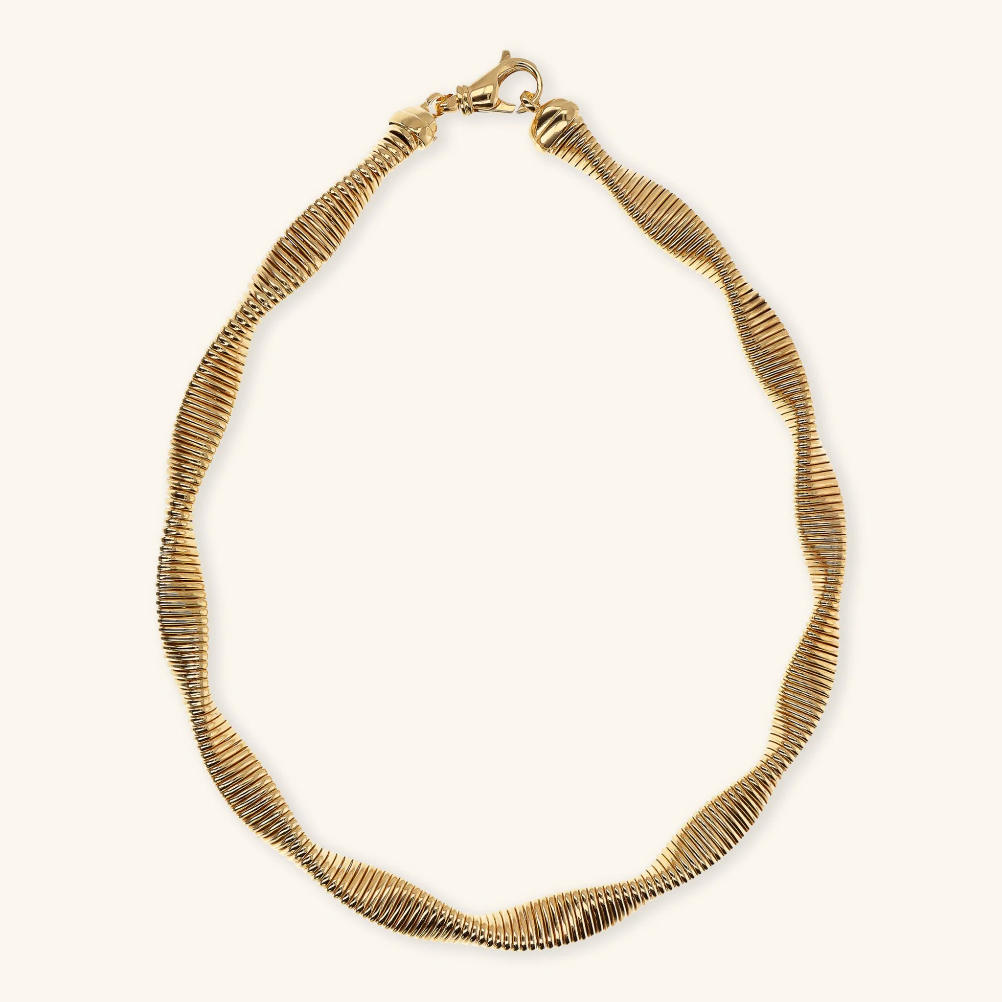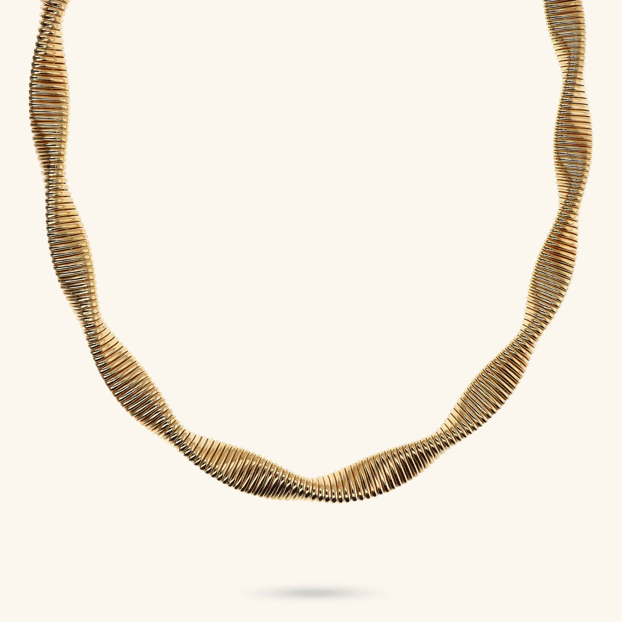 Collana girocollo tubogas Etrusca Gioielli realizzata in lega Golden, placcata Oro giallo 18kt, dal design ritorto. Lunghezza 45 cm. Chiusura a moschettone.
