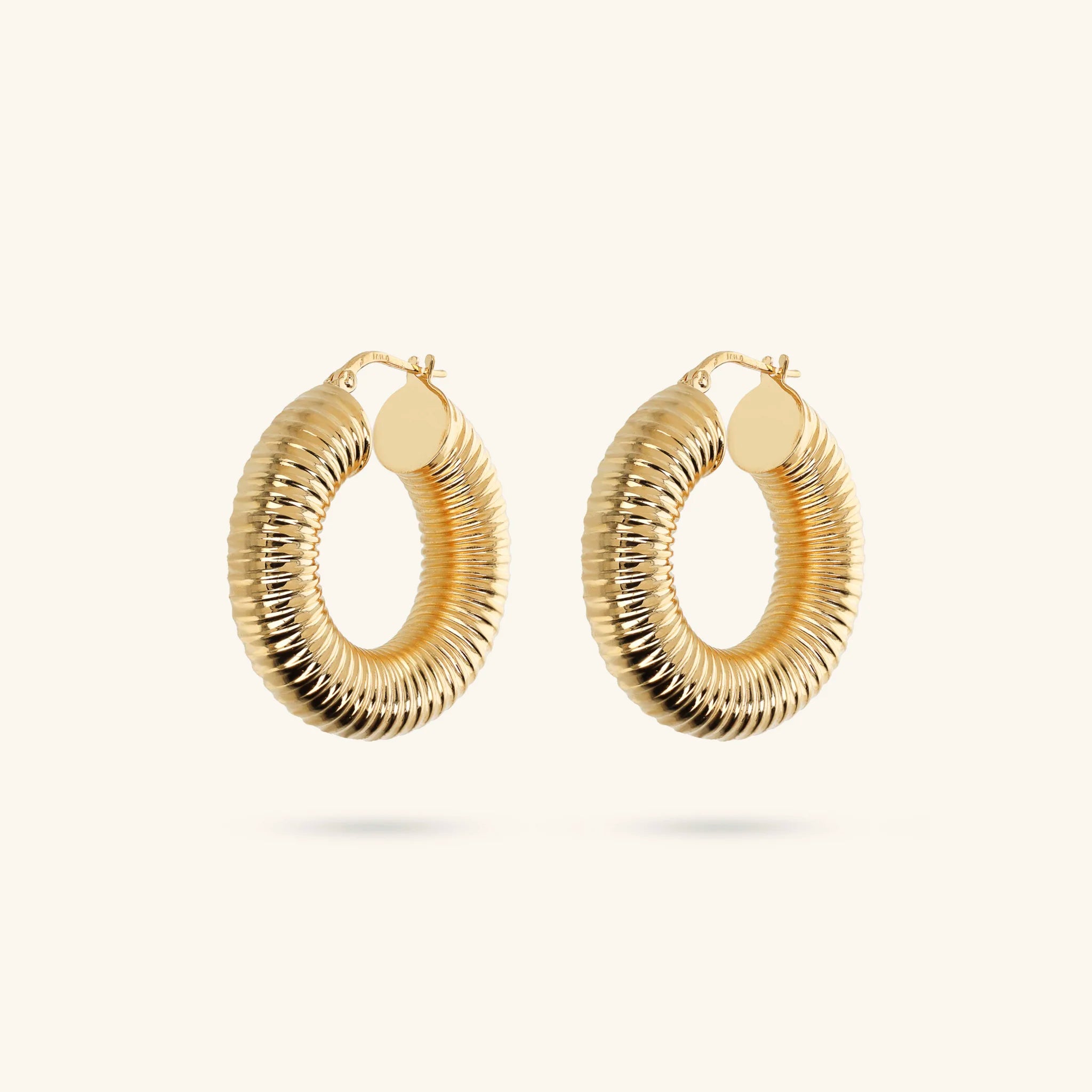 Orecchini a cerchio tubogas in lega Golden placcata Oro giallo 18kt. Spessore 8 mm. Diametro esterno 30 mm. Chiusura a baionetta.