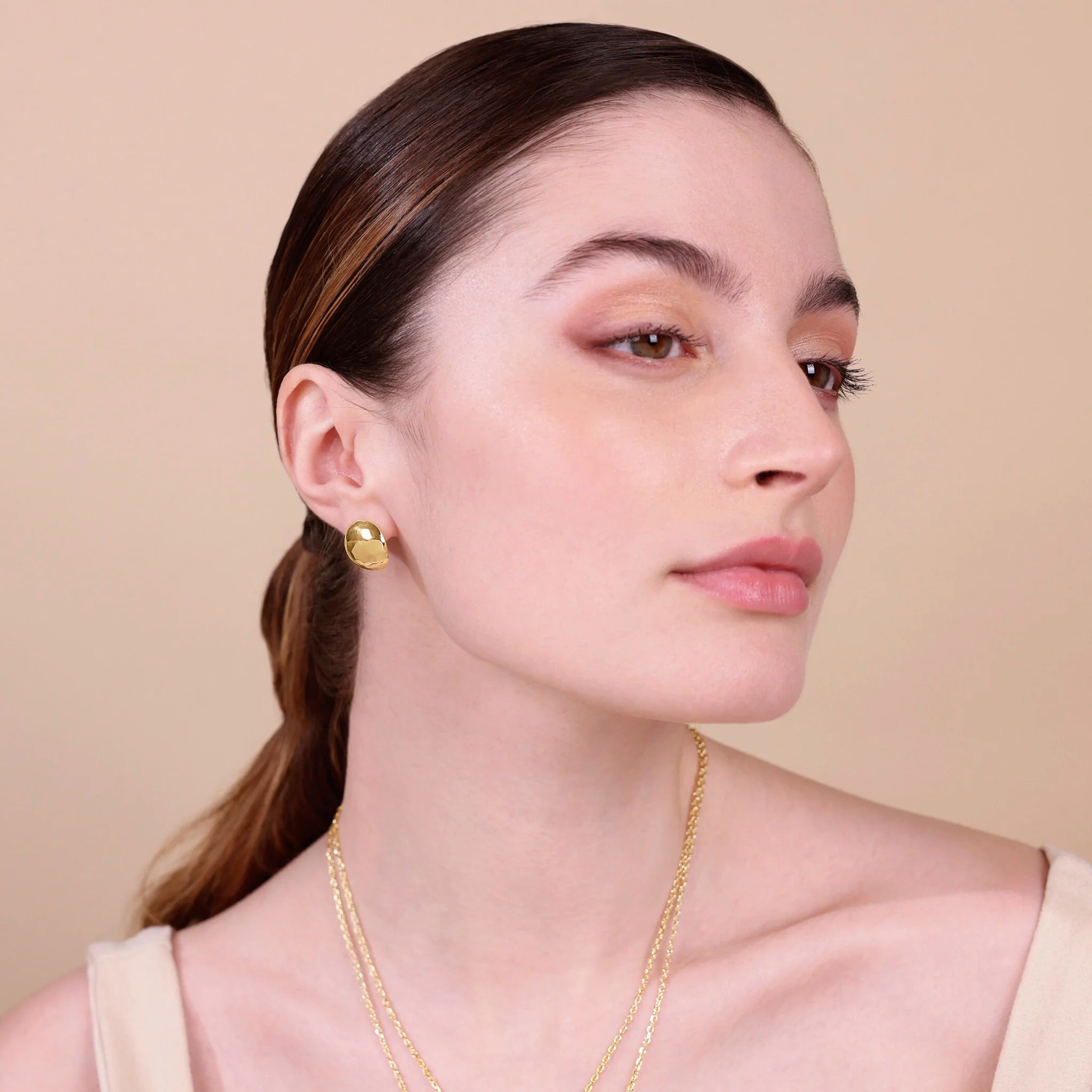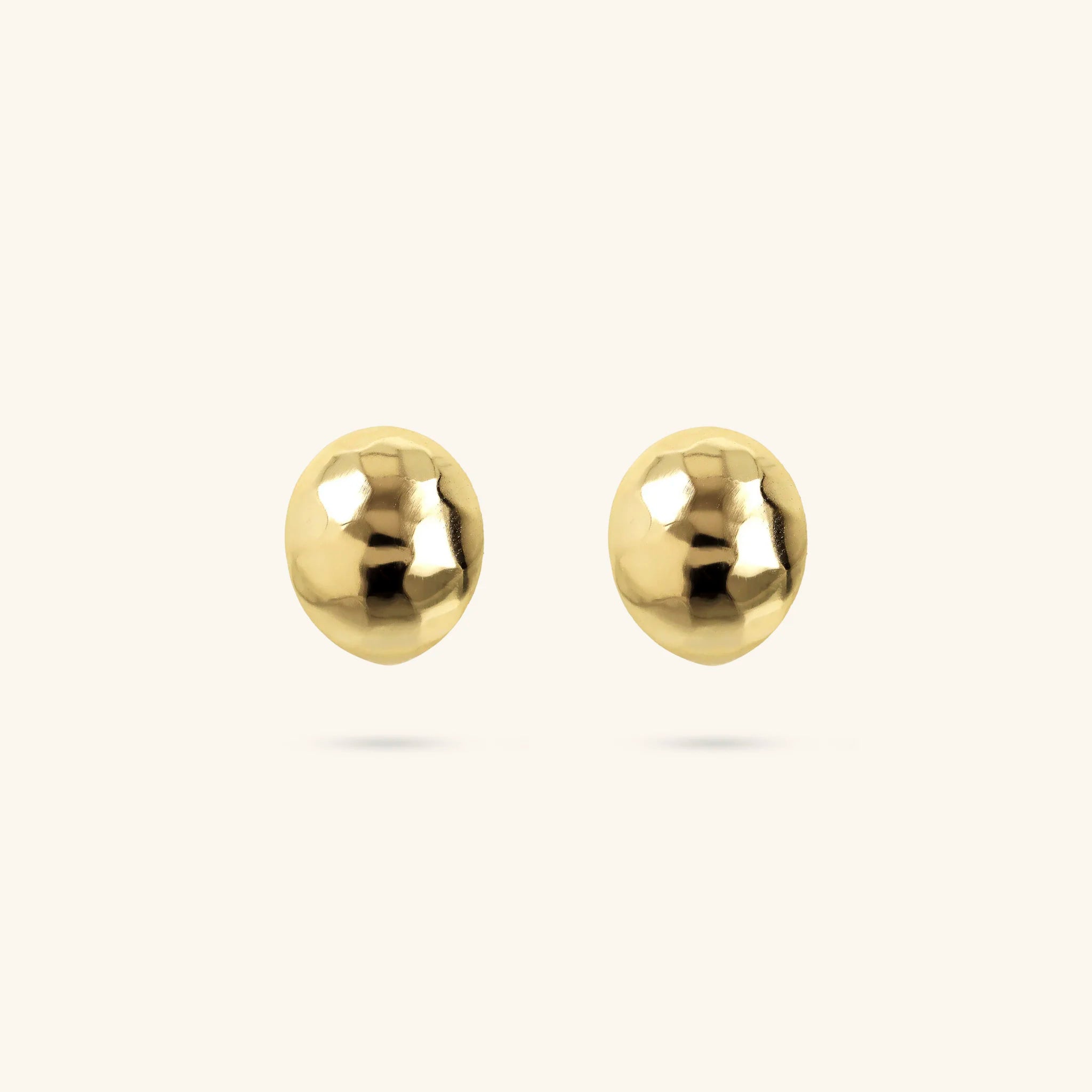 Orecchini a lobo realizzati in lega Golden, placcata oro giallo 18kt, dal design a goccia con superficie martellata. Chiusura a perno e farfalla.